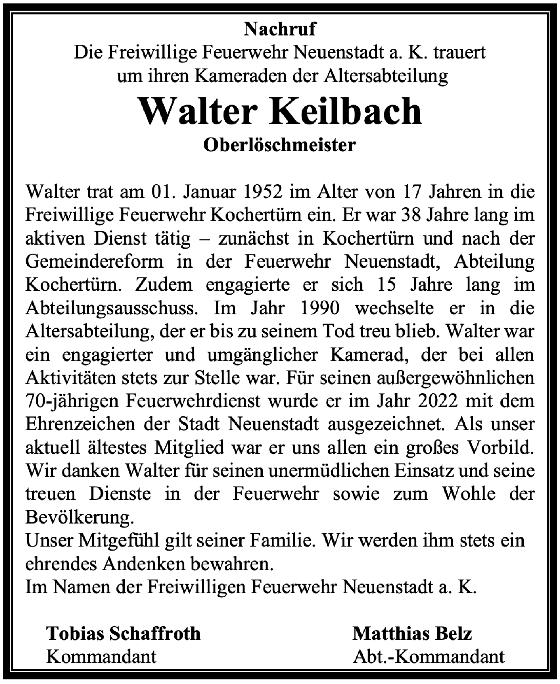 Liebe Besucherinnen und Besucher, im Namen aller Kameradinnen und Kameraden der Freiwilligen Feuerwehr Neuenstadt a. K. begrüße ich Sie herzlich auf unserer neuen Homepage. Wir sind eine Gemeinschaft, die sich mit Leidenschaft und Engagement für die Sicherheit unserer Mitmenschen einsetzt. Egal ob Brände, Unfälle oder andere Notfälle – wir sind für Sie da. Möchten Sie mehr über uns erfahren oder sogar Teil unseres Teams werden? Dann stöbern Sie auf unserer Seite und nehmen Sie Kontakt mit uns auf!