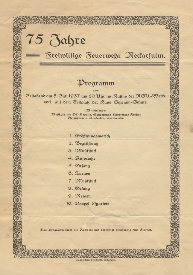 1937 erhält Paul Retter vom Bürgermeister die Genehmigung sein Amt als Führer der hiesigen Feuerwehr niederzulegen. Er schlägt als seinen Nachfolger Albert Trefz vor. Ein Wiederspruch erfolgt nicht. Am 4. Juli besuchen 29 Mann – wie befohlen- das Kreisfeuerwehrfest in Neckarsulm.