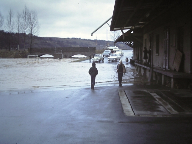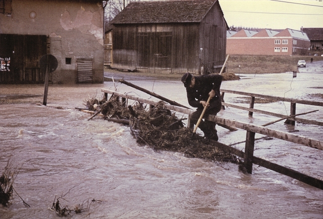 Immer wieder Hochwasser in Neuenstadt. Holzbrücke am Stadtpark 1970, Gebäude der Fa. Sautter und ABN. Hinten das LF 15 der Werkfeuerwehr Sautter aus Markgröningen.