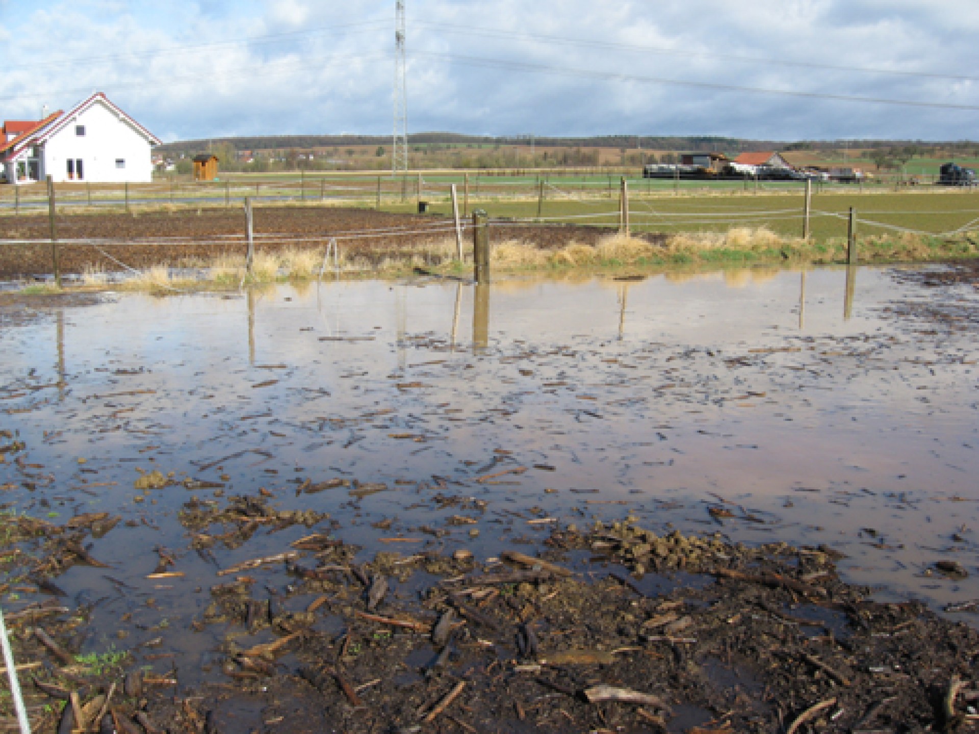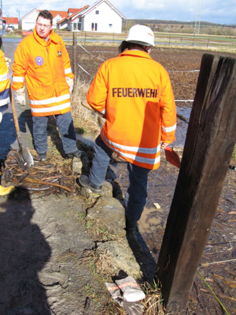 Der Orkan \“Emma\” brachte viel Hagel und Niederschlag mit sich, deshalb waren sämtliche Bäche und Flüsse schnellstens überfüllt. Auch ansammelndes Wasser auf an Berghängen und auf Äckern staute sich an, bis es sich plötzlich über diverse Wege und über das freie Gelände seinen Weg ins Tal bahnte. Hierbei wurden ein Keller, Feldwege sowie eine Pferdekoppel überflutet. Die Feuerwehr war mit allen Abteilungen im Einsatz.