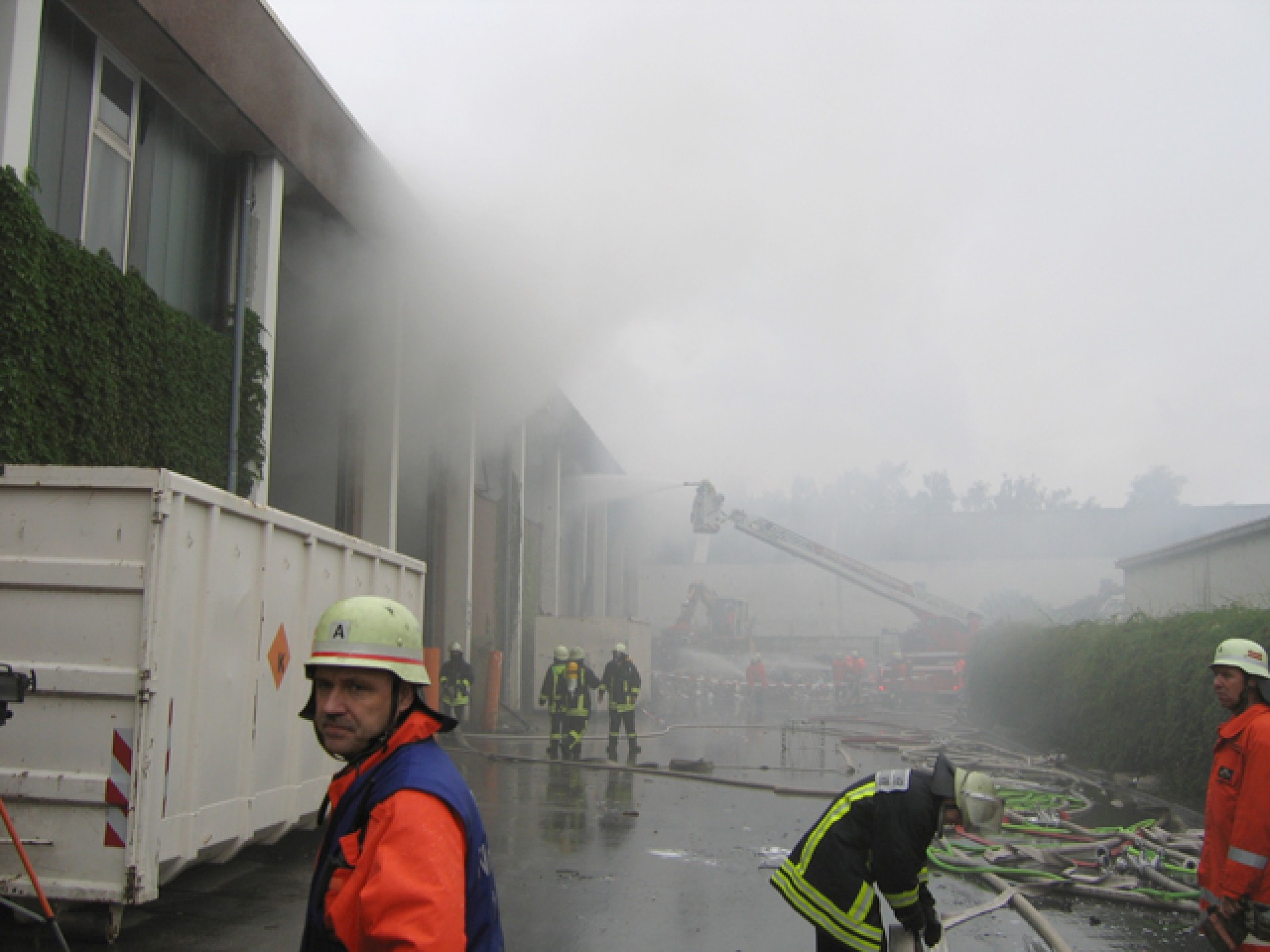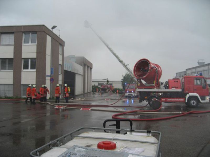 Kurz darauf kam es zu einer Durchzündung als ein Teil des Daches einstürzte. In den folgenden Minuten wurden ständig weitere Kräfte mit diversen Lösch- und Sonderfahrzeugen nachalarmiert. Eine Übersicht aller eingesetzten Fahrzeuge befindet sich am Ende des Berichts.