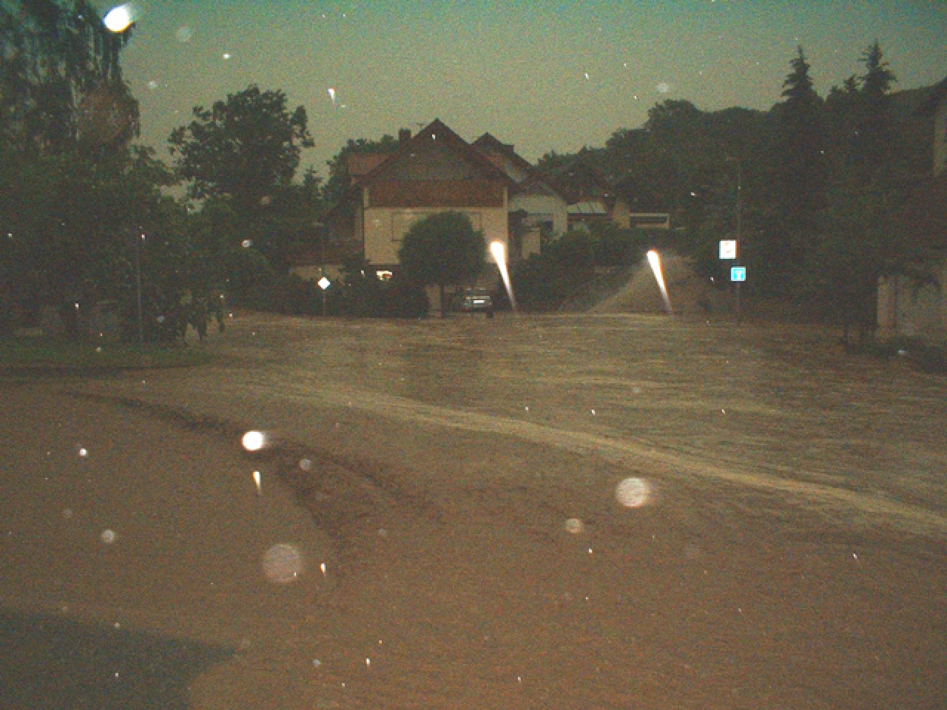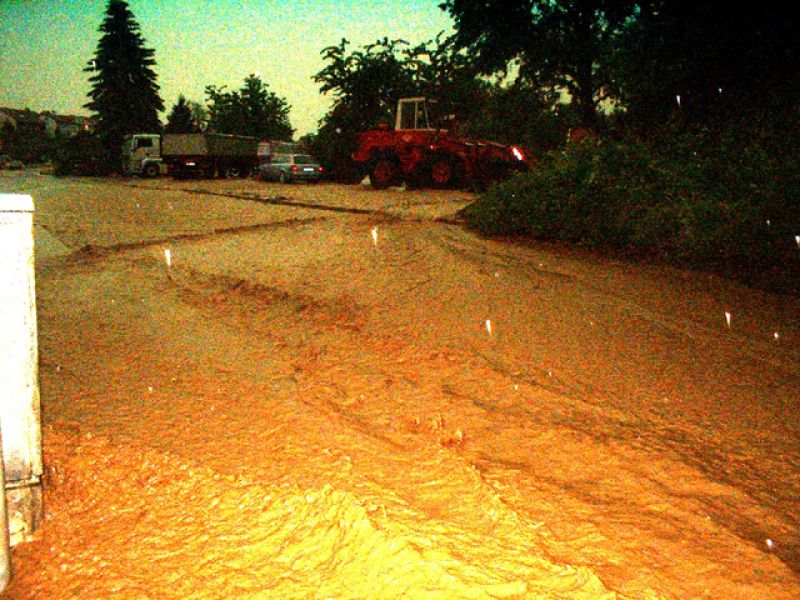 Durch starke Regenfälle während einem Gewitter fielen innerhalb kurzer Zeit große Mengen Wasser nieder. Das Wasser schoss über Äcker und Felder in Wohngebiete und füllte diverse Keller und Garagen. Auch ein Dach wurde aufgrund von starkem Hagel eingeschlagen. Die Feuerwehr erstellte eine Notüberdachung und pumpte die überfluteten Gebäudeteile bestmöglich leer. Die Einsatzdauer zog sich von Freitag Abend ab 18:00 Uhr bis Samstag Morgen um 4:00 Uhr, wobei die vorübergehende Ruhe nicht lange anhielt: Schon morgens um 9:00 musste die Feuerwehr erneut zu Überschwemmungen ausrücken.