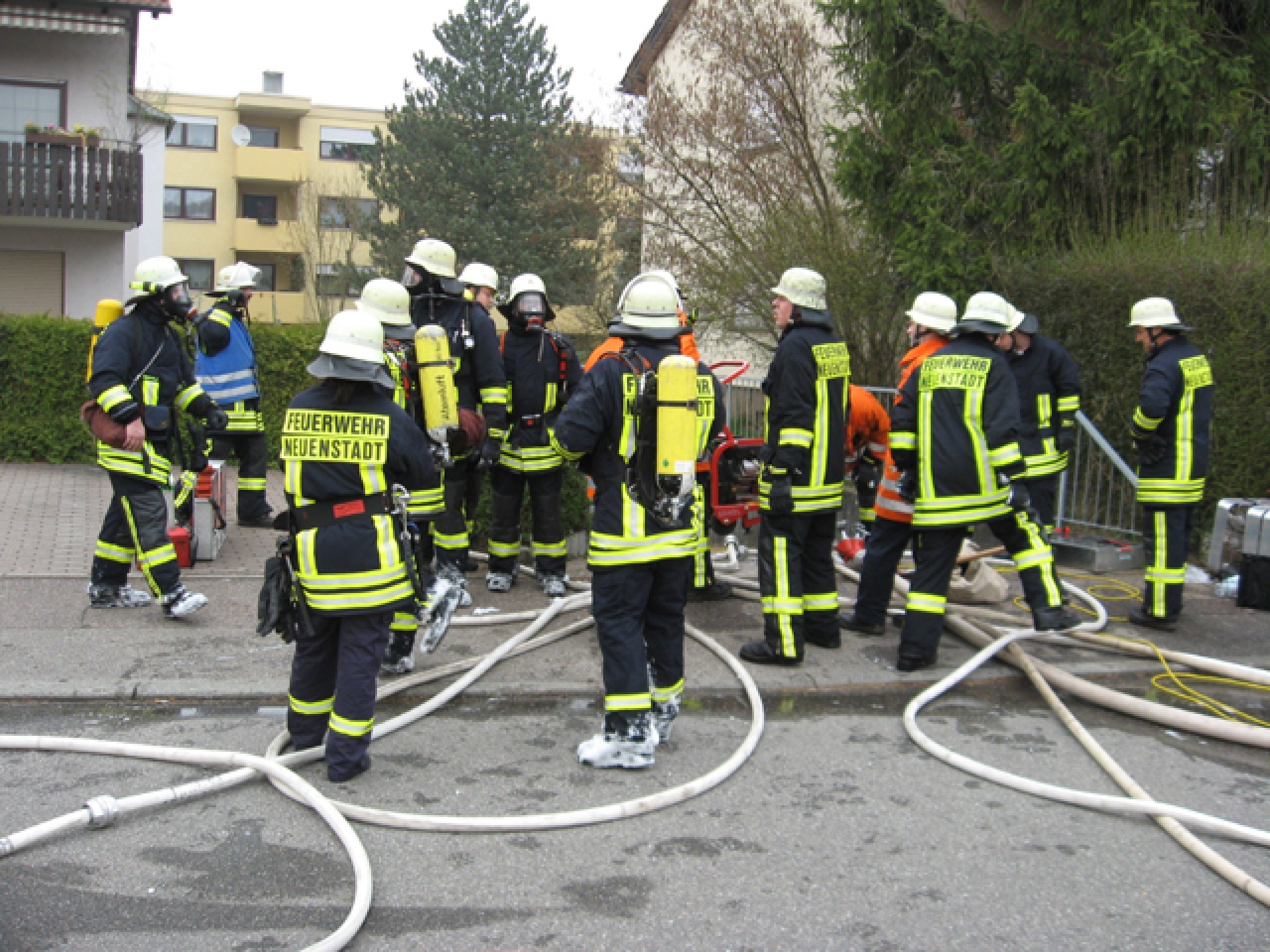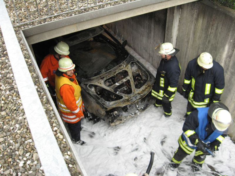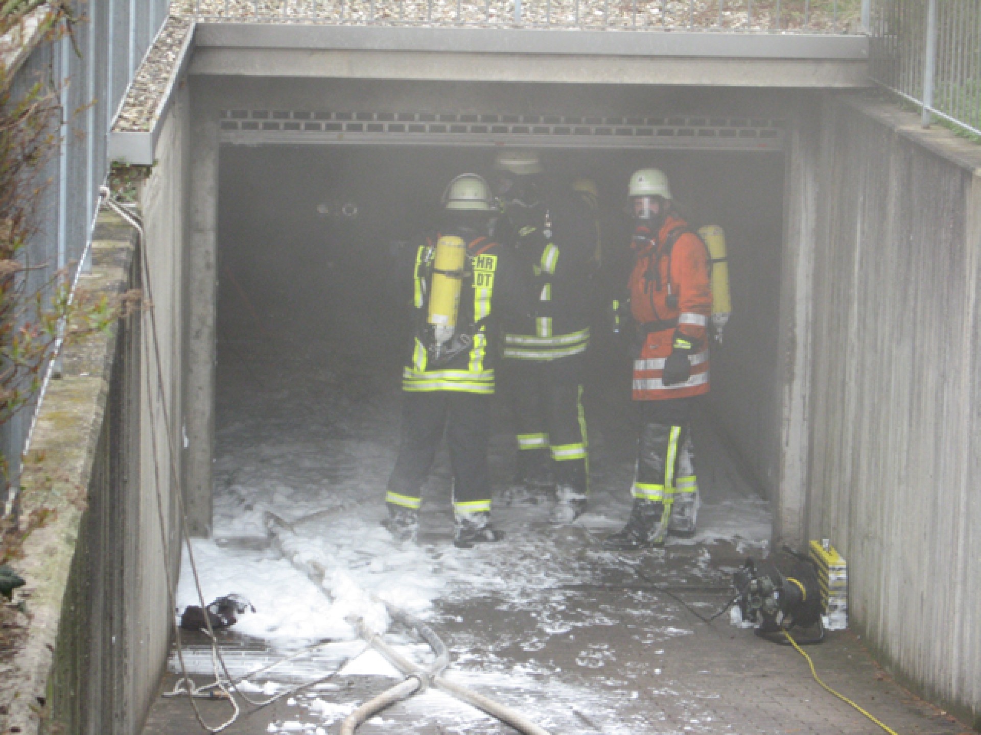 Zu einem Feueralarm wurde die Neuenstädter Wehr am Sonntag Nachmittag um 15:58 Uhr alarmiert. Schon beim Eintreffen an der Einsatzstelle drangen starke Rauchwolken aus dem Gittertor einer Tiefgarageneinfahrt, Flammen züngelten immer stärker hervor. Die derzeitige Lage war völlig unklar. Laut Übermittlung befand sich noch eine frisch operierte, gehunfähige Person im Gebäude. Aufgrund der Anzahl der benötigten Atemschutzgeräteträger bei einem Tiefgaragenbrand folgte eine Vollalarmierung, zusätzlich wurde zur Unterstützung noch die Feuerwehr Neckarsulm nachalarmiert. Der Angriffs- sowie der Wassertrupp des Hilfeleistungslöschfahrzeuges drang gewaltvoll durch das verschlossene Gittertor in die Tiefgarage ein, während weitere Trupps von einem Lichtschacht aus einen Schaumangriff vorbereiteten. Ein Personenkraftwagen hinter einer Betonmauer stand in Flammen. Es war unklar, ob sich die Brandschutztür zum Treppenaufgang in verschlossenem Zustand befand, da Rauch aus den Fenstern einer oben liegenden Wohnung des Mehrfamilienhauses drang. Aussagen zufolge sollte das brennende Fahrzeug einen vollen Tank sowie zusätzliche Reserve-Kraftstoffkanister im Kofferraum beinhalten. Nachdem sich die vermisste Person außerhalb der Tiefgarage kenntlich machte, konnten sich die zahlreichen Atemschutztrupps voll auf die Brandbekämpfung konzentrieren. Zur Unterstützung wurden hierzu zwei Überdruckbelüfter im Treppenhaus positioniert, dadurch konnte die Sichtweite schnell optimiert werden. Durch den wirksamen Einsatz des mobilen Rauchvorhanges wurde die Rauchausbreitung in den Wohnbereich deutlich reduziert. Aufgrund des Einsatzes zahlreicher Feuerwehrleute konnte der Brand schnell unter Kontrolle gebracht werden. Nachdem die Tiefgarage bald entraucht war konnten die völlig verdreckten darin befindlichen Fahrzeuge durch deren Eigentümer ausgeparkt und zu einer Waschanlage gefahren werden. Zum Entfernen des Brandfahrzeuges war ein Abschleppwagen notwendig, zuvor musste das Fahrzeug um eine Ecke gezogen werden. Zahlreiche Schaulustige verfolgten den Einsatz, verletzt wurde glücklicherweise niemand. Die Brandschau erfolgte durch Kreisbrandmeister Vogel. Die Kommandanten Jochim und Schaffroth äußerten sich sehr positiv über den Einsatzablauf und die taktische Vorgehensweise.