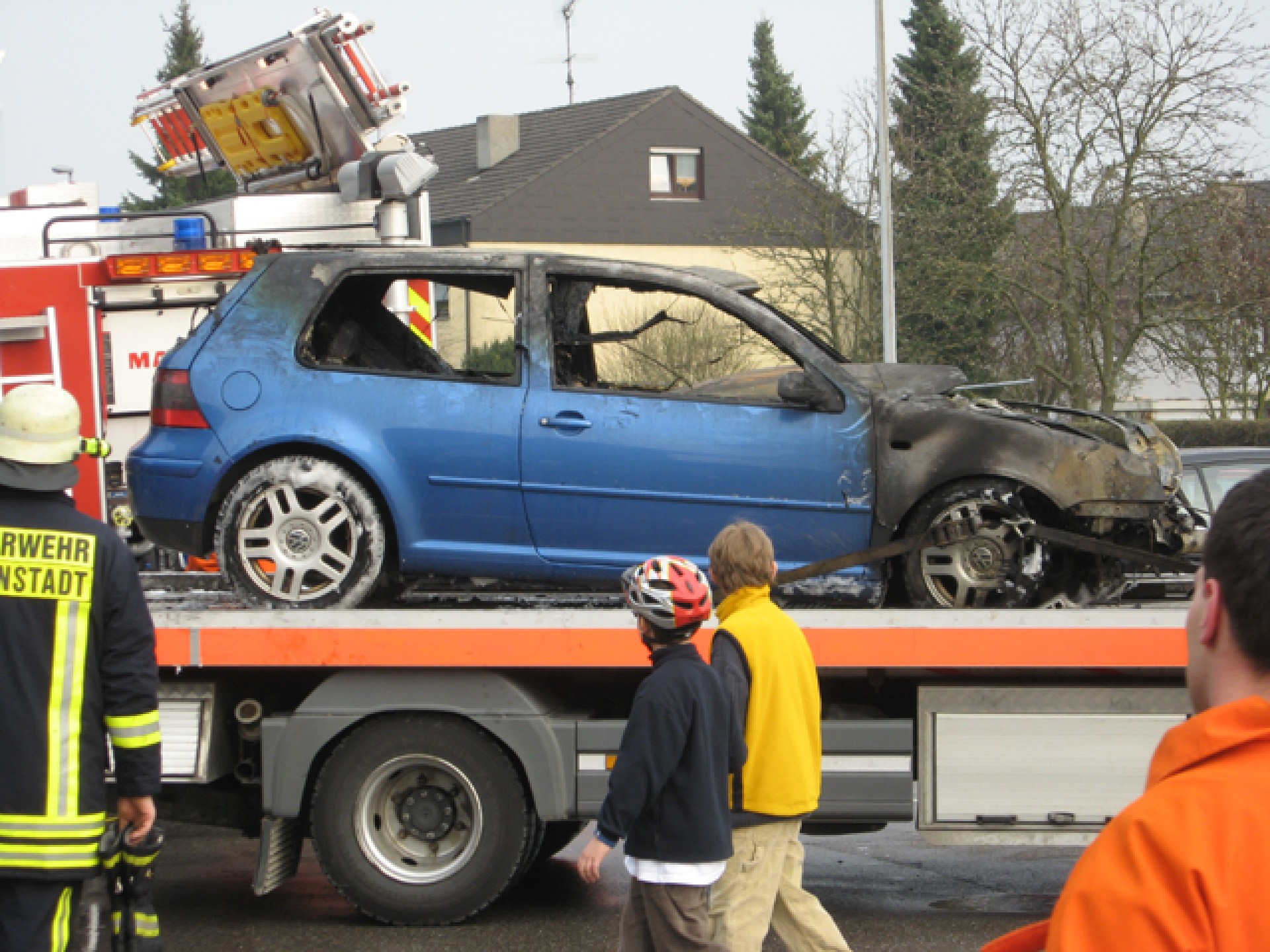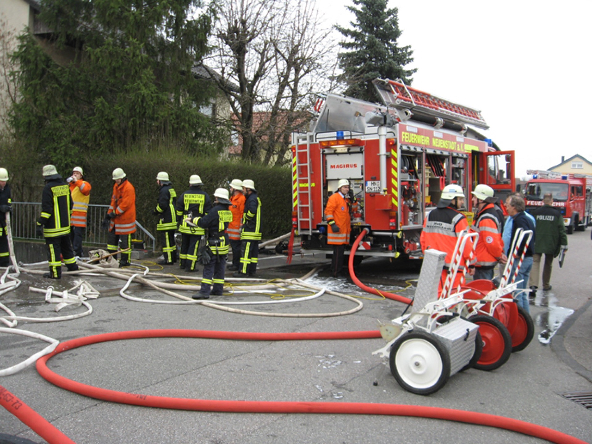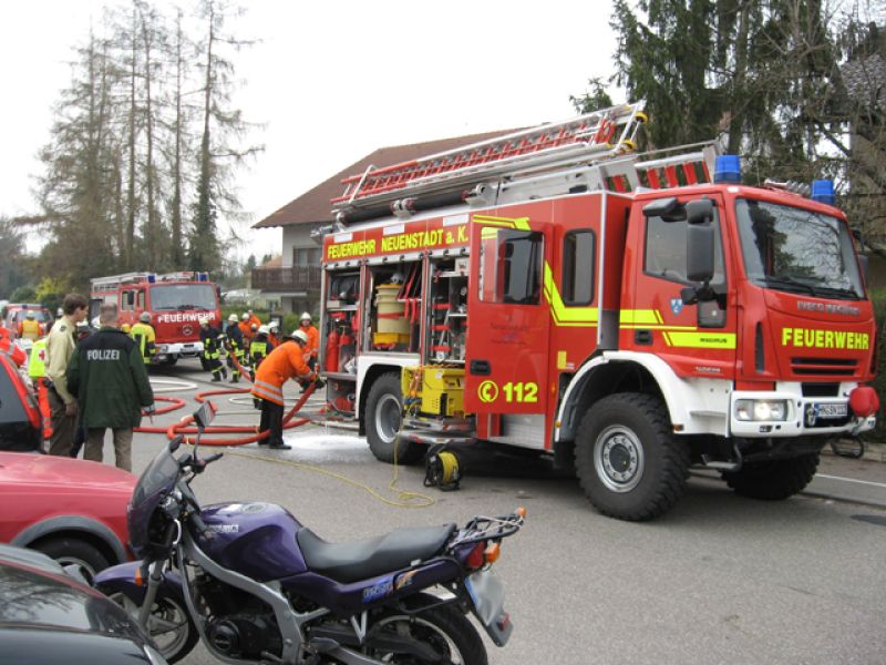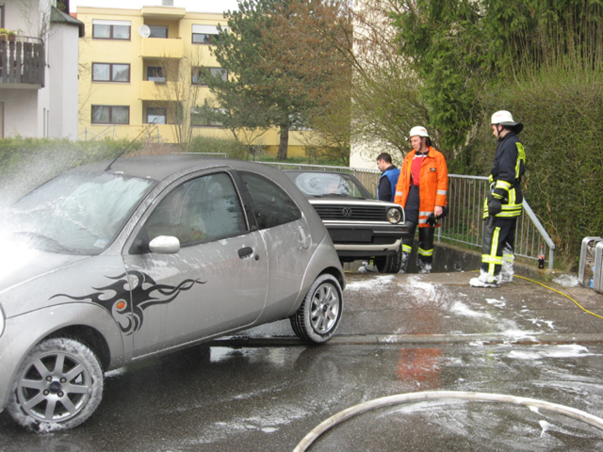 Zu einem Feueralarm wurde die Neuenstädter Wehr am Sonntag Nachmittag um 15:58 Uhr alarmiert. Schon beim Eintreffen an der Einsatzstelle drangen starke Rauchwolken aus dem Gittertor einer Tiefgarageneinfahrt, Flammen züngelten immer stärker hervor. Die derzeitige Lage war völlig unklar. Laut Übermittlung befand sich noch eine frisch operierte, gehunfähige Person im Gebäude. Aufgrund der Anzahl der benötigten Atemschutzgeräteträger bei einem Tiefgaragenbrand folgte eine Vollalarmierung, zusätzlich wurde zur Unterstützung noch die Feuerwehr Neckarsulm nachalarmiert. Der Angriffs- sowie der Wassertrupp des Hilfeleistungslöschfahrzeuges drang gewaltvoll durch das verschlossene Gittertor in die Tiefgarage ein, während weitere Trupps von einem Lichtschacht aus einen Schaumangriff vorbereiteten. Ein Personenkraftwagen hinter einer Betonmauer stand in Flammen. Es war unklar, ob sich die Brandschutztür zum Treppenaufgang in verschlossenem Zustand befand, da Rauch aus den Fenstern einer oben liegenden Wohnung des Mehrfamilienhauses drang. Aussagen zufolge sollte das brennende Fahrzeug einen vollen Tank sowie zusätzliche Reserve-Kraftstoffkanister im Kofferraum beinhalten. Nachdem sich die vermisste Person außerhalb der Tiefgarage kenntlich machte, konnten sich die zahlreichen Atemschutztrupps voll auf die Brandbekämpfung konzentrieren. Zur Unterstützung wurden hierzu zwei Überdruckbelüfter im Treppenhaus positioniert, dadurch konnte die Sichtweite schnell optimiert werden. Durch den wirksamen Einsatz des mobilen Rauchvorhanges wurde die Rauchausbreitung in den Wohnbereich deutlich reduziert. Aufgrund des Einsatzes zahlreicher Feuerwehrleute konnte der Brand schnell unter Kontrolle gebracht werden. Nachdem die Tiefgarage bald entraucht war konnten die völlig verdreckten darin befindlichen Fahrzeuge durch deren Eigentümer ausgeparkt und zu einer Waschanlage gefahren werden. Zum Entfernen des Brandfahrzeuges war ein Abschleppwagen notwendig, zuvor musste das Fahrzeug um eine Ecke gezogen werden. Zahlreiche Schaulustige verfolgten den Einsatz, verletzt wurde glücklicherweise niemand. Die Brandschau erfolgte durch Kreisbrandmeister Vogel. Die Kommandanten Jochim und Schaffroth äußerten sich sehr positiv über den Einsatzablauf und die taktische Vorgehensweise.