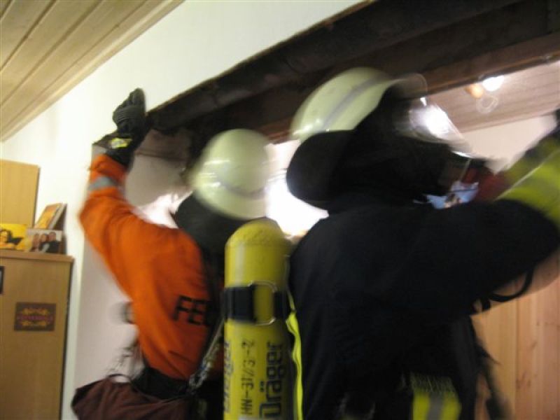 Beim Eintreffen der Feuerwehr brannte der Kamin in voller Ausdehnung. Flammen und schwarzer Rauch drangen aus dem Kaminkopf. Der Kamin selbst und die benachbarten Gebäudeteile waren derart überhitzt, so dass eine Holzverkleidung Feuer fing.