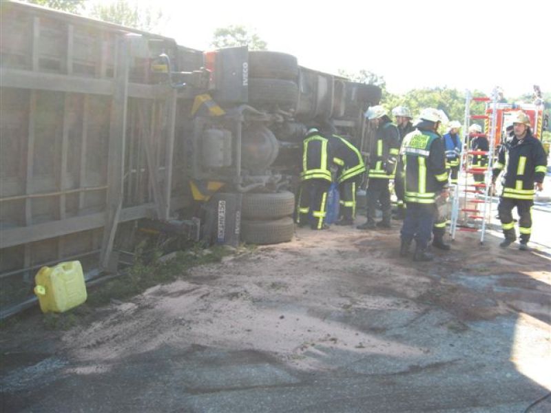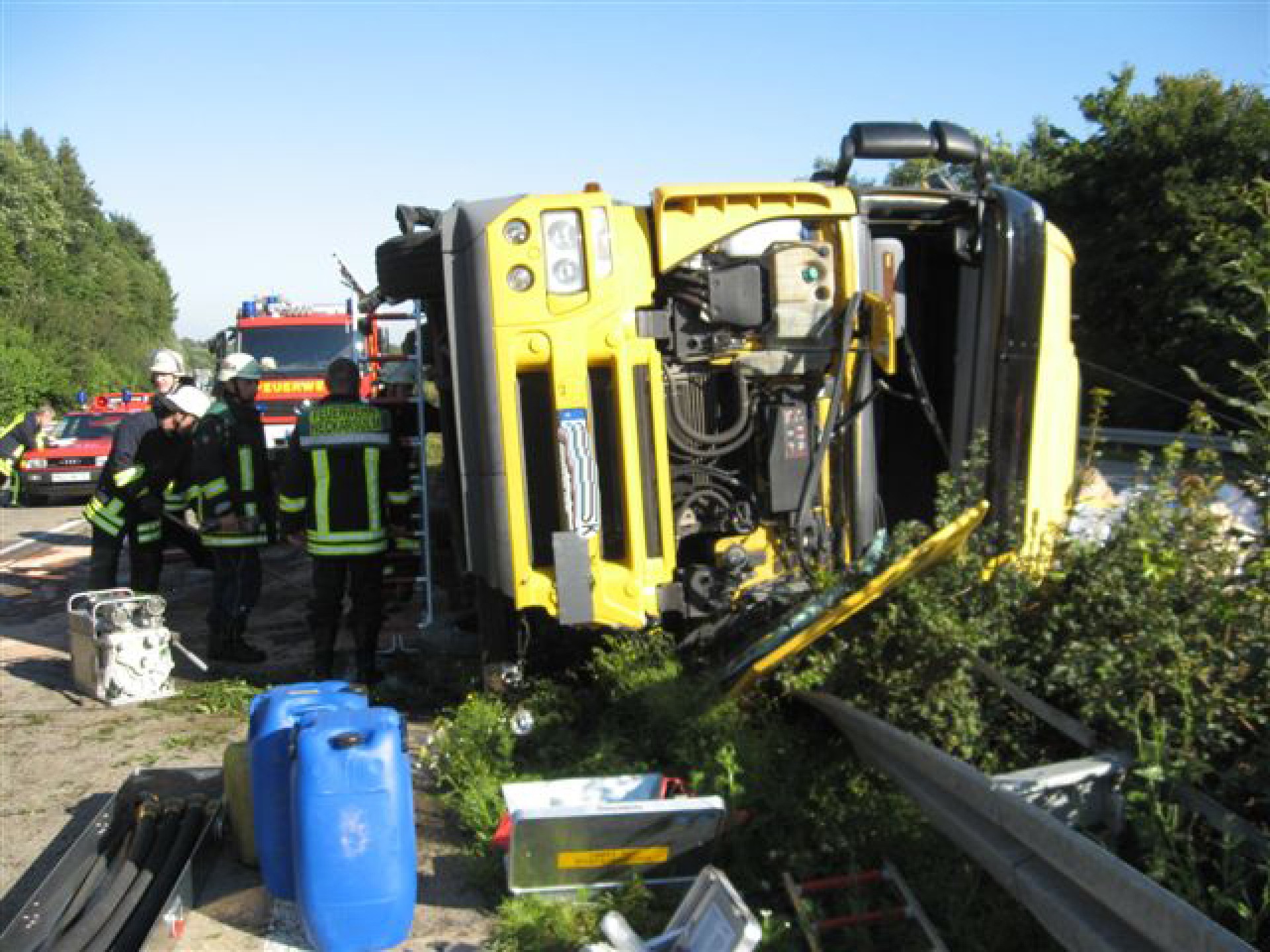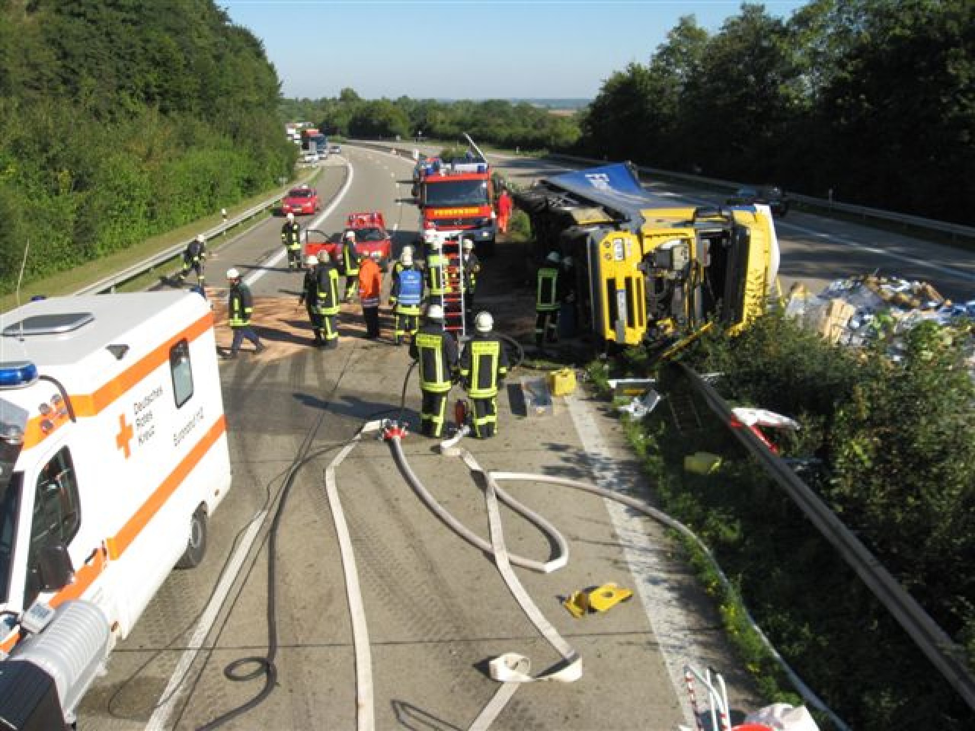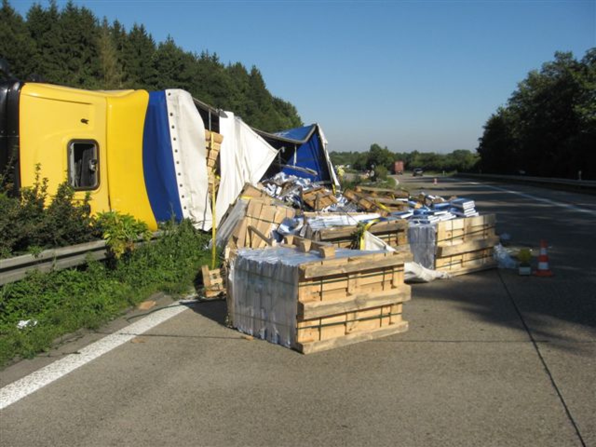 Ein 28-Jähriger war mit seinem Sattelzug in Richtung Stuttgart unterwegs. Kurz vor dem Tunnel Hölzern wollte er einen anderen LKW überholen, geriet hierbei aus unbekannter Ursache zu weit nach links und prallte gegen die Mittelleitplanke. Der Sattelzug kippte nach links auf die Leitplanken. Die Ladung, es handelt sich um technische Hydraulikhandbücher, verteilte sich auf dem linken Fahrstreifen und der Gegenfahrbahn. Der Fahrer erlitt einen Schock und wurde vorsorglich ins Krankenhaus gebracht. Aus dem umgestürzten Sattenzug liefen Öl und Diesel aus, die Feuerwehren Neckarsulm und Neuenstadt waren mit jeweils drei Fahrzeugen und neun Mann am Unfallort. Der entstandene Sachschaden wird nach jetzigem Kenntnisstand auf 80.000 Euro geschätzt.