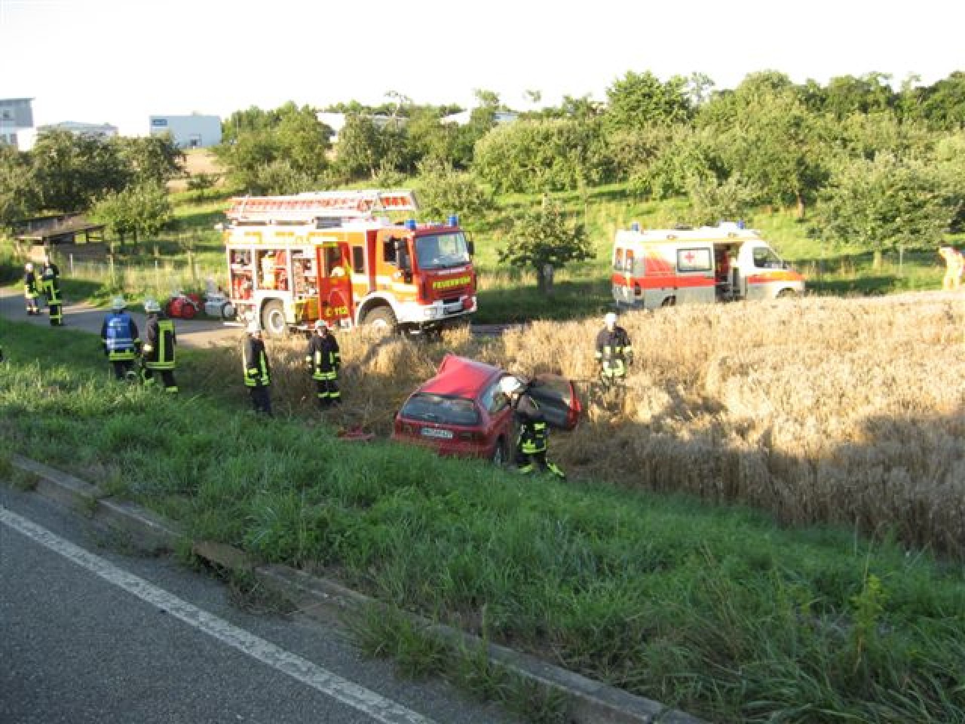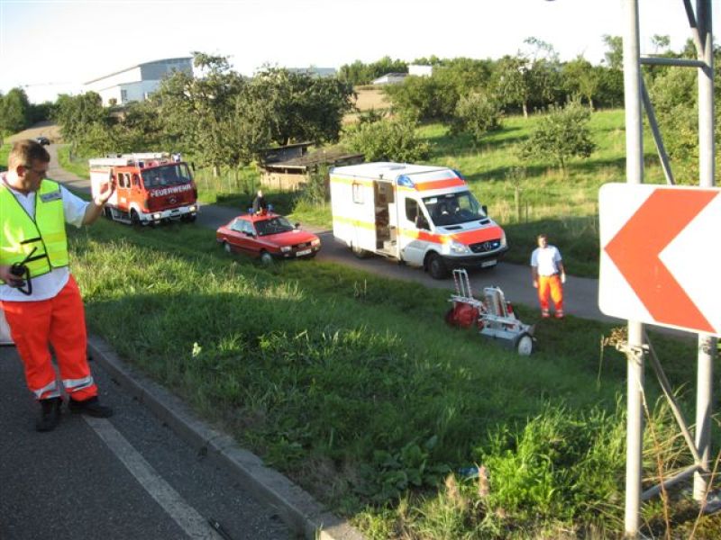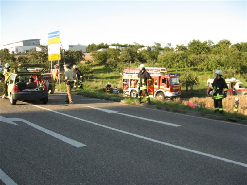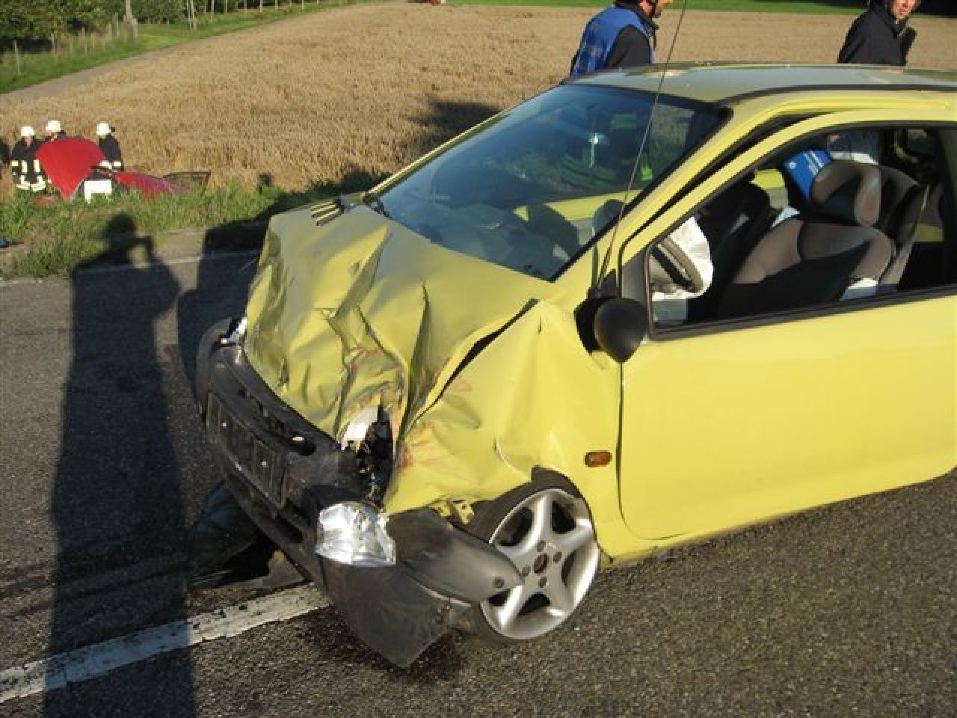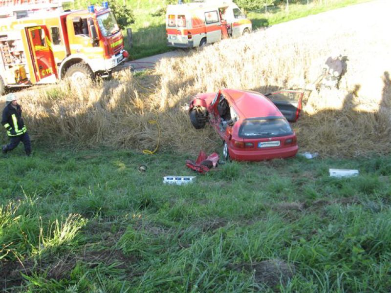 Nachdem sie sich kurz vor der Einmündung zur Cleversulzbacher Straße befindet, fährt von rechts ein Pkw Honda Civic unter Missachtung der Vorfahrt in die Kreisstraße ein, wodurch es zur starken Kollision beider Fahrzeuge kommt. Im weiteren Verlauf wird der 19 jährige Fahrer des Honda Civic über die Straße und der angrenzenden etwa 5 Meter tiefen Böschung in ein angrenzendes Weizenfeld geschleudert.Die Fahrerin des Renault Twingo wird mit ihrem Fahrzeug um 180 Grad gedreht.