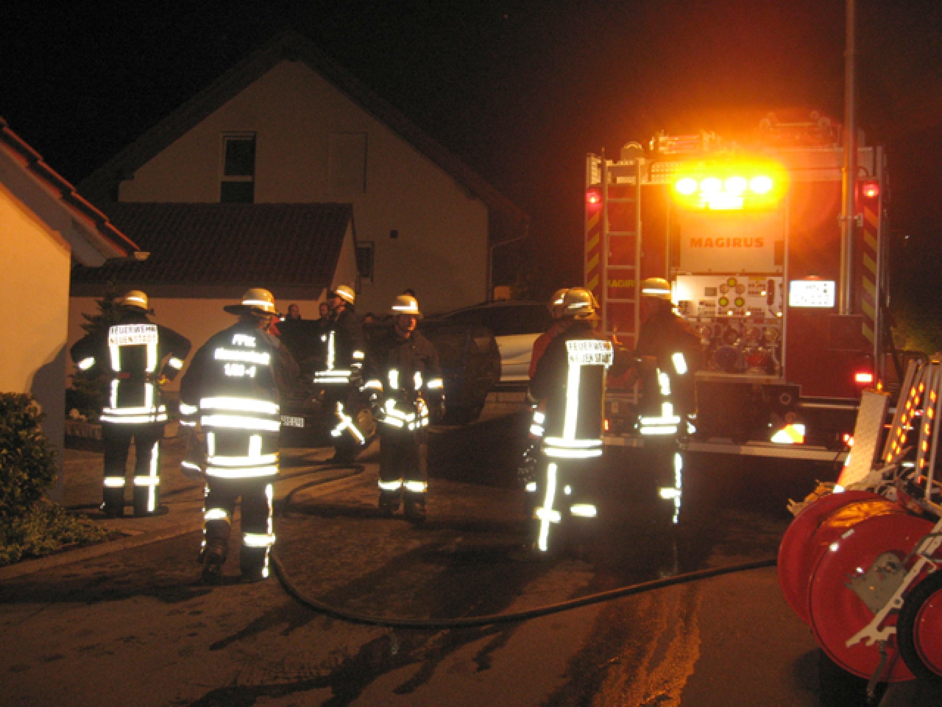 Die Feuerwehr Neuenstadt war mit 3 Fahrzeugen innerhalb weniger Minuten am Einsatzort, an dem der Eigentümer bereits mit einem Gartenschlauch den Brand in der Garage weitgehend unter Kontrolle gebracht hatte. Die Feuerwehr zog das Fahrzeug aus der Garage um es vollständig abzulöschen.