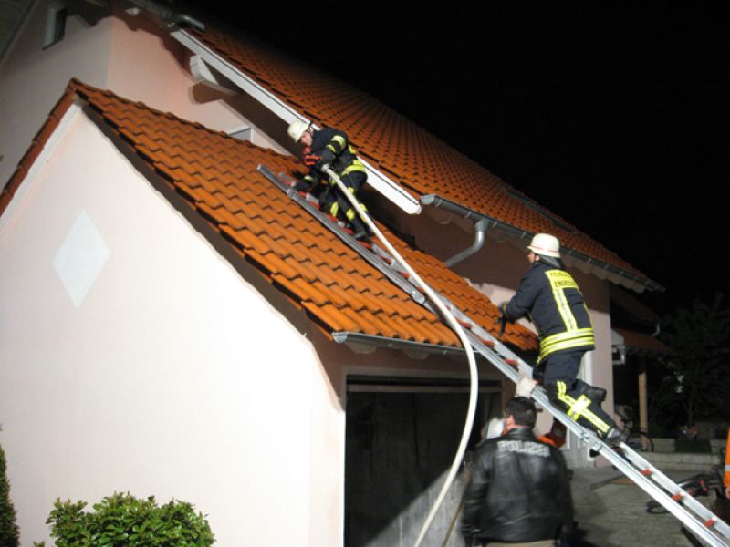 Ein Trupp unter Atemschutz ging zur Brandbekämpfung mit einem C-Rohr in den Dachboden der 2- geschossigen Garage vor und stellte einen Rauch- und Wärmeabzug über das Entfernen von Ziegeln her.