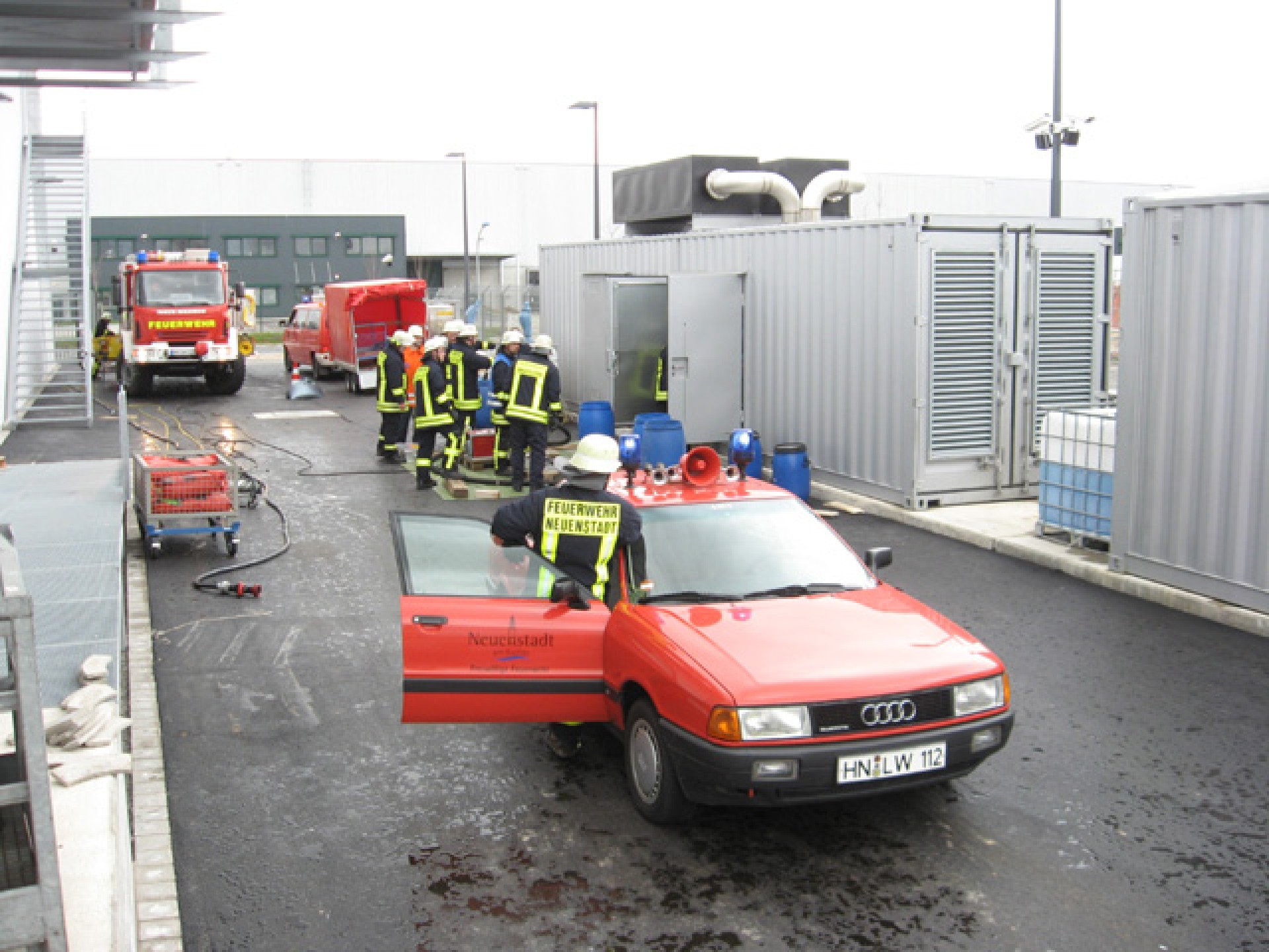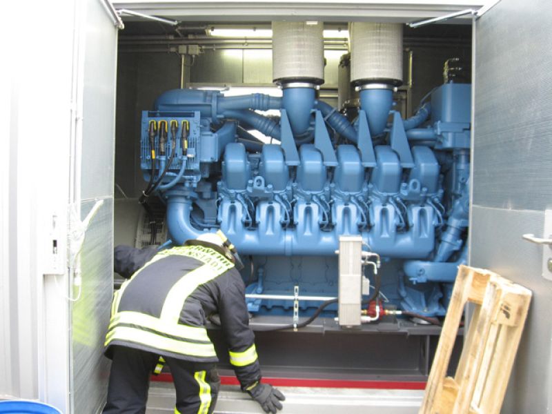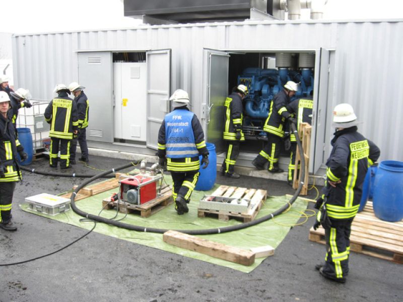 Vermutlich aufgrund einer undicht verschweißten Rohrleitung gelangten am Sonntag Mittag größere Mengen Dieselkraftstoff in den Container einer Notstromanlage. Da zunächst unklar war, ob der Kraftstoff auch ins Erdreich gelangen könnte, alarmierte ein zuständiger Mitarbeiter die Feuerwehr. Unter Einsatz zweier Spezialpumpen konnte der Kraftstoff zügig in ein bereitgestelltes Fass umgefüllt werden.