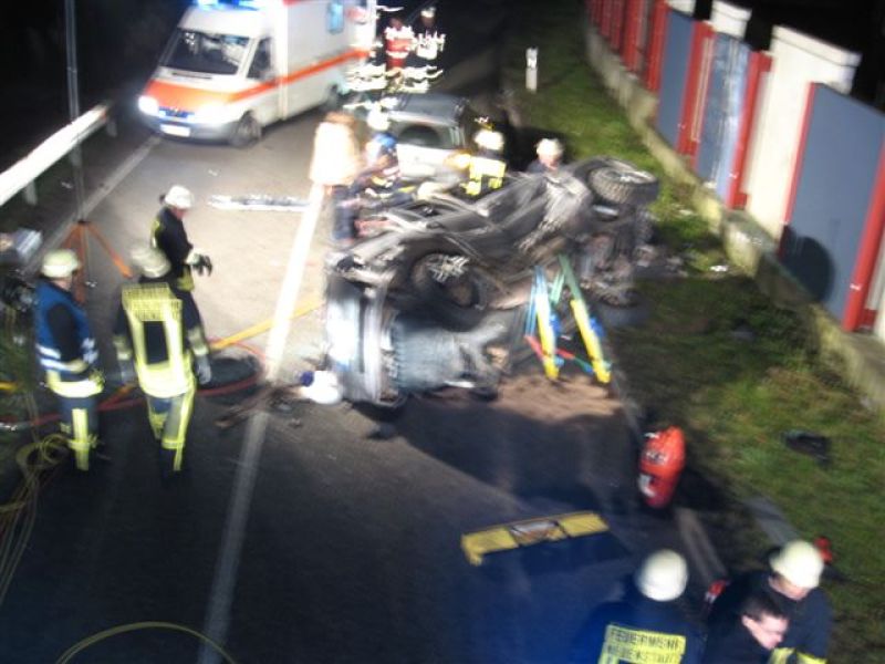 Der Fahrer war im Fahrzeug eingeschlossen und wurde von der Feuerwehr aus dem Fahrzeug gerettet und an den Rettungsdienst übergeben. Zuvor wurde das Fahrzeug mit dem „Stabfast-System“ in seiner Seitenlage gesichert.