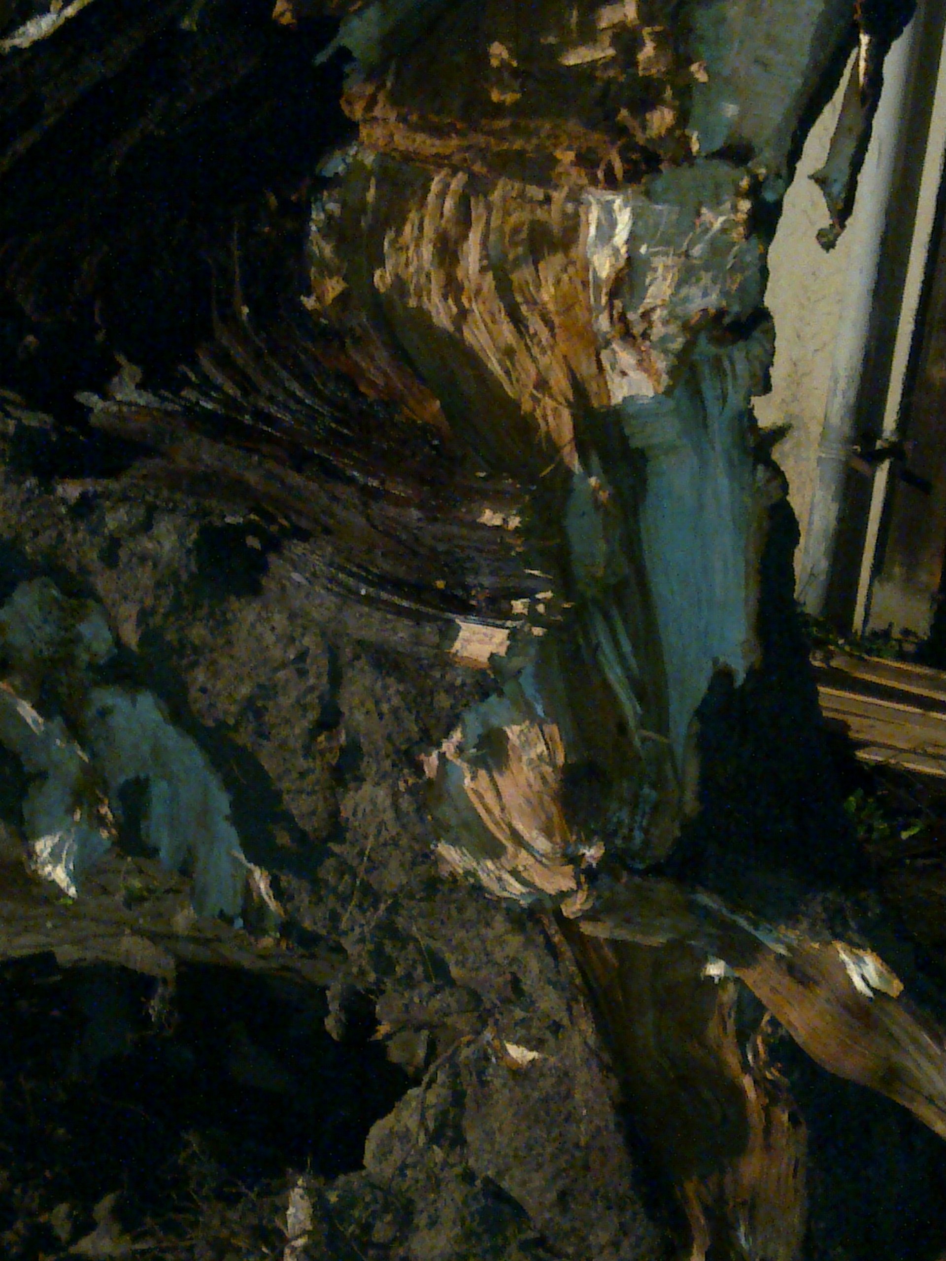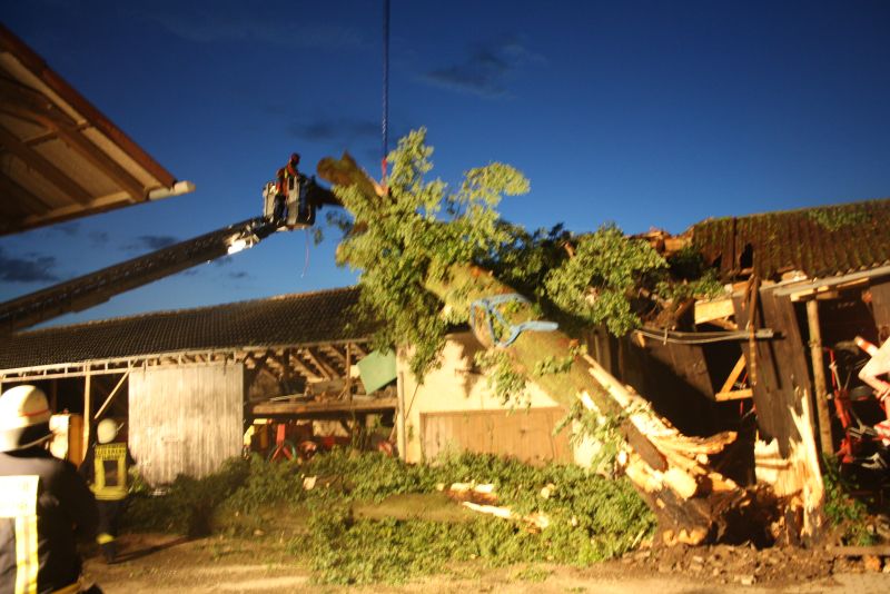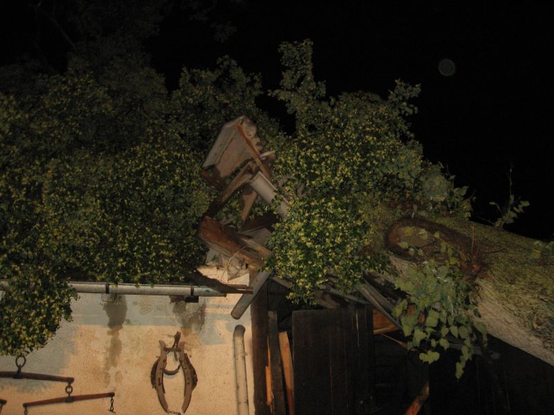 Beim Eintreffen bot sich folgende Lage: Im Hof eines landwirtschaftlichen Gebäudes war ein ca. 25 m hoher Lindenbaum mit ausladender Krone und Stammdurchmesser von über 1m war durch eine Windböe auf Bodenhöhe abgerissen und fiel auf ein unmittelbar daneben stehendes Wirtschaftsgebäude. In dem Gebäude befanden sich landwirtschaftliche Maschinen, ein Traktor sowie mehrere Anhänger.