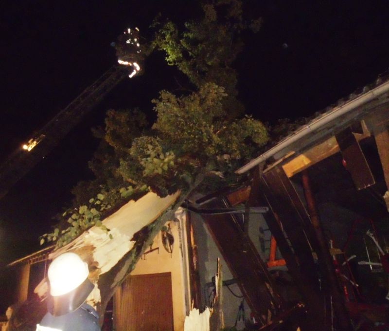 Nach einem heftigen Gewitter mit starkem Wind, traf am 21.Juni gegen 23.10 Uhr telefonisch eine Meldung ein, dass im Brambacherhof ein Lindenbaum auf ein Gebäude gestürzt sei. Die Feuerwehr soll zum Ausleuchten der Einsatzstelle unterstützen, damit der Baum beseitigt werden kann.