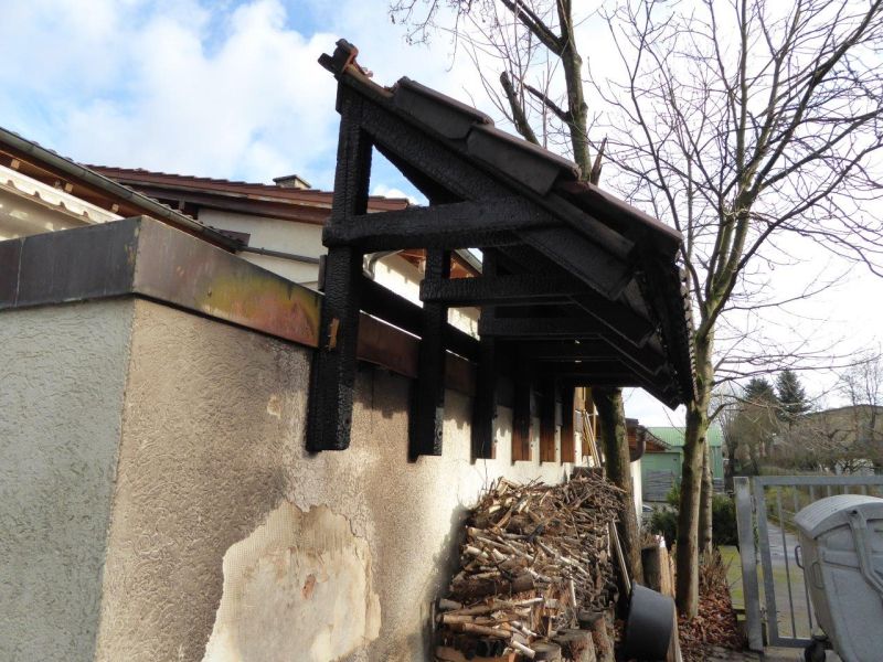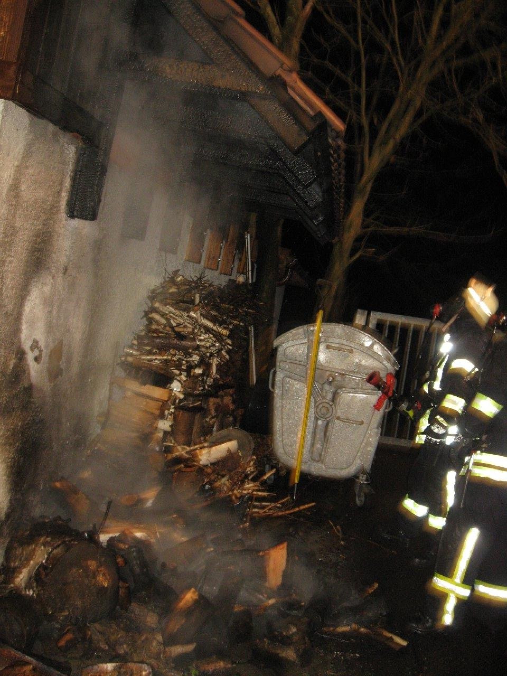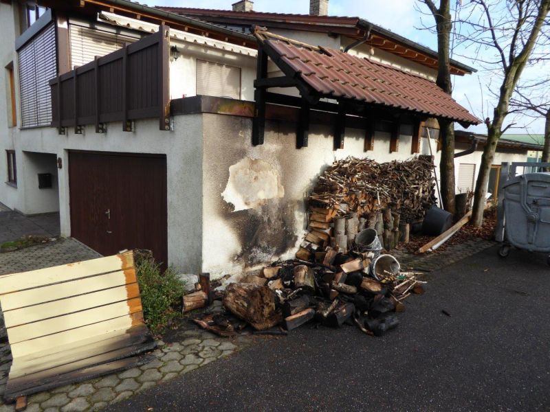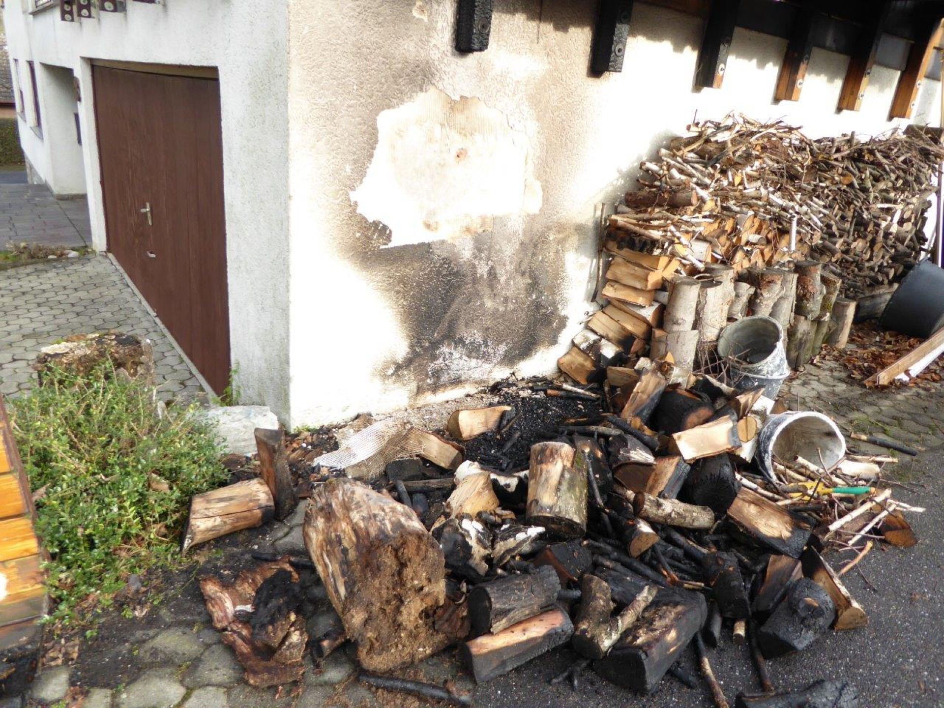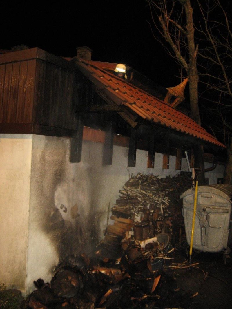 Beim Eintreffen der Feuerwehr brannte ein Holzstapel direkt an der Außenwand einer Garage. Die Garage ist an das Wohn-Geschäftsgebäude angebaut. Über der Wand ist ein Ziegeldach in Holzkonstruktion vorhanden, welche bereits Feuer gefangen hatte und brennt.