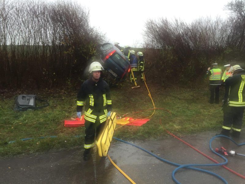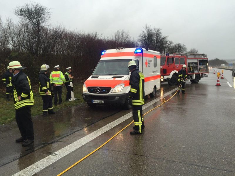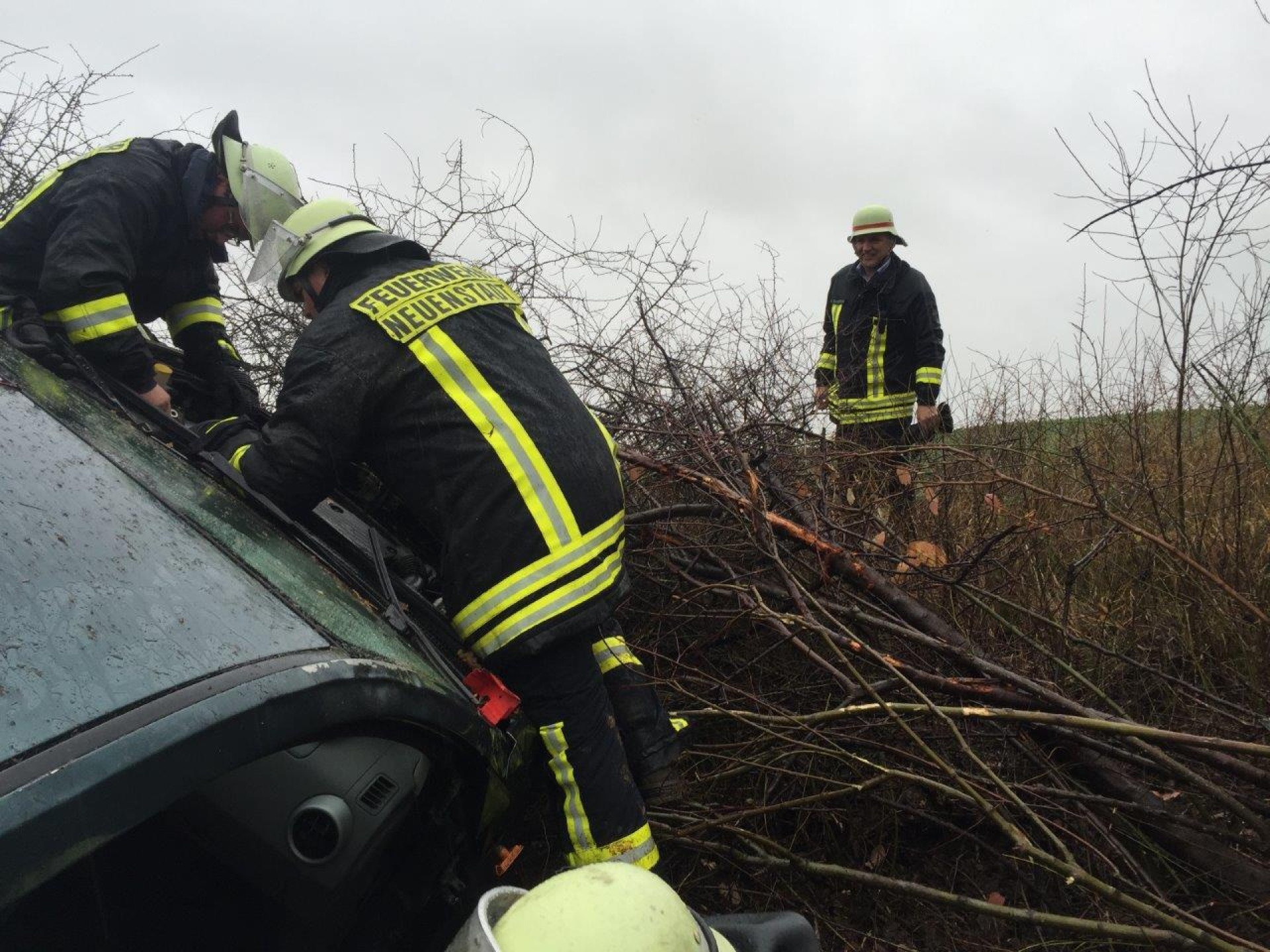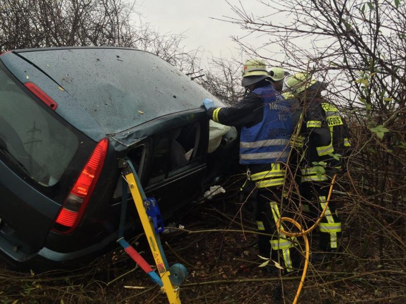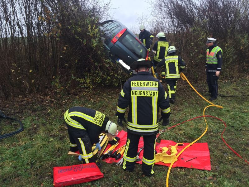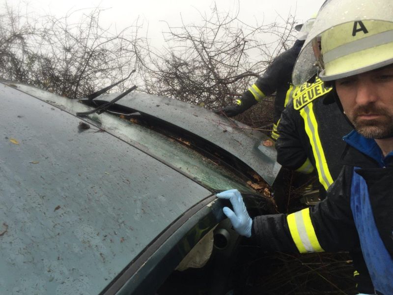 Bei starkem Regen fuhr ein PKW nach rechts von der Fahrbahn der Autobahn in den aufgeweichten Grünstreifen und anschließend in die bepflanzte Böschung. Das Fahrzeug kam erst nach einer längeren Fahrt durch Büsche im Winkeln von 90° zur Fahrbahn zum Stehen. Der Fahrer war in seinem Fahrzeug eingeklemmt und wurde von der Feuerwehr Neuenstadt über die aufgespreizte Beifahrertüre befreit und gemeinsam mit dem Rettungsdienst aus dem Fahrzeug gehoben. Da sich das Fahrzeug in starker Schräglage befand, musste es zuvor gegen Kippen gesichert werden.