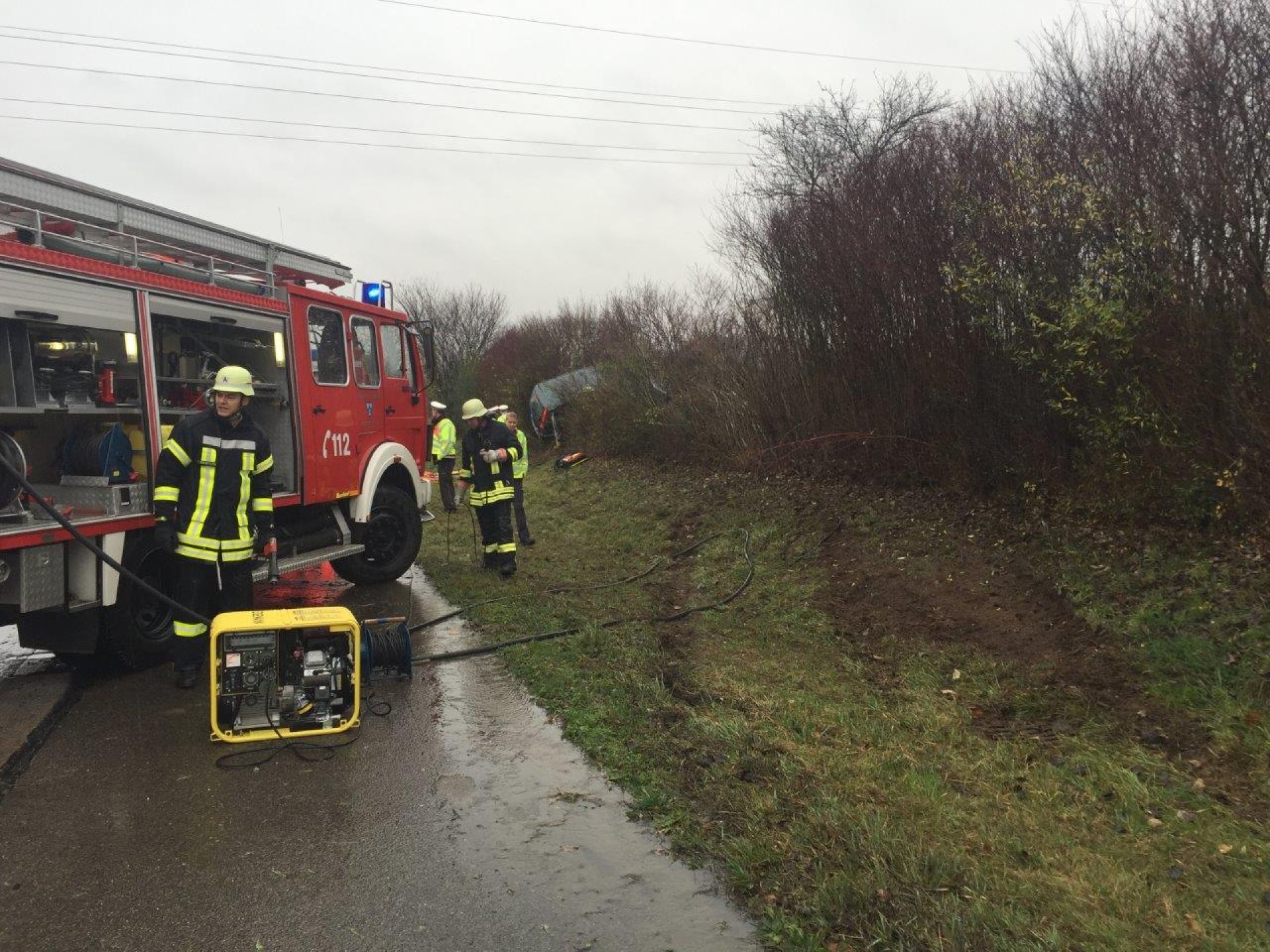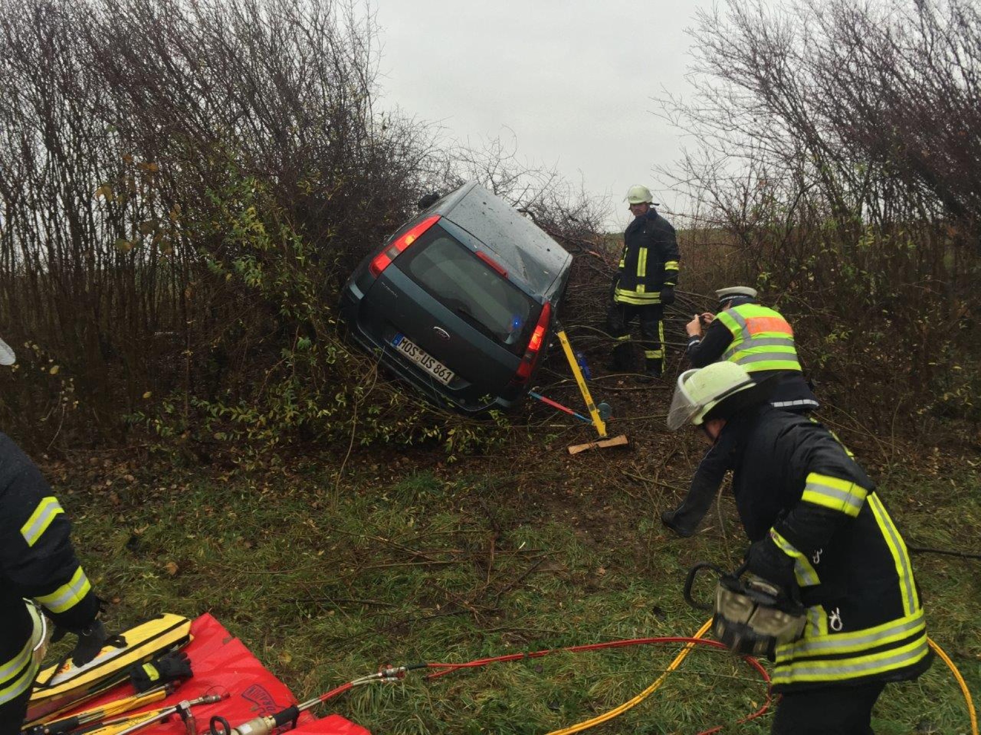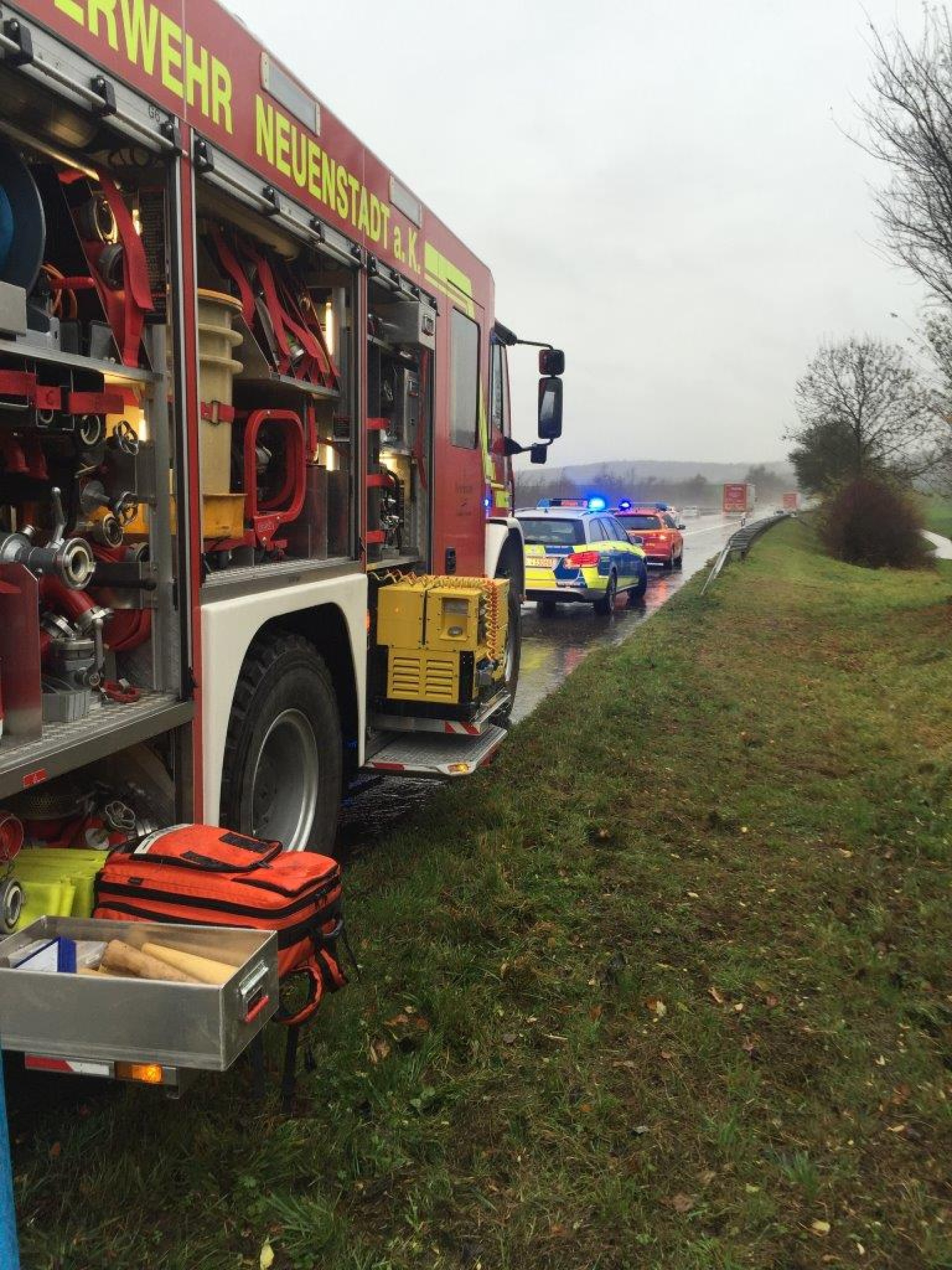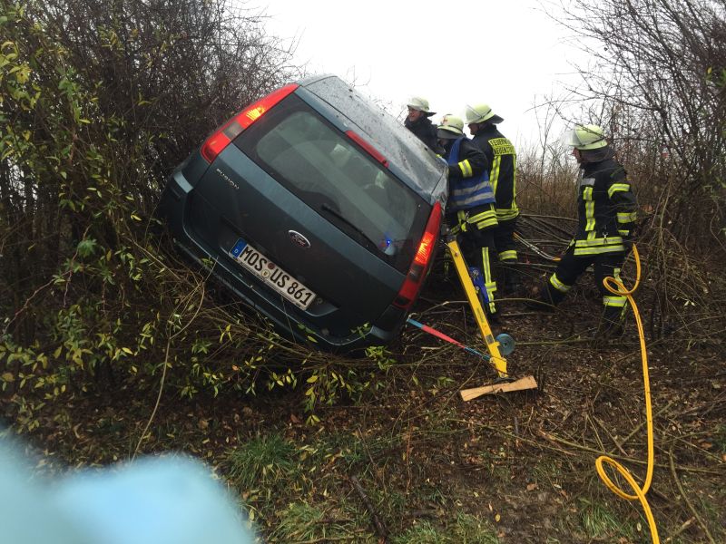 Bei starkem Regen fuhr ein PKW nach rechts von der Fahrbahn der Autobahn in den aufgeweichten Grünstreifen und anschließend in die bepflanzte Böschung. Das Fahrzeug kam erst nach einer längeren Fahrt durch Büsche im Winkeln von 90° zur Fahrbahn zum Stehen. Der Fahrer war in seinem Fahrzeug eingeklemmt und wurde von der Feuerwehr Neuenstadt über die aufgespreizte Beifahrertüre befreit und gemeinsam mit dem Rettungsdienst aus dem Fahrzeug gehoben. Da sich das Fahrzeug in starker Schräglage befand, musste es zuvor gegen Kippen gesichert werden.