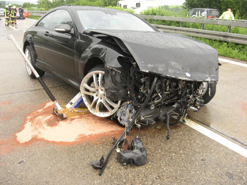 Ein Mercedes war auf regenasser Fahrbahn infolge Auaplaning ins Schleudern geraten und war auf die Betonbegrenzung der Brücke gefahren.
