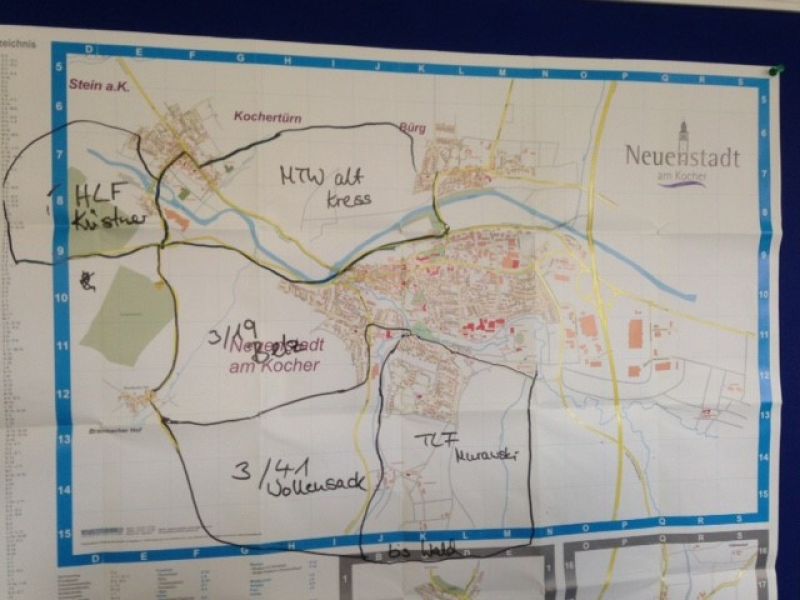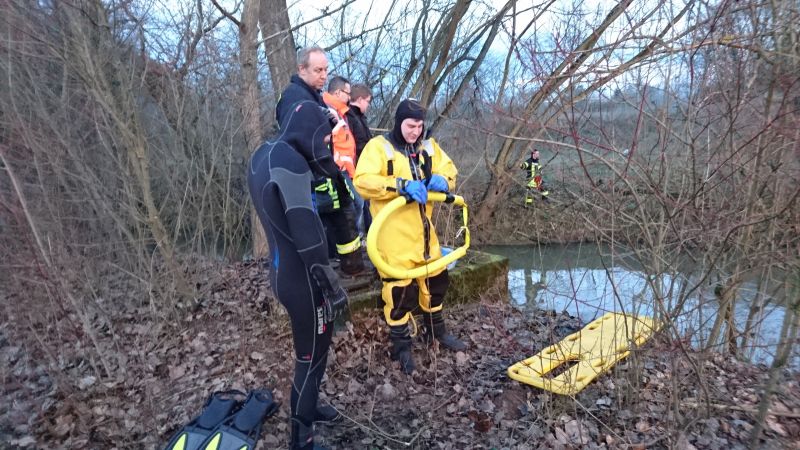 Die Feuerwehr Neuenstadt wurde gegen 14:30 Uhr vom Polizeiposten Neuenstadt zur Unterstützung bei der Auffindung einer seit mehreren Tagen vermissten Person angefordert. Die Suche erfolgte daraufhin stabsmässig im gesamten Stadtgebiet auf Fluren und Wald durch Feuerwehr, Rettungshubschrauber und Rettungshundestaffel. Gegen 16:45 Uhr wurden Kleidungsstücke am Fluß der Brettach gefunden, die der Person zugeordnet werden konnten. Danach erfolgte eine konzentrierte Suche am Flußufer, bei der die vermisste Person leblos im Fluß gefunden werden konnte. Die Bergung erfolgte durch Taucher der Berufsfeuerwehr Heilbronn mit Unterstützung der Feuerwehr Neuenstadt.