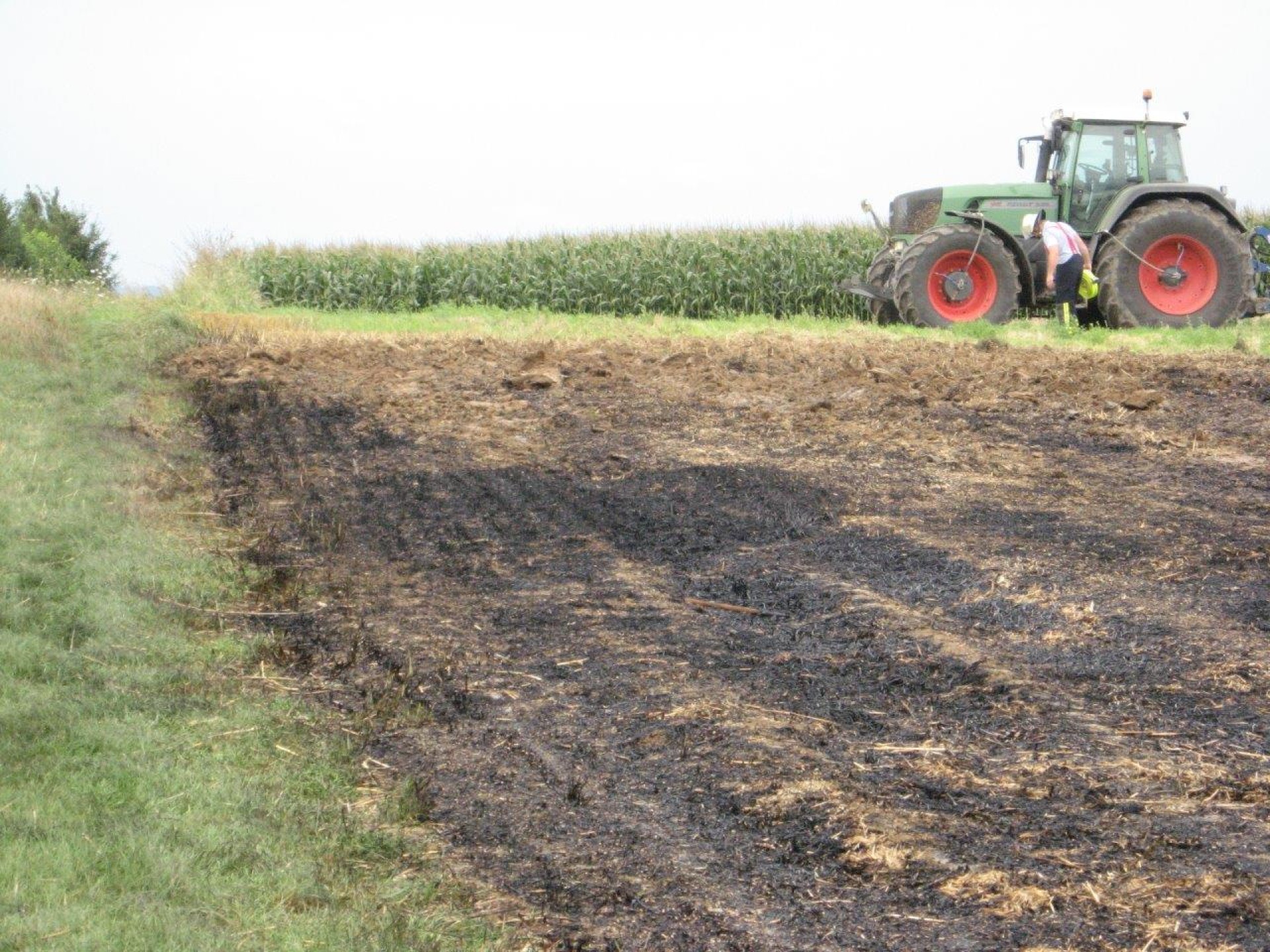 Das 2. Fahrzeug, das HLF 20/16 versuchte die Ausdehnung des Feuers auf dem Feld einzudämmen. Die entscheidende Unterstützung kam von einem Feuerwehrmann, der mit einem starken Traktor mit Grubber anrückte und auf dem Feld eine breite Schneise zog. So konnte sich das Feuerwehr totlaufen ohne weiteren Schaden anzurichten.