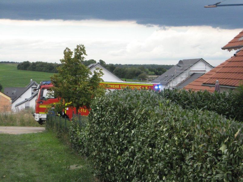Das Feuer lief bis auf ca.10 m vor die Fassade von drei Reihenhäusern. Die Hecke im Garten wurde durch die Hitze bereits stark in Mitleidenschaft gezogen. Die Erstmaßnahmen mit dem HLF 20 konzentrierten sich darauf, den Brand nahe der Häuser zu löschen, um ein Übergreifen zu verhindern.
