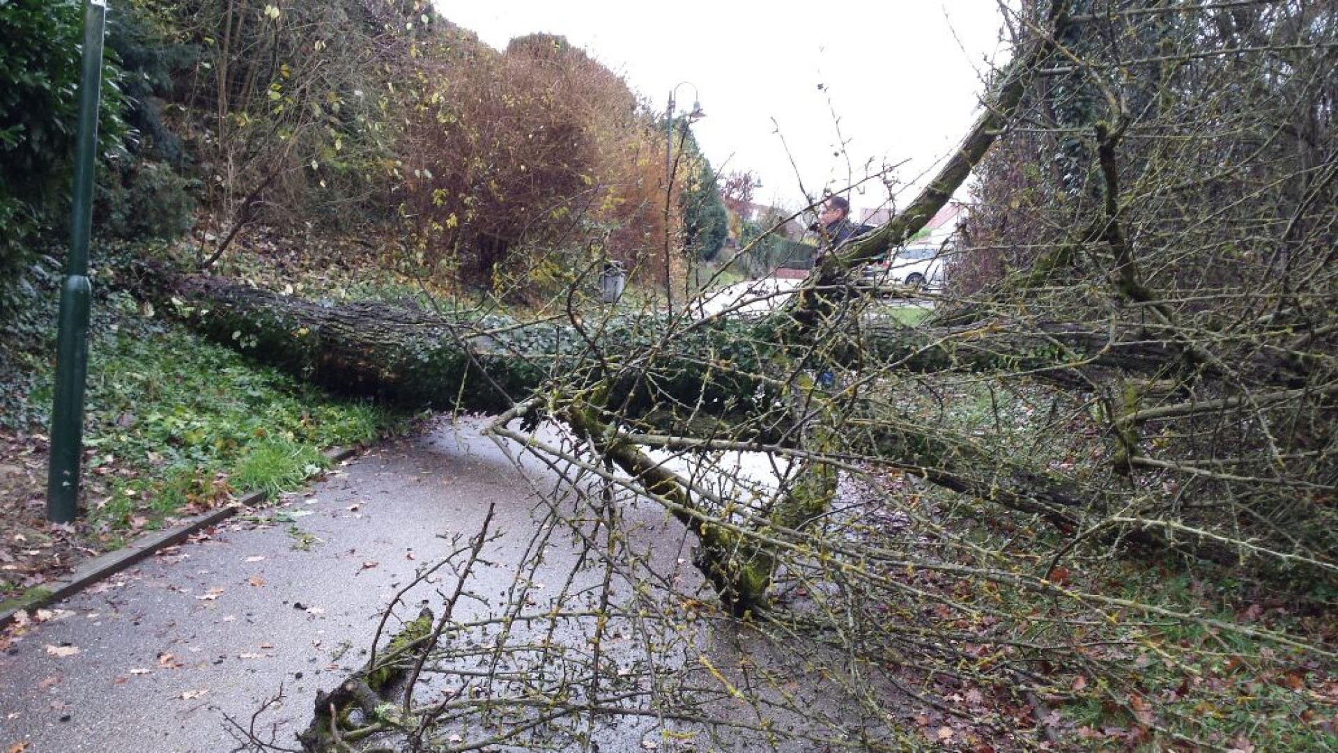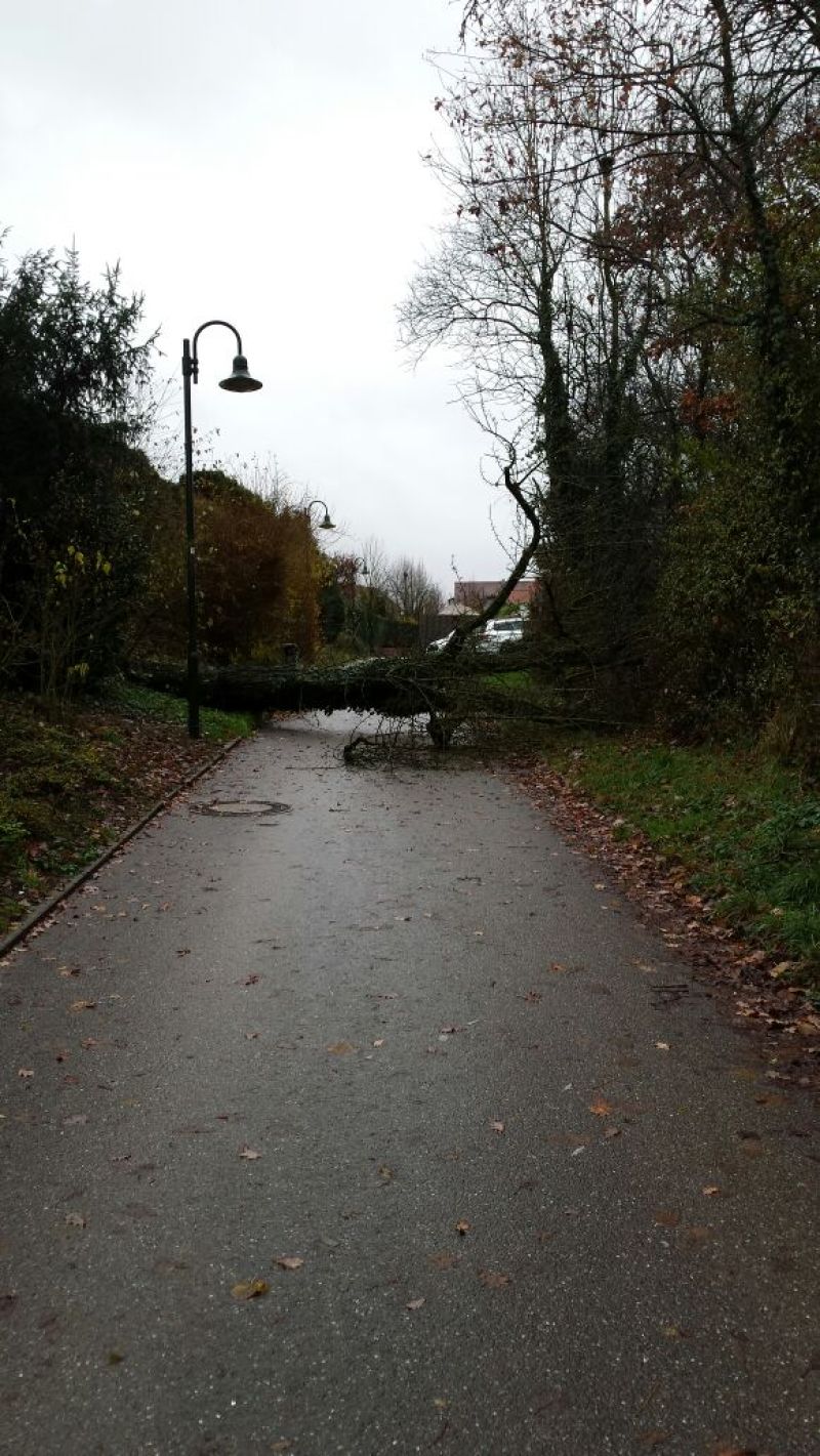 Ein großer Birnbaum fiel im Bereich Wildermuthstraße, Fußweg zum Daistler um und legte sich quer über den Fußweg. Der Stamm war bodennah abgefault. Die Feuerwehr Neuenstadt, Abteilung Neuenstadt zersägte den Stamm und legte ihn am Straßenrand ab.