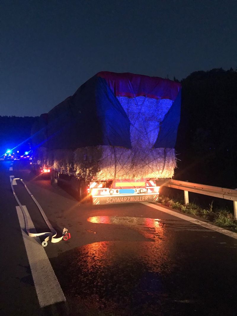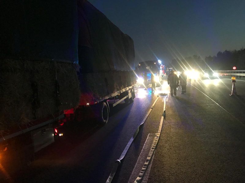 Der LKW hatte auf Motorwagen und Anhänger Strohballen geladen. In die Abgasreinigungsanlage waren Strohhalme geraten, die eine Rauchentwicklung verursacht hatten.