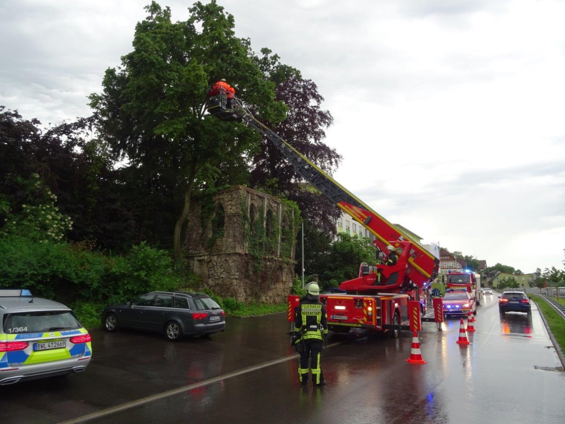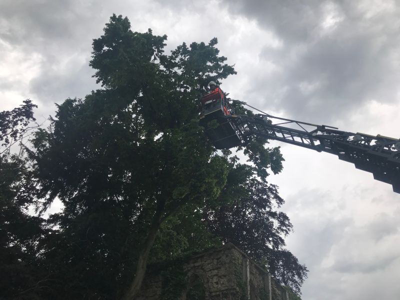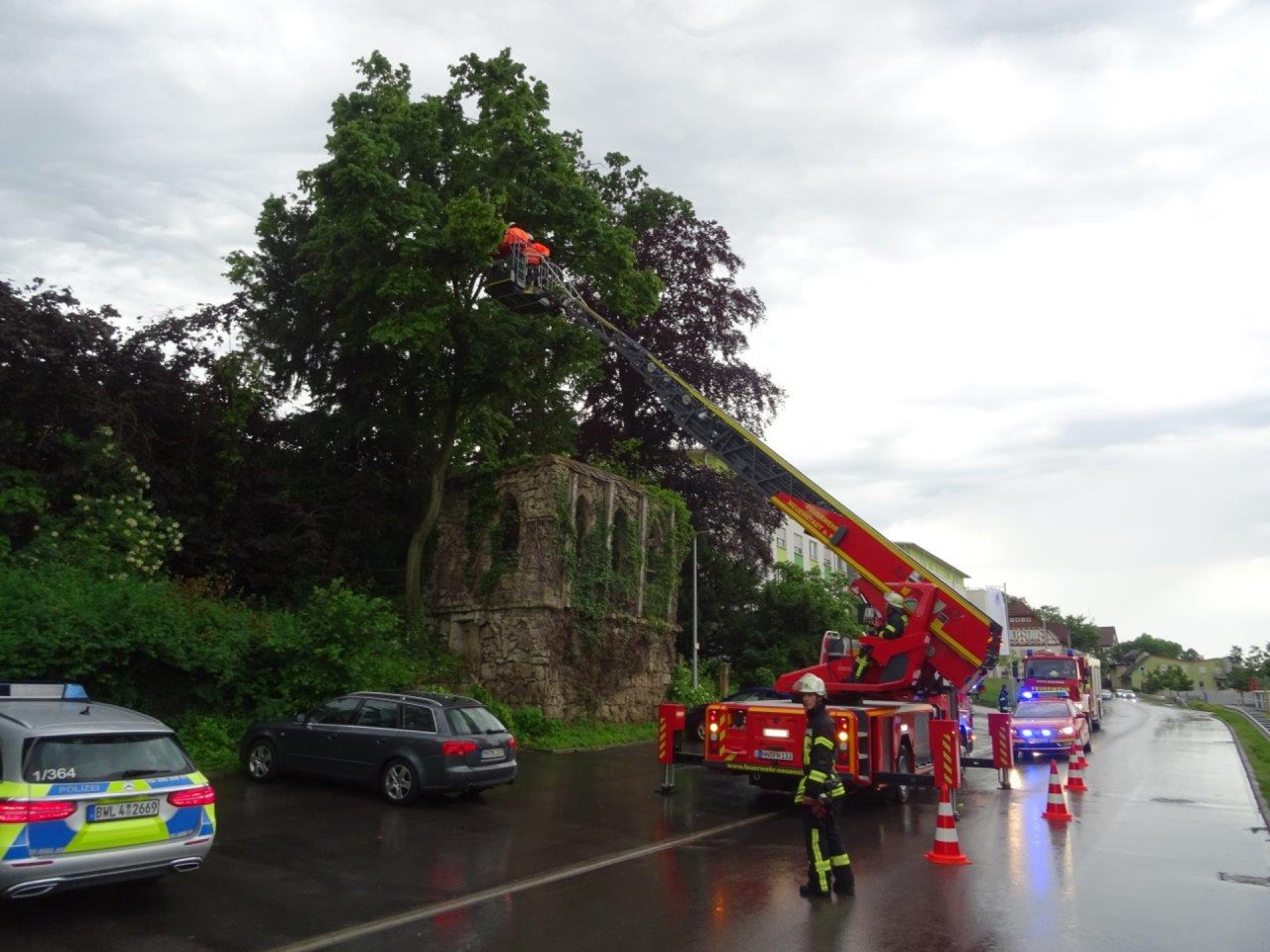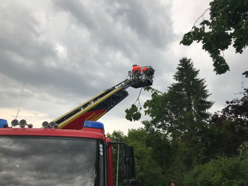 Infolge starken Winds war ein Ast von einem Baum auf einen geparkten PKW gefallen. Weitere Äste hingen lose im Baum. Die Feuerwehr sägte mit Hilfe der Drehleiter die betroffenen Äste ab und lagerte sie am Straßenrand.