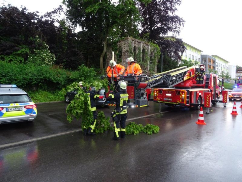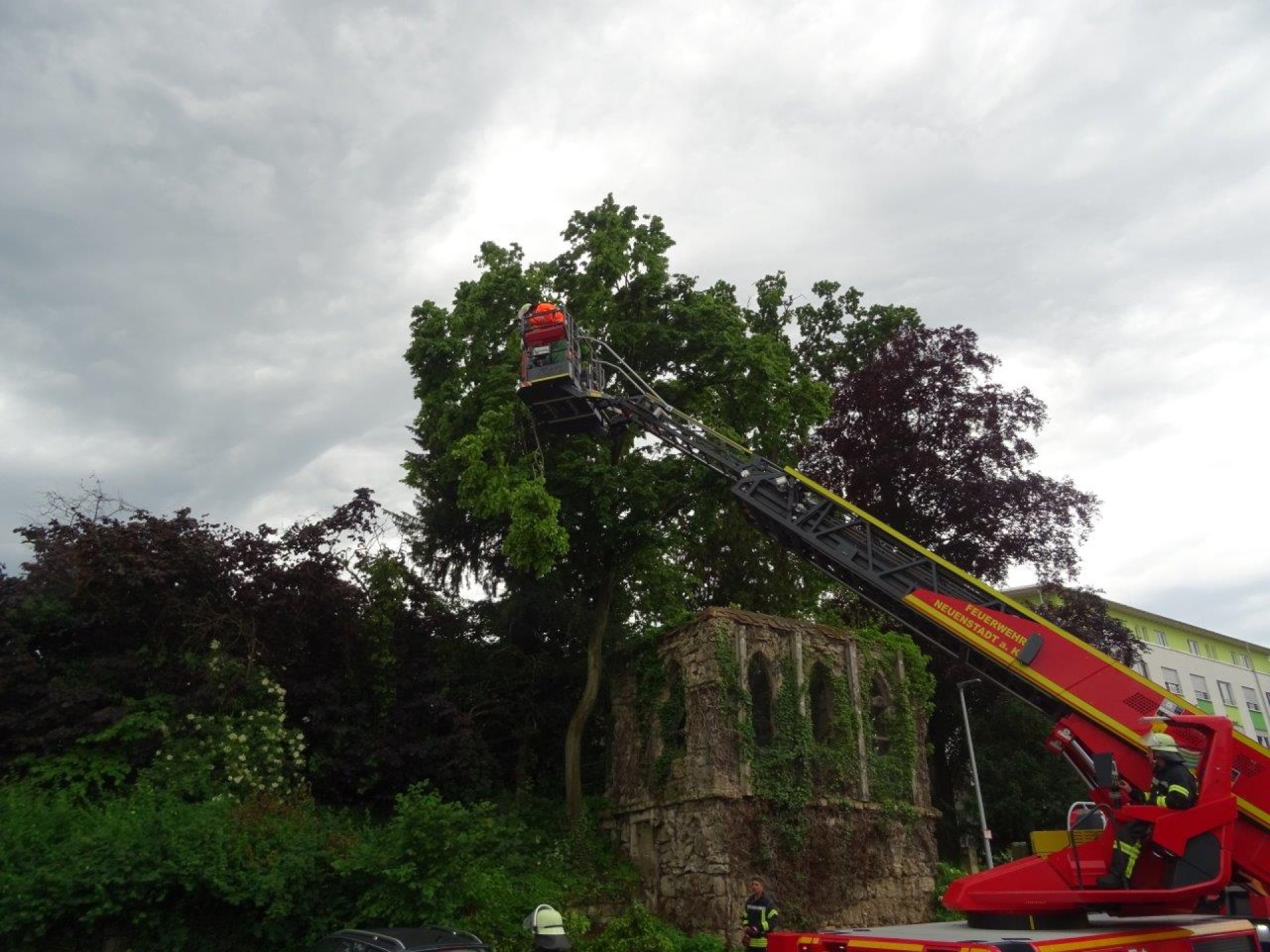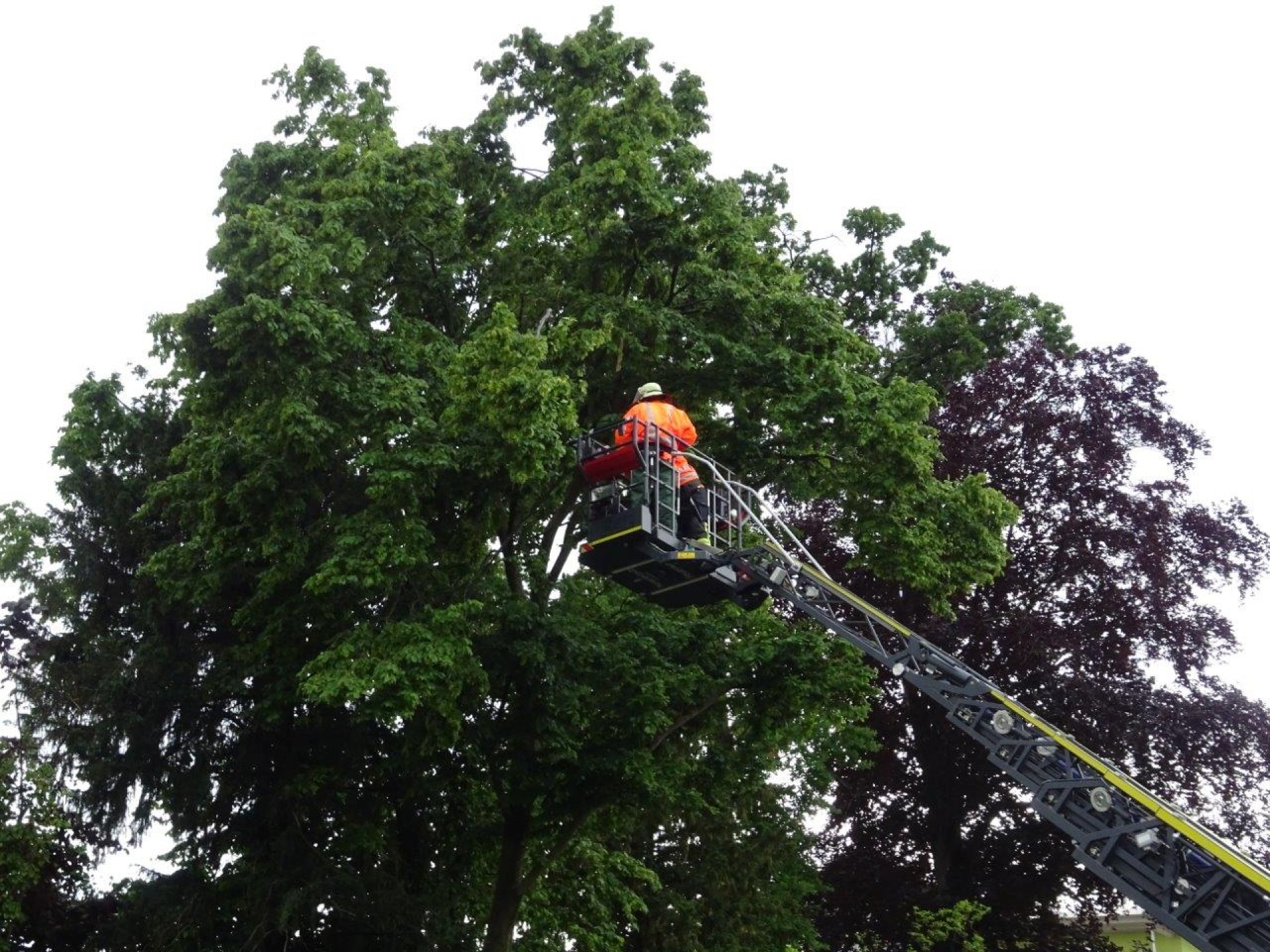 Infolge starken Winds war ein Ast von einem Baum auf einen geparkten PKW gefallen. Weitere Äste hingen lose im Baum. Die Feuerwehr sägte mit Hilfe der Drehleiter die betroffenen Äste ab und lagerte sie am Straßenrand.