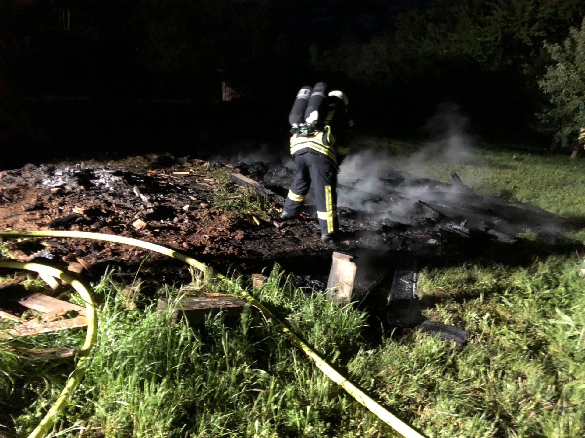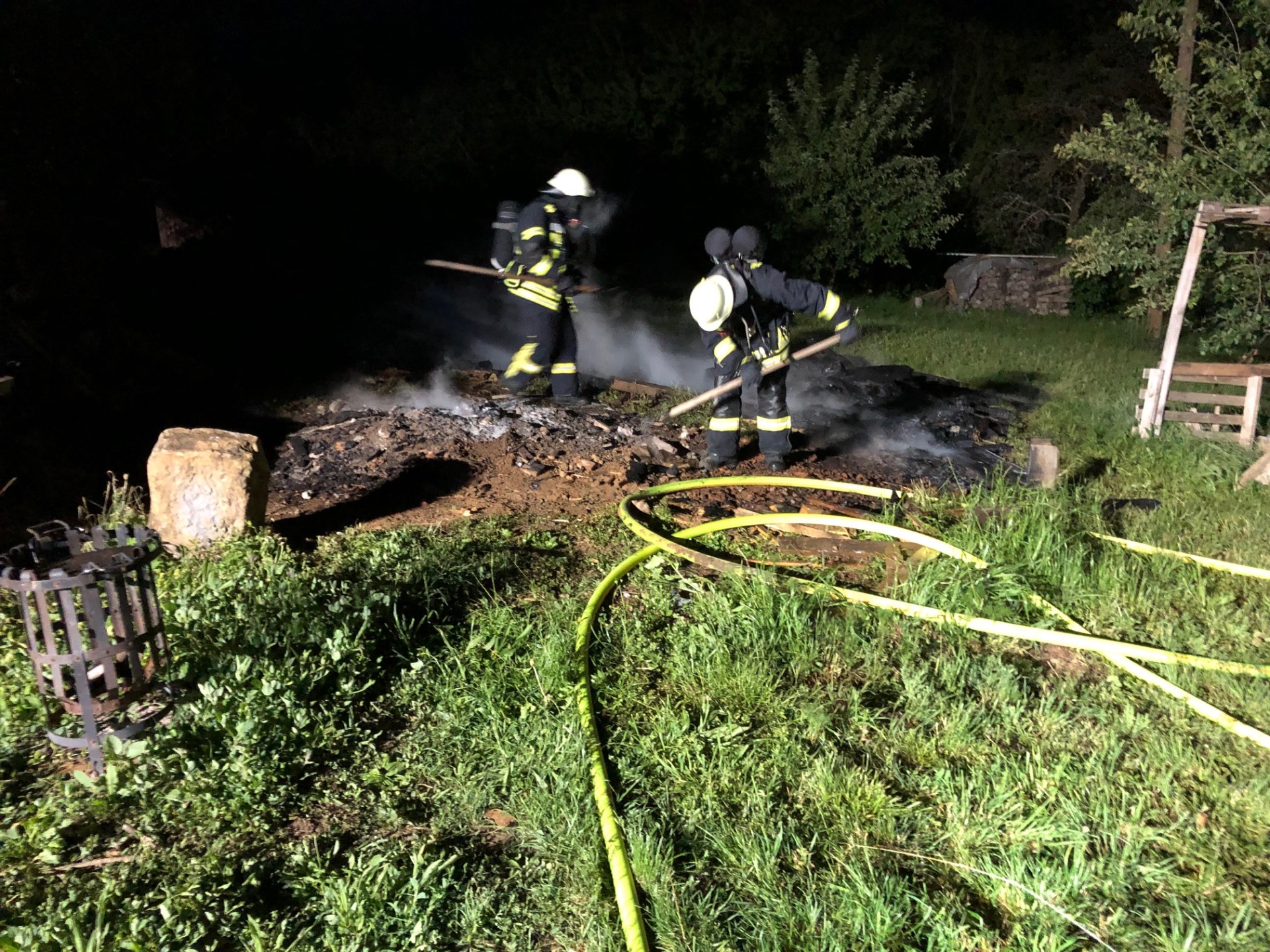 Die Lage des Brandortes war zunächst unklar, erst über einen Polizeihubschrauber konnte der Ort lokalisiert werden. Ein Brennholzstapel hatte sich entzündet und stand im Vollbrand.