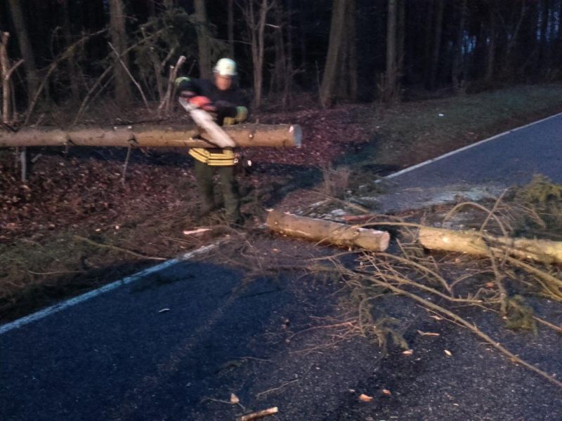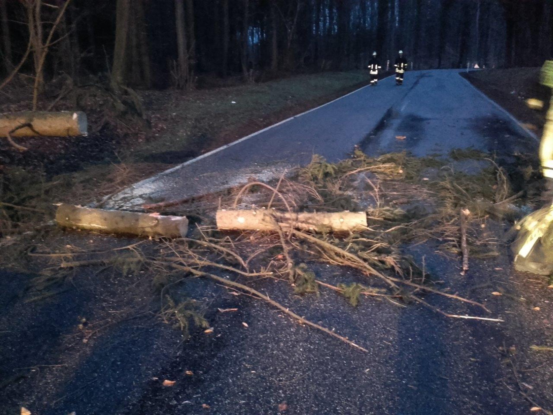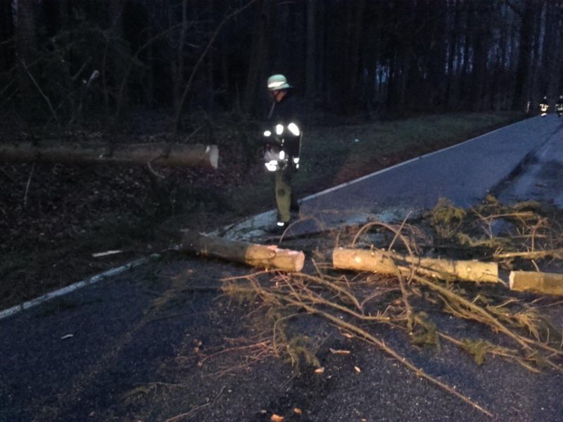 Beim Eintreffen stellten wir fest, dass eine Fichte infolge starken Winds umgefallen war und quer über die gesamte Straße lag.