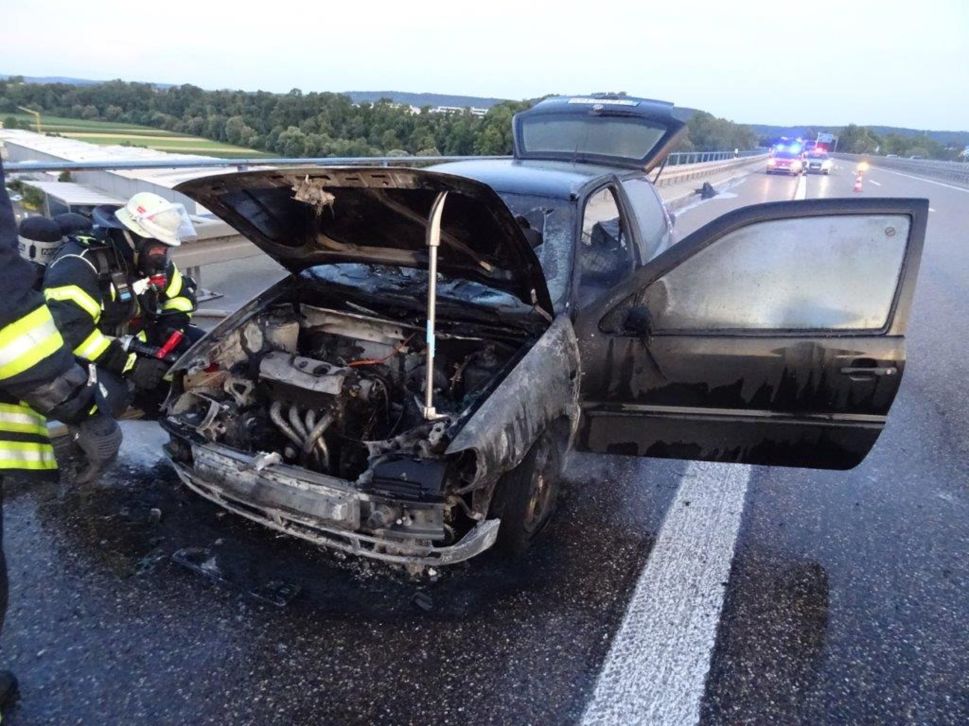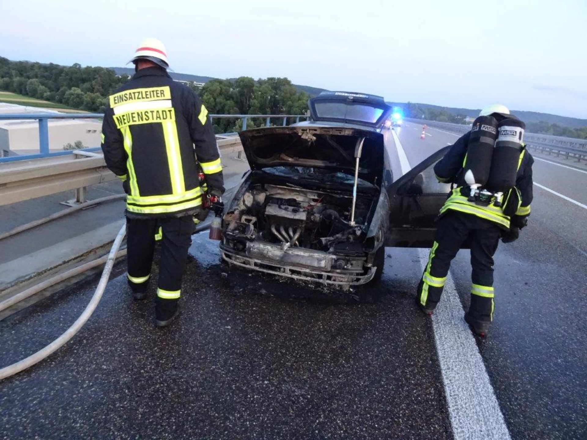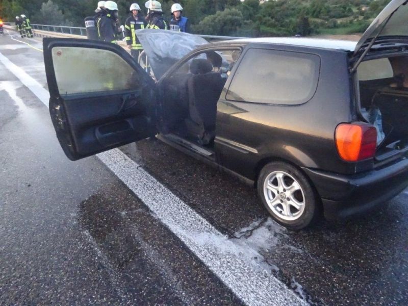 Auf der Kocherbrücke der A81, bei Neuenstadt, in Fahrtrichtung Würzburg war ein Pkw-Brand gemeldet.