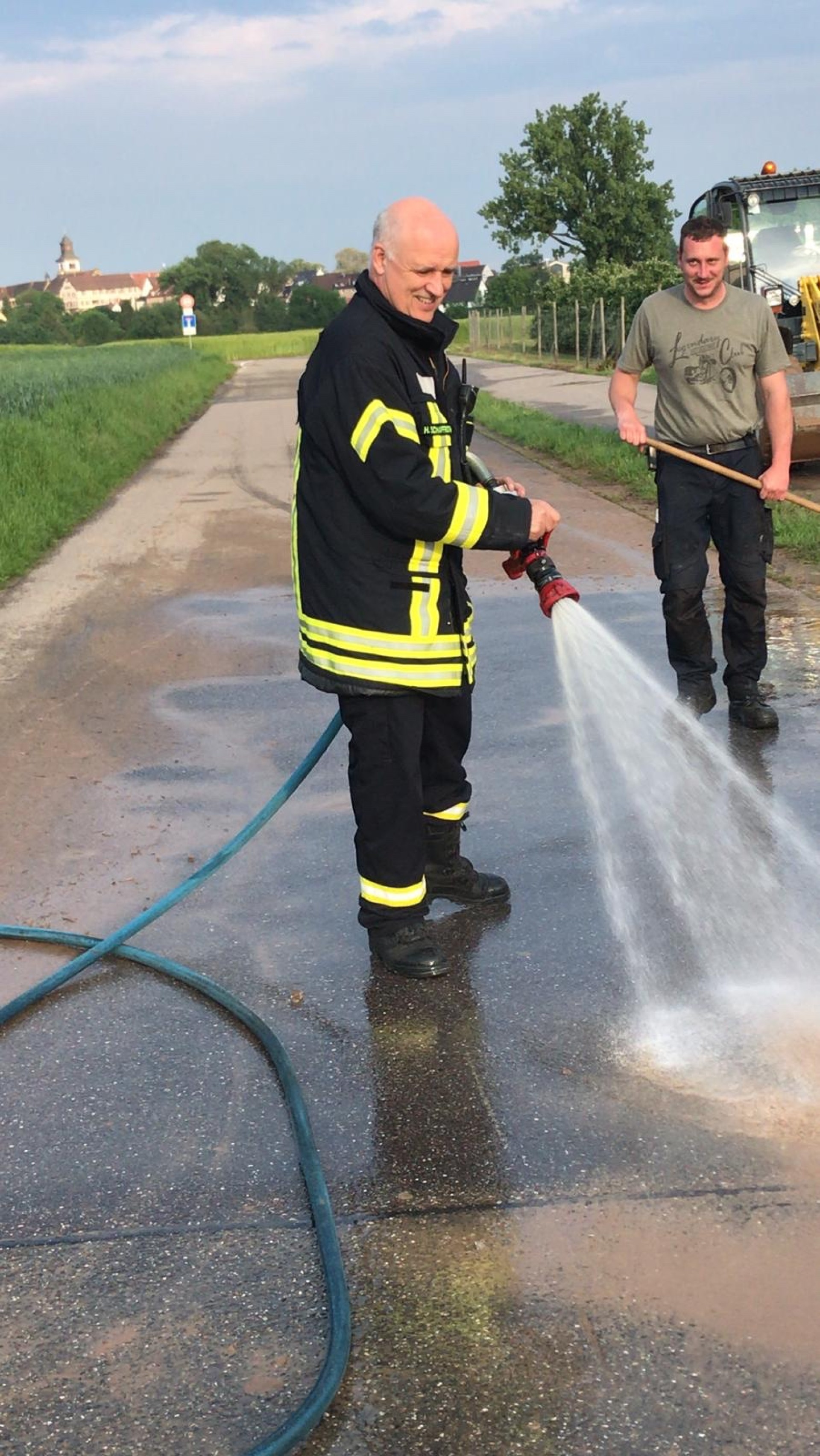 Gleichzeitig wurde die Gemeindeverbindungstrasse und der Radweg zwischen Kochertürn und Neuenstadt von ausgeschwemmter Erde aus den umliegenden Feldern verunreinigt. Mit dem Radlader aus dem Bauhof, sowie einem C-Rohr vom HLF wurden die Verunreinigungen beseitigt.