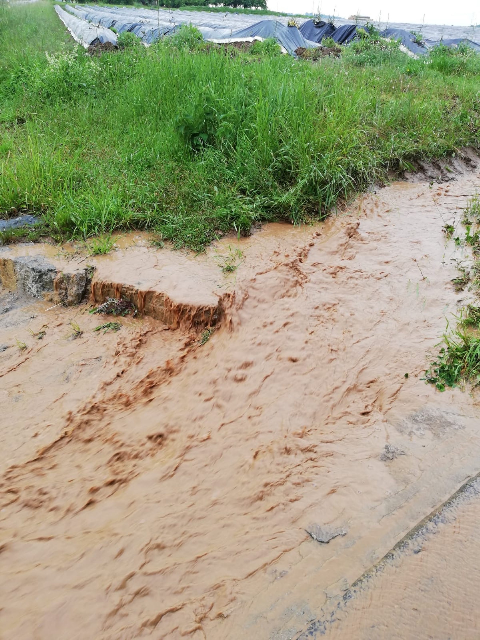 Nach einem Starkregen mit ca. 45 l/h fließt Oberflächenwasser aus einem Spargelacker auf die Züttlinger Straße L1095 in Richtung Bürg.
