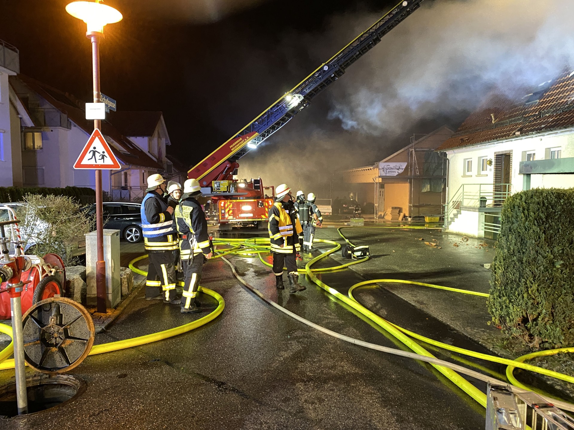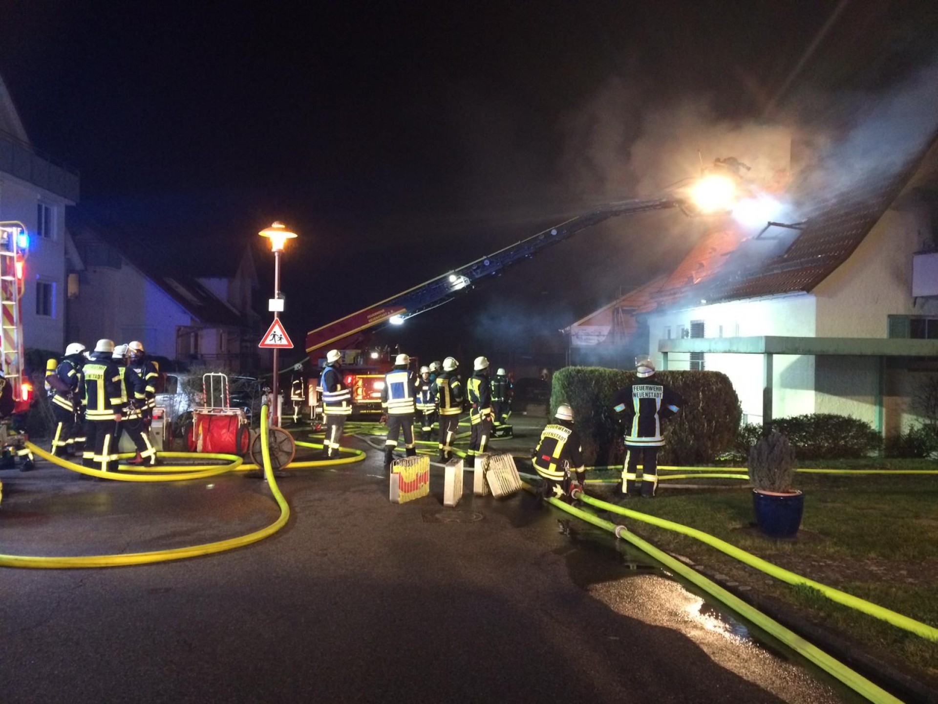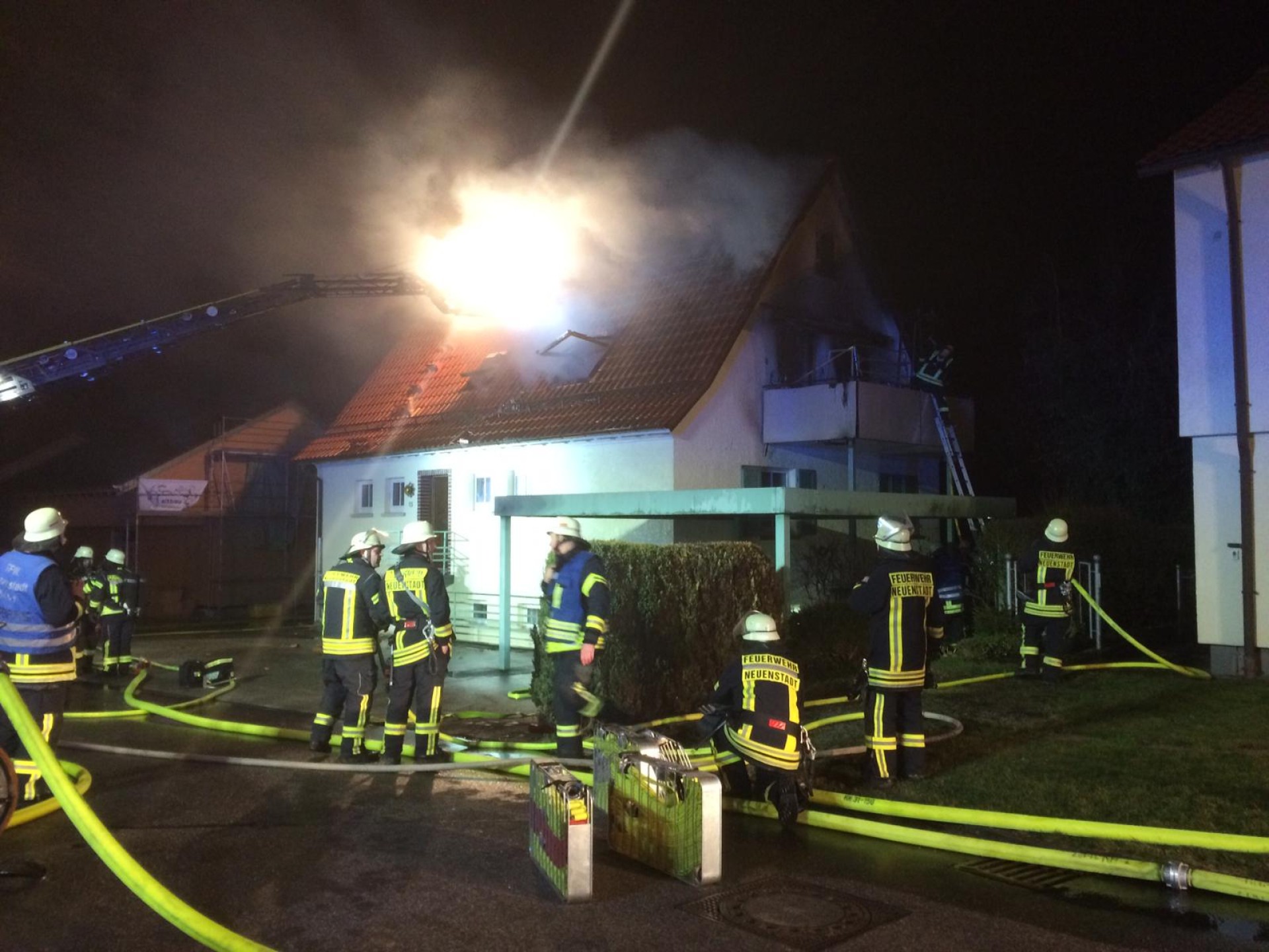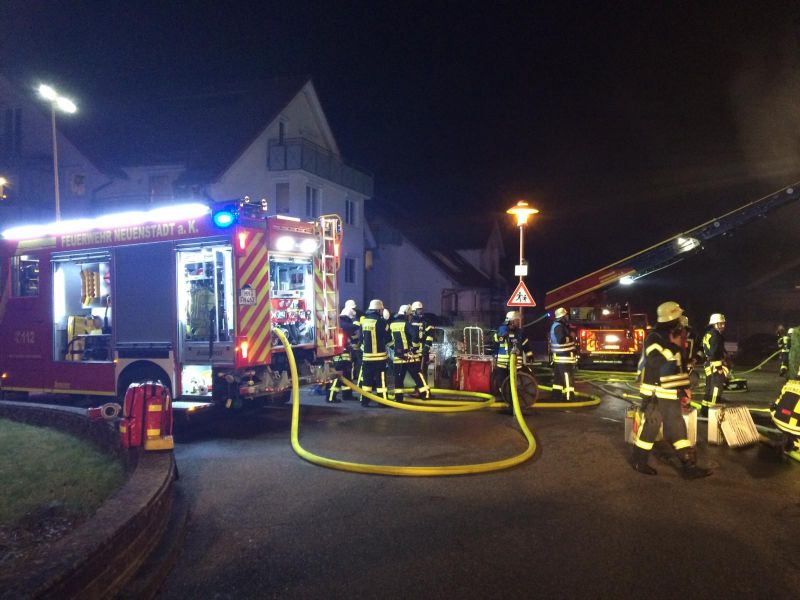 Das Feuerwehrhaus der Abteilung Neuenstadt liegt nur ca. 250 m vom Brandobjekt entfernt, daher traf der 1. Löschzug nach nur 5 Minuten am Brandort ein. Bei Eintreffen schossen aus den Dachflächenfenstern und aus der Balkontüre schon ungewöhnlich hohe und intensive Flammen hervor. Später stellte sich heraus, dass sich in der Wohnung eine Gasflasche befand, die über das Sicherheitsventil das Gas abströmte und zum Glück nicht explodierte.