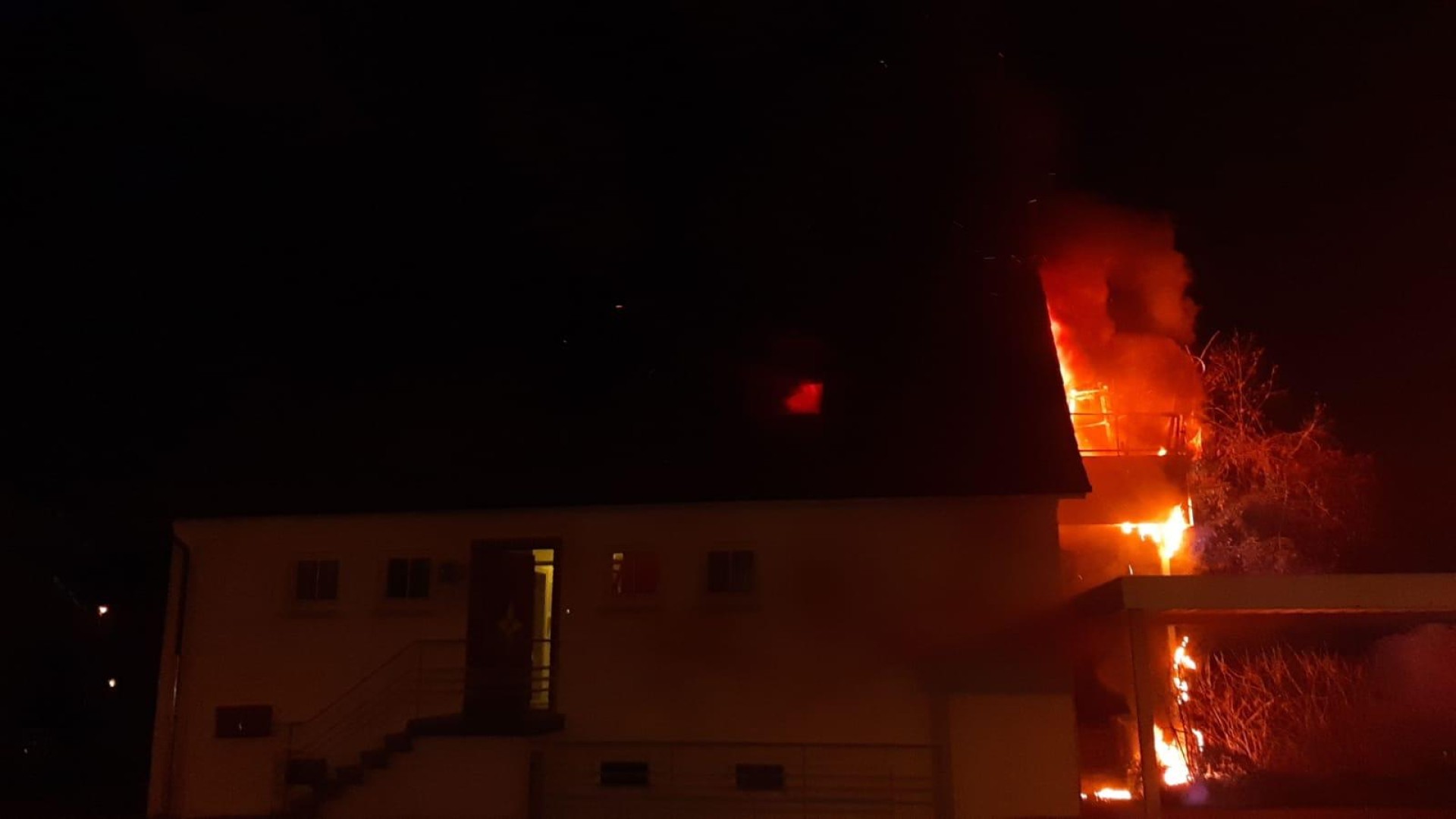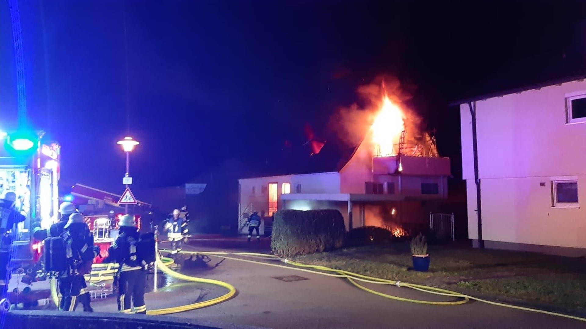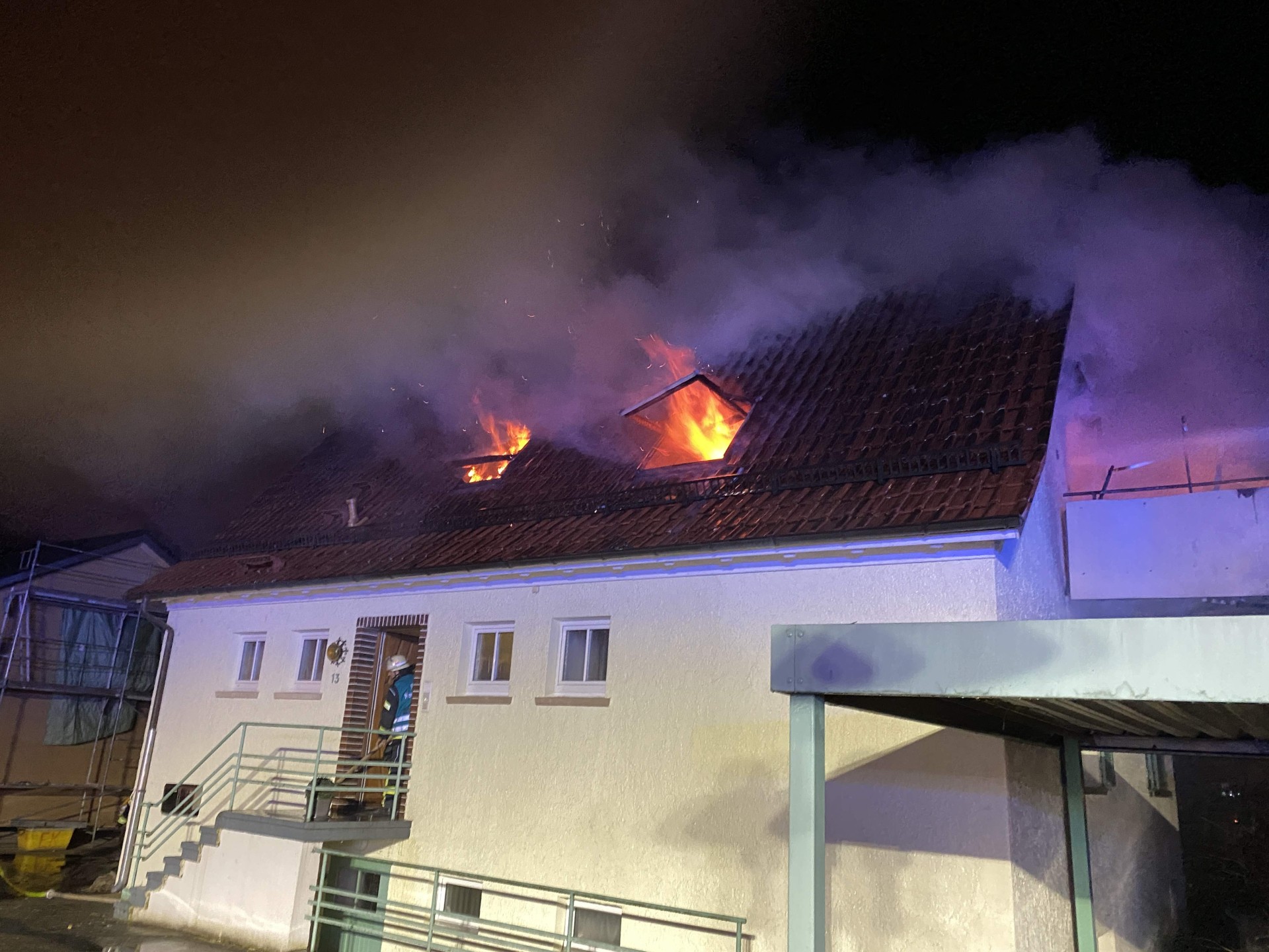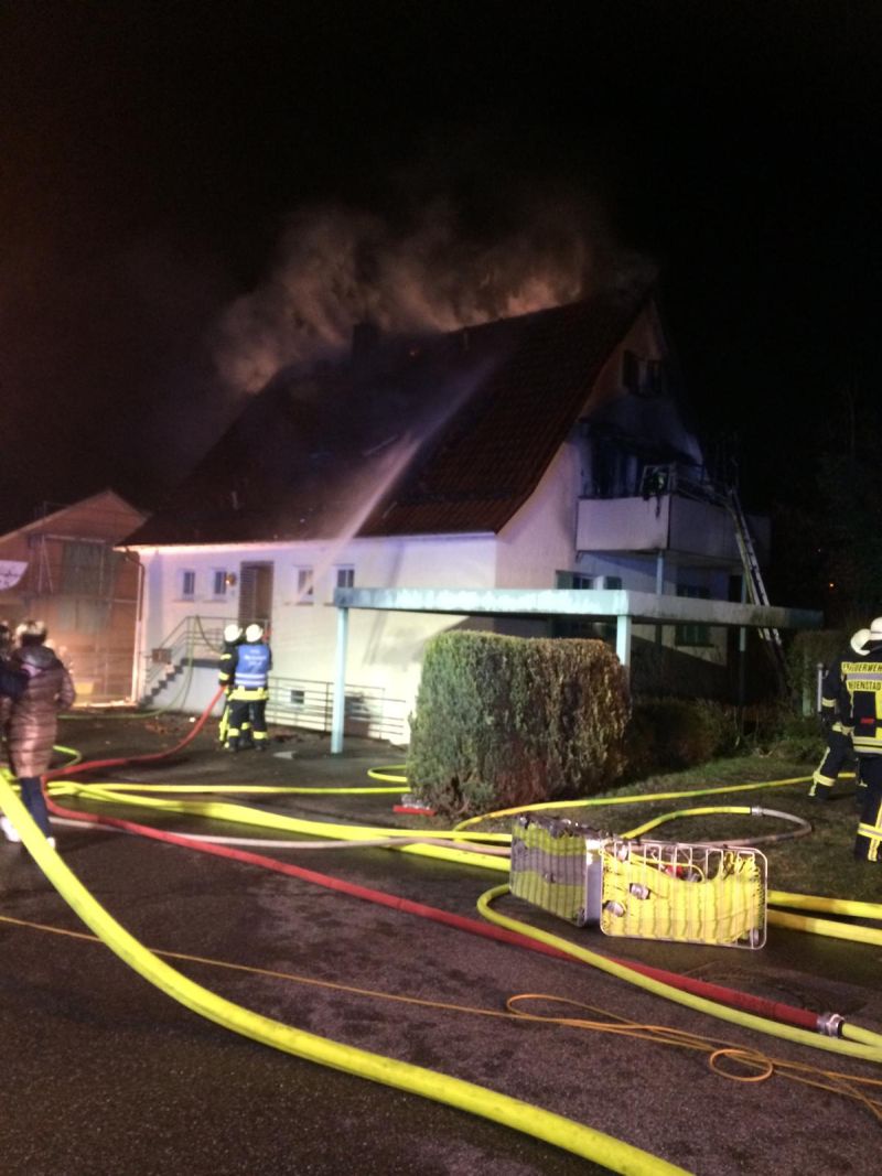 Das Feuerwehrhaus der Abteilung Neuenstadt liegt nur ca. 250 m vom Brandobjekt entfernt, daher traf der 1. Löschzug nach nur 5 Minuten am Brandort ein. Bei Eintreffen schossen aus den Dachflächenfenstern und aus der Balkontüre schon ungewöhnlich hohe und intensive Flammen hervor. Später stellte sich heraus, dass sich in der Wohnung eine Gasflasche befand, die über das Sicherheitsventil das Gas abströmte und zum Glück nicht explodierte.