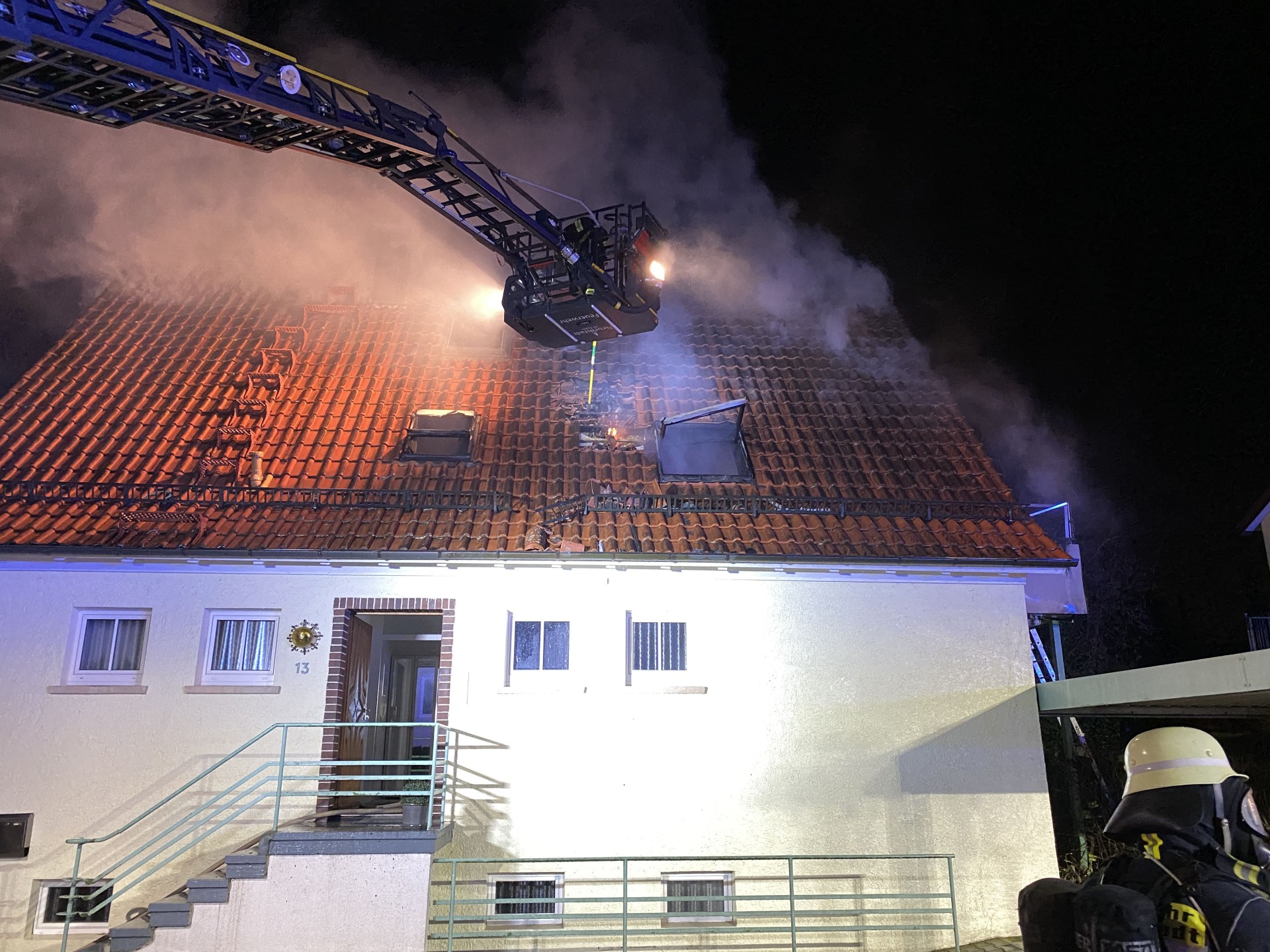 Die Brandbekämpfung erfolgte über 2 Trupps unter PA, über das Treppenhaus ins 1. Obergeschoss und ins Dachgeschoß und parallel über den Balkon. So konnte sehr schnell der Hauptbrand gelöscht werden. Aber unter der in großen Teilen noch intakten Bedachung breitete sich der Brand weiter aus, sodass die Ziegel vom Drehleiterkorb aus entfernt werden mussten um alle Brandnester vollständig ablöschen zu können. Gleichzeitig wurde von Innen die Holzverschalung mit der Rettungssäge entfernt. An der Straße abgewandte Seite des Gebäudes war der Zugang zum Dach nur mittels des Gelenkarms der Drehleiter und über eine Schiebleiter möglich. Die Nachlöscharbeiten konnten gegen 23:30 Uhr abgeschlossen werden. Da während des gesamten Einsatzes meist nur unter PA gearbeitet werden konnte, wurden die in den Fahrzeugen vorhanden Atemschutzgeräte vollständig aufgebraucht, daher wurden aus dem GW-Atemschutz Ersatzgeräte zur Verfügung gestellt. Eine Brandwache blieb mit einem LF für etwaige Nachlöscharbeiten bis 7.00 Uhr am Sonntagmorgen vor Ort.