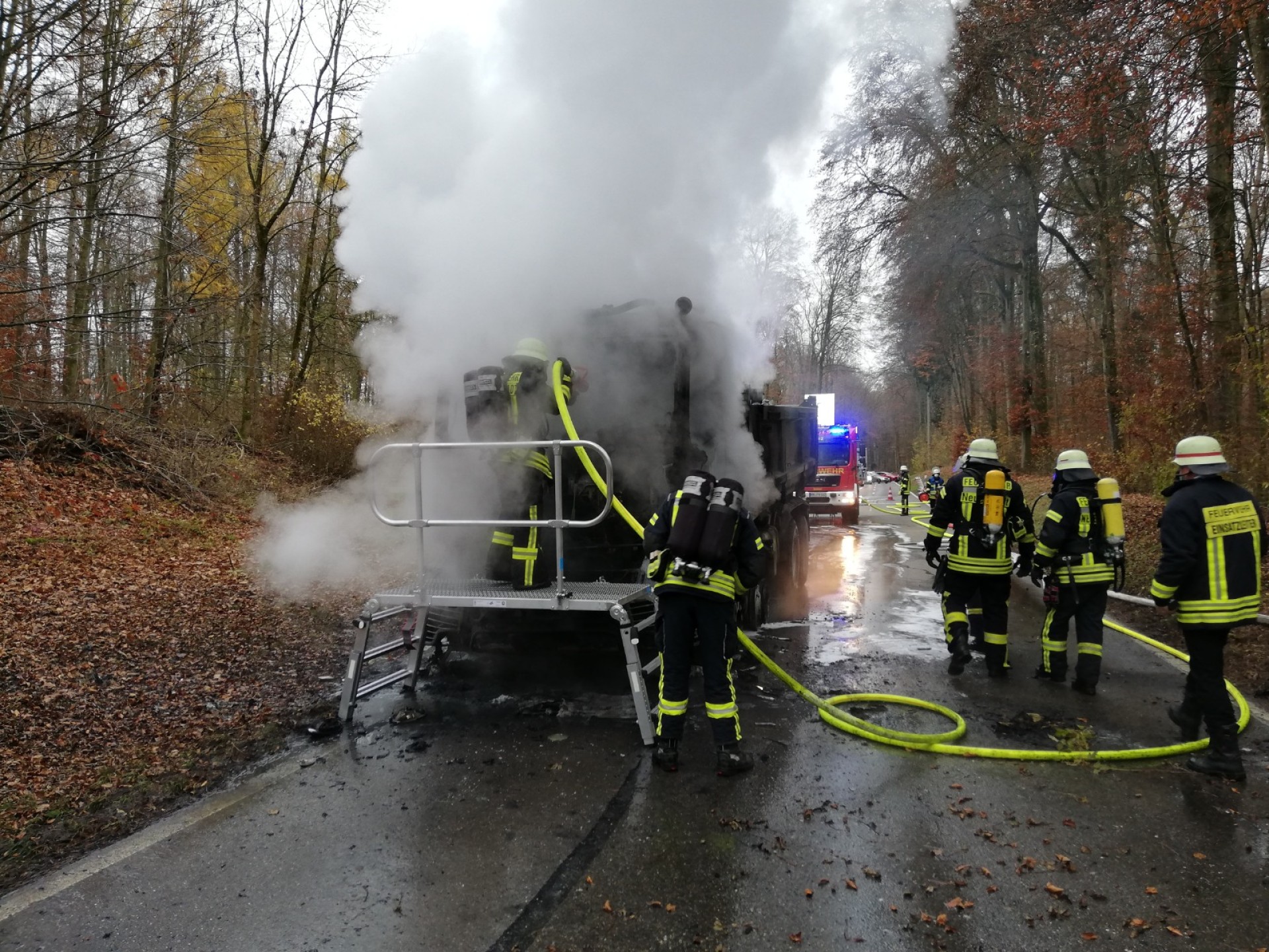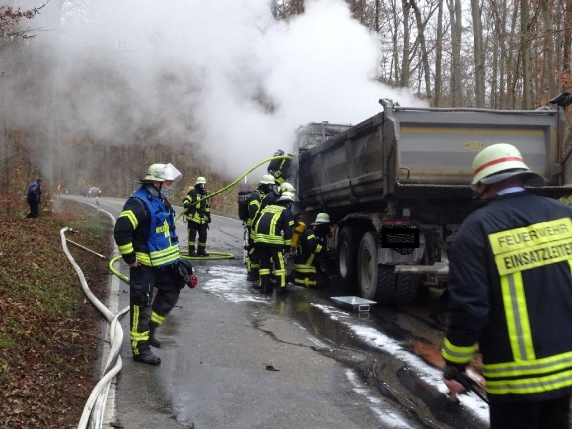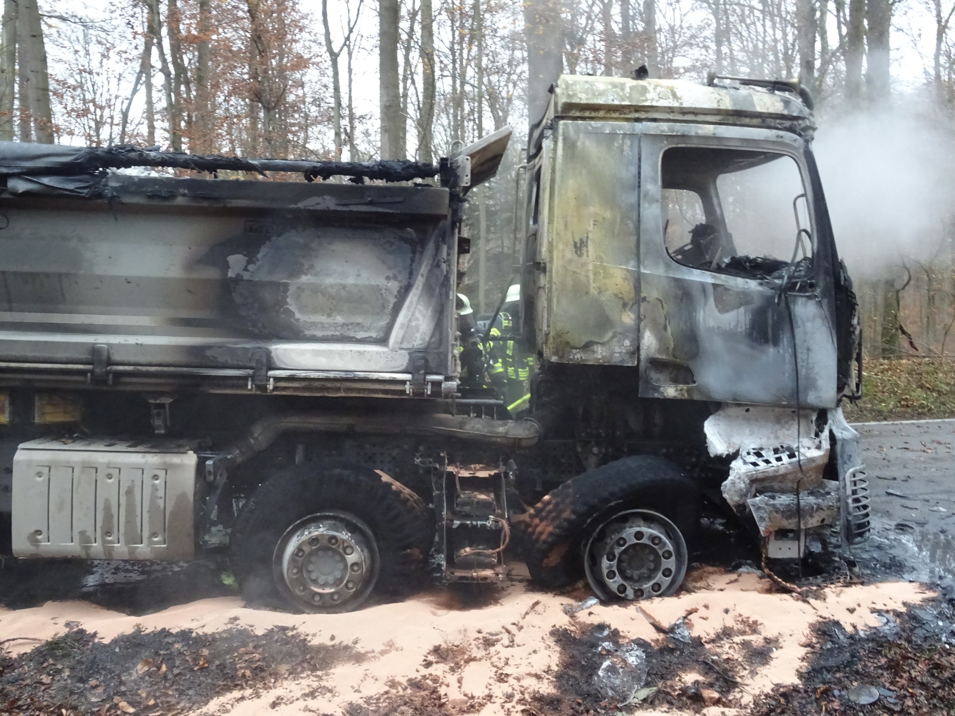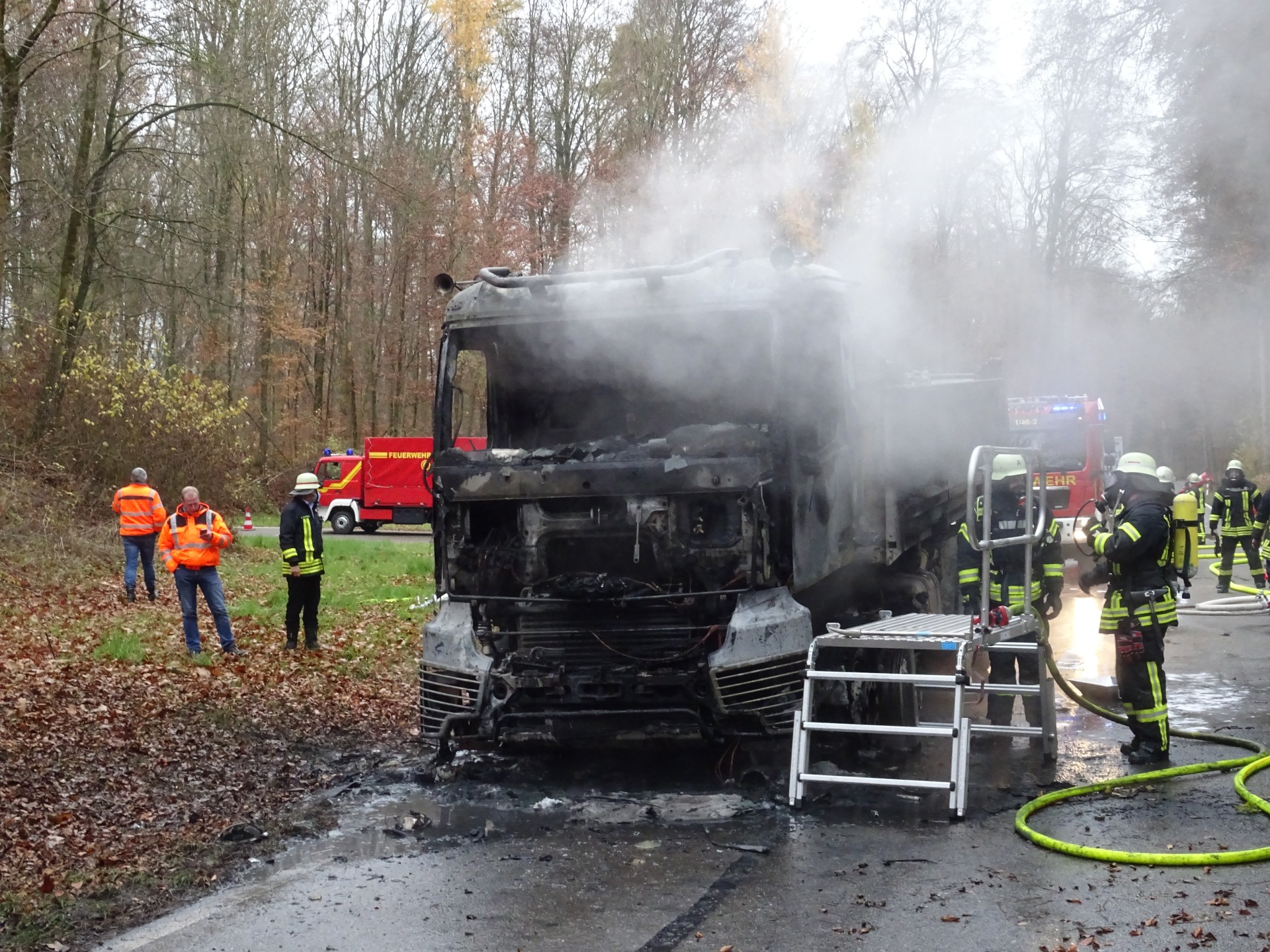 Beim Vorrücken der Feuerwehr zur Brandbekämpfung platzen zwei weitere Reifen, sowie der Hydrauliktank. Auch die Kraftstoffleitung aus dem Dieseltank war abgebrannt, so dass der auslaufende Diesel zusammen mit dem ausgelaufen Motorenöl dem Feuer reichlich Nahrung bot.