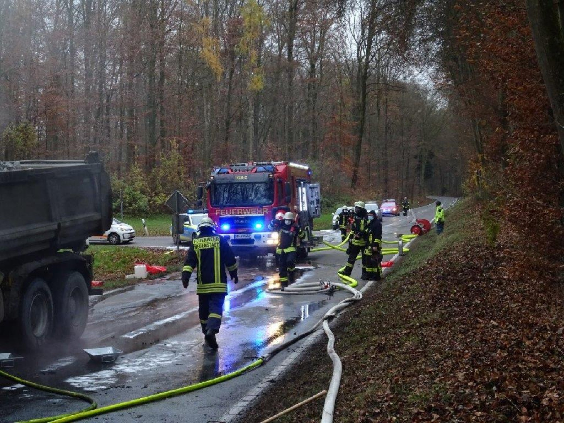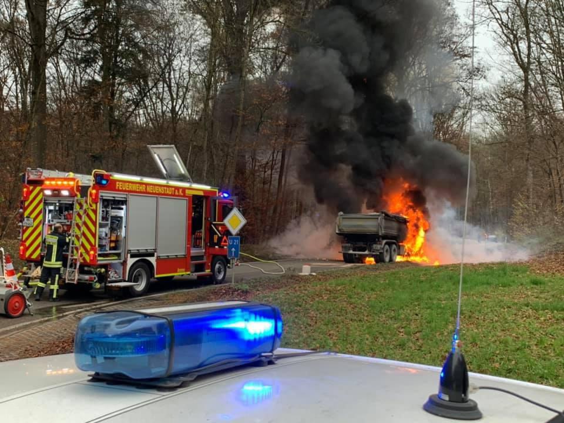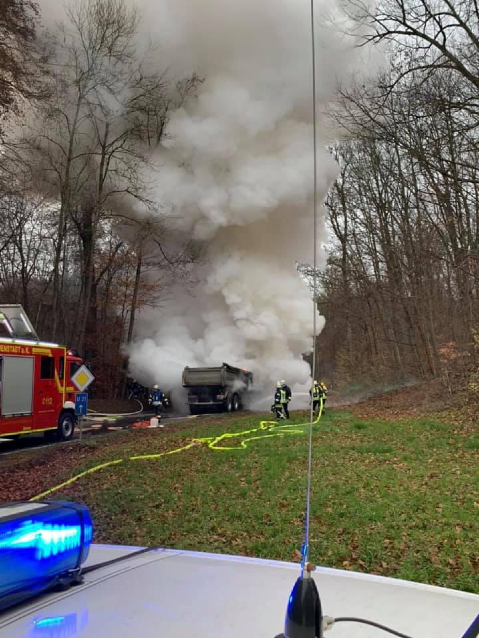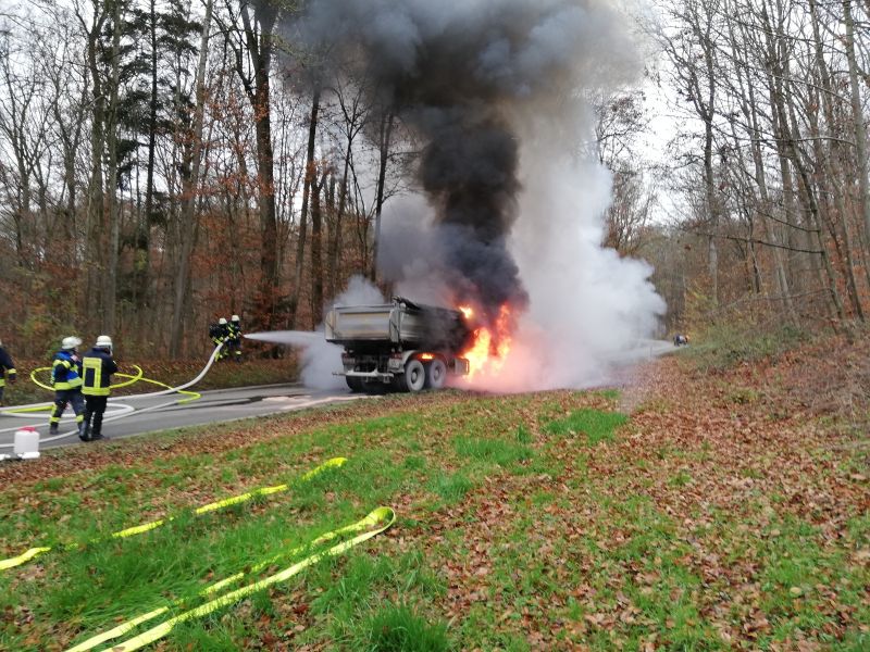 Die Feuerwehr Neuenstadt wurde zu einem LKW-Brand auf die L1095 zwischen Bürg und Züttlingen alarmiert. Das Fahrerhaus und der Motor brannten beim Eintreffen des Löschzugs bereits in voller Ausdehnung. Zwei LKW-Reifen der Vorderachse waren bereits auf Grund der enormen Hitze geplatzt und verteilten sich brennend am Waldrand. Der Fahrer des mit Steinen beladenen Kippers konnte sich rechtzeitig in Sicherheit bringen.