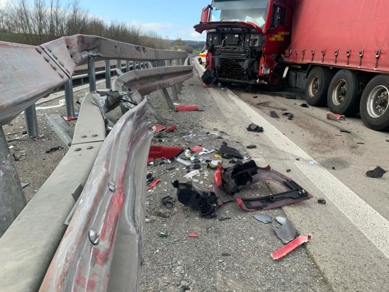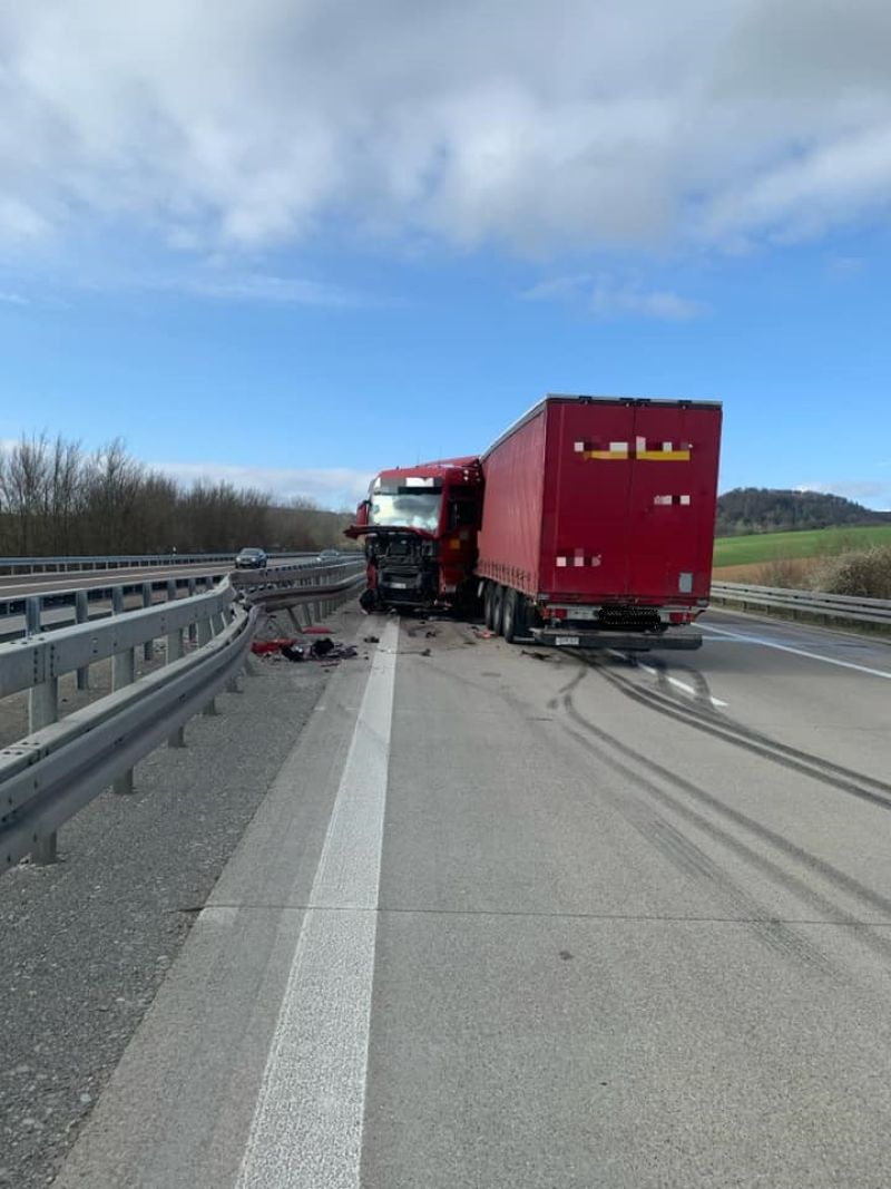 Ein LKW mit Auflieger musste eine starke Bremsung durch führen und zog dabei auf die linke Fahrspur. Er krachte dabei in die Leitblanke, wodurch die Zugmaschine sich drehte und entgegen der Fahrtrichtung zum Stehen kam. Aus dem Fahrzeug traten Betriebsstoffe aus, die von der Feuerwehr aufgenommen wurden. Die Fahrbahn wurde noch abgestreut und abgekehrt, anschließend die Einsatzstelle an die Polizei übergeben.