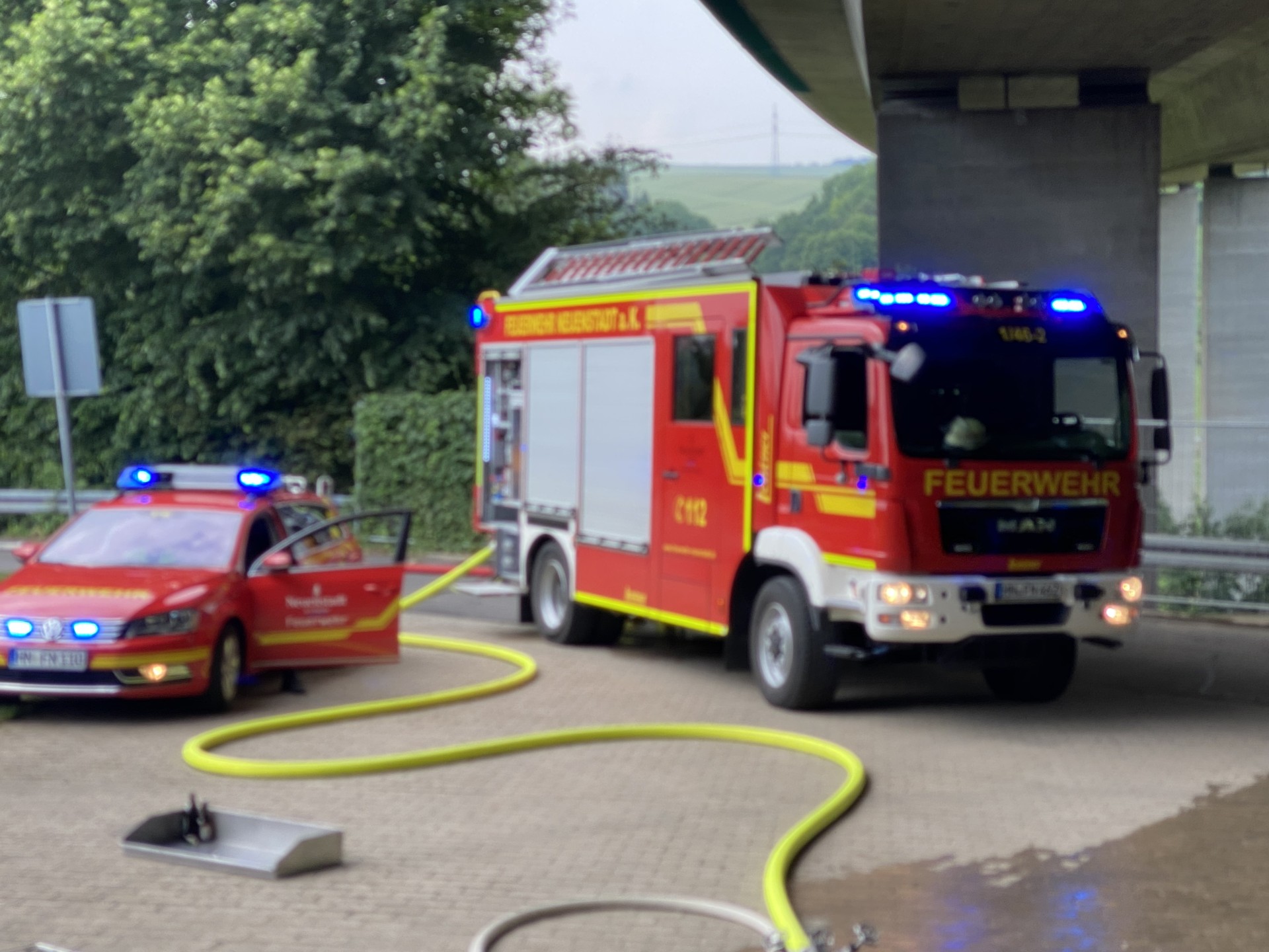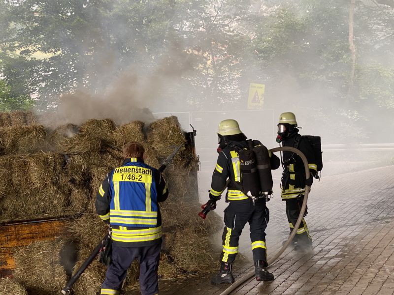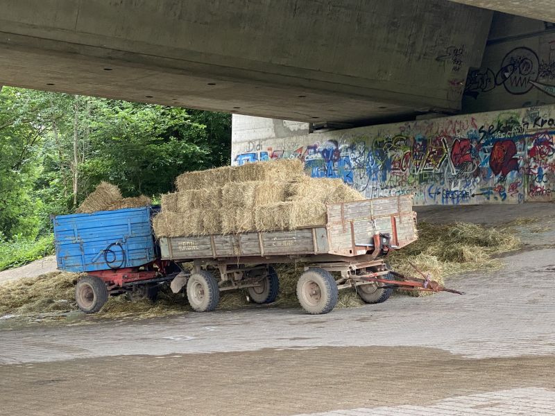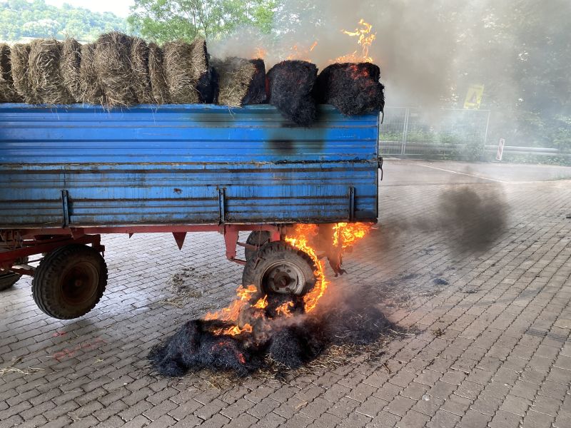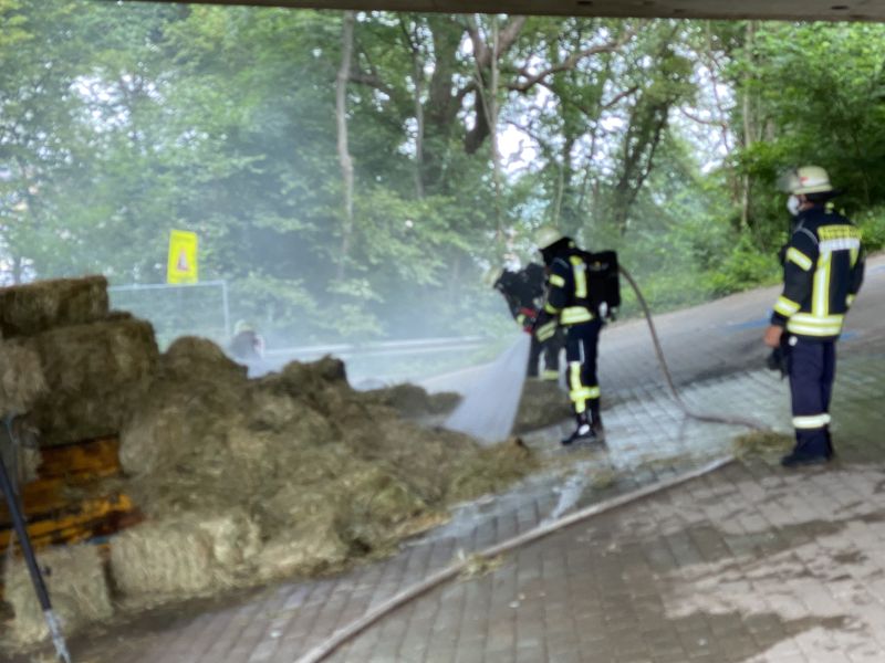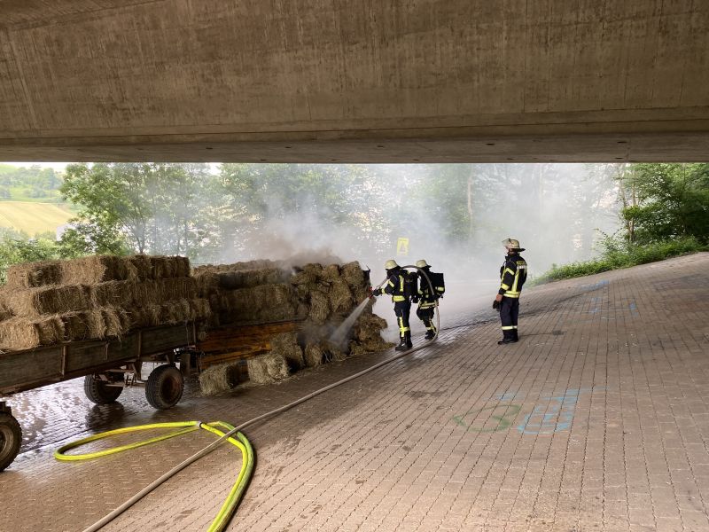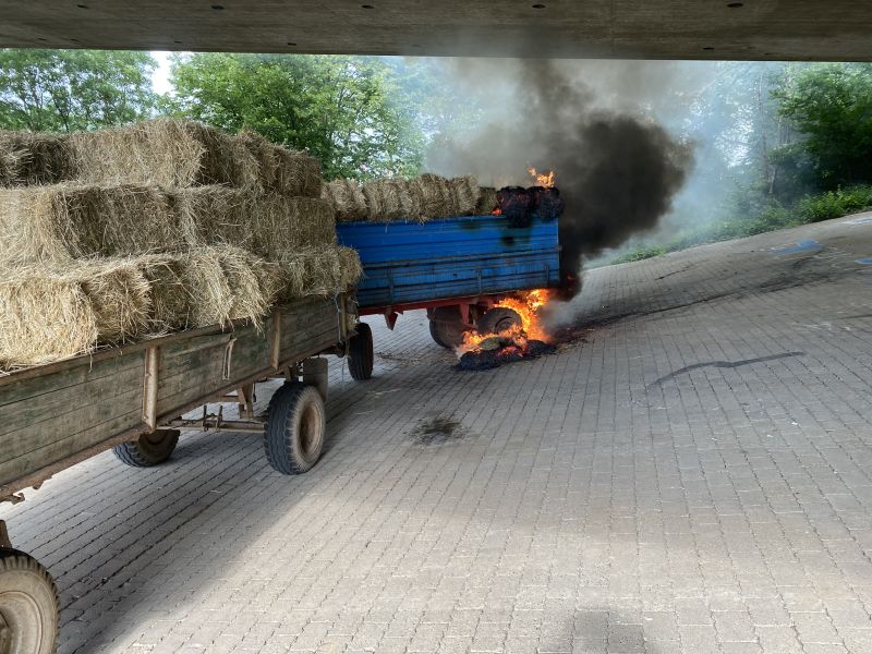 Zwei landwirtschaftliche Anhänger im Zug verbunden, standen mit frischen Heuballen beladen unter der Autobahnbrücke der A81, in Verlängerung der Industriestraße. An der Hinterseite des Anhängers brannte die Ladung mit Heuballen, der Anhängerreifen brannte ebenfalls. Vermutlich hatte er sich durch herabfallende Heuballen entzündet. Der Abstand zur Unterkante der Autobahnbahnbrücke beträgt an dieser Stelle nur wenige Meter, sodass ein ausgedehnter Brand die Struktur der Betonkonstruktion beschädigen könnte. Der Brand konnte jedoch sehr schnell gelöscht werden, da die Wasserversorgung durch Hydranten in diesem Bereich gegeben war. Die Ladung wurde mittels Dunghacken vom Hänger heruntergezogen und großflächig verteilt, um alle Glutnester ablöschen zu können. Polizei und Besitzer des Anhängerzugs wurden verständigt und zur Einsatzstelle angefordert.