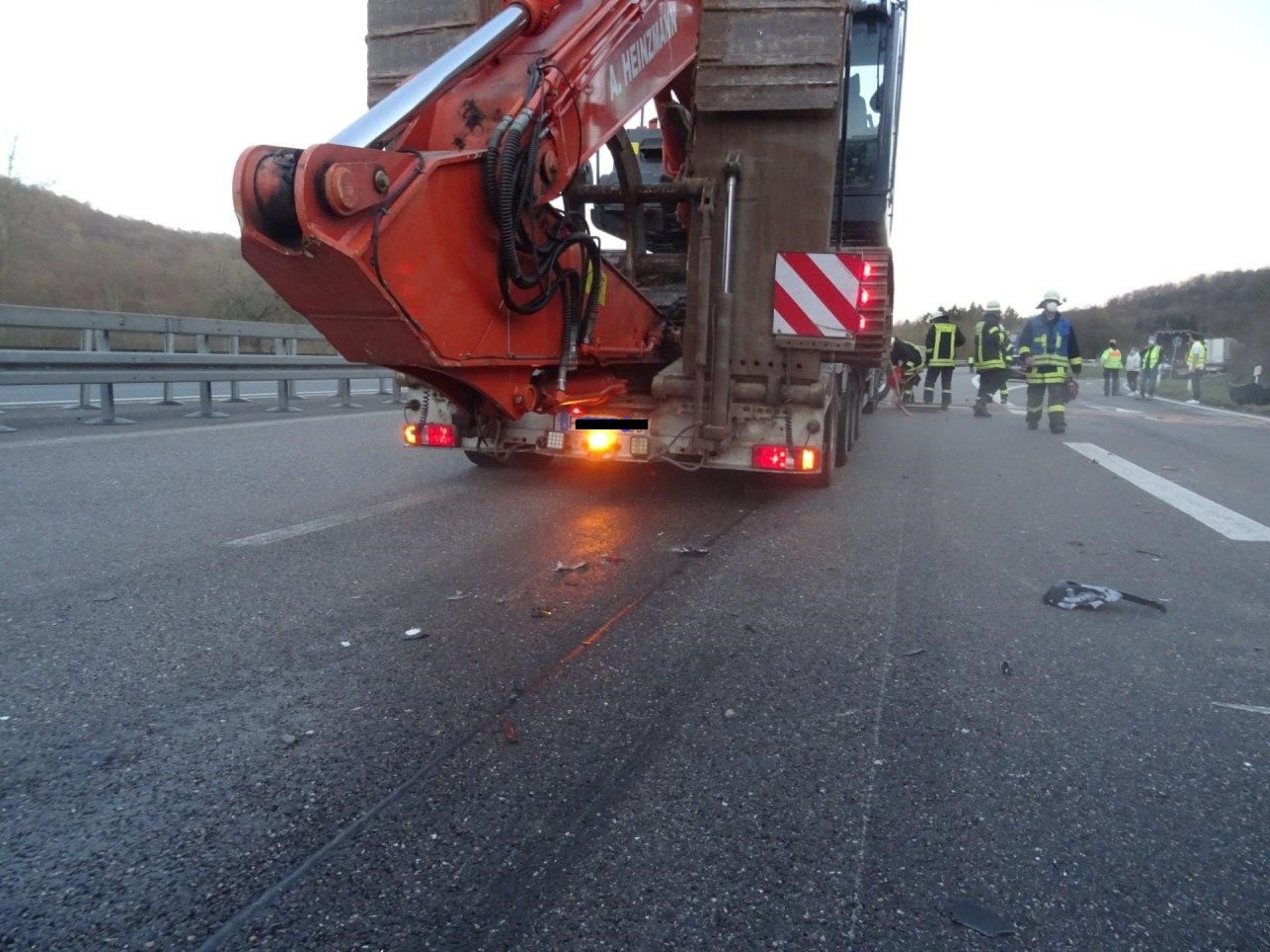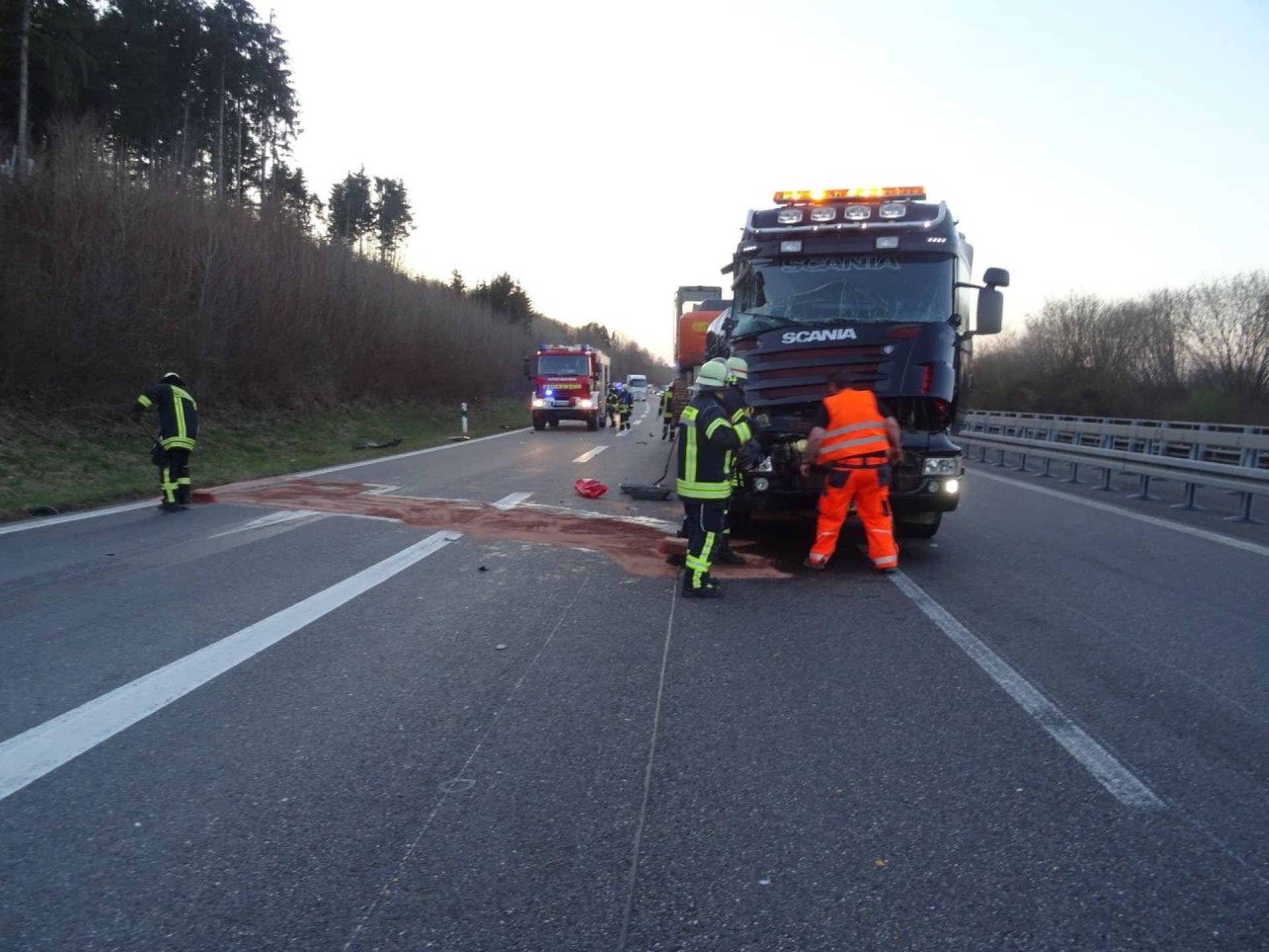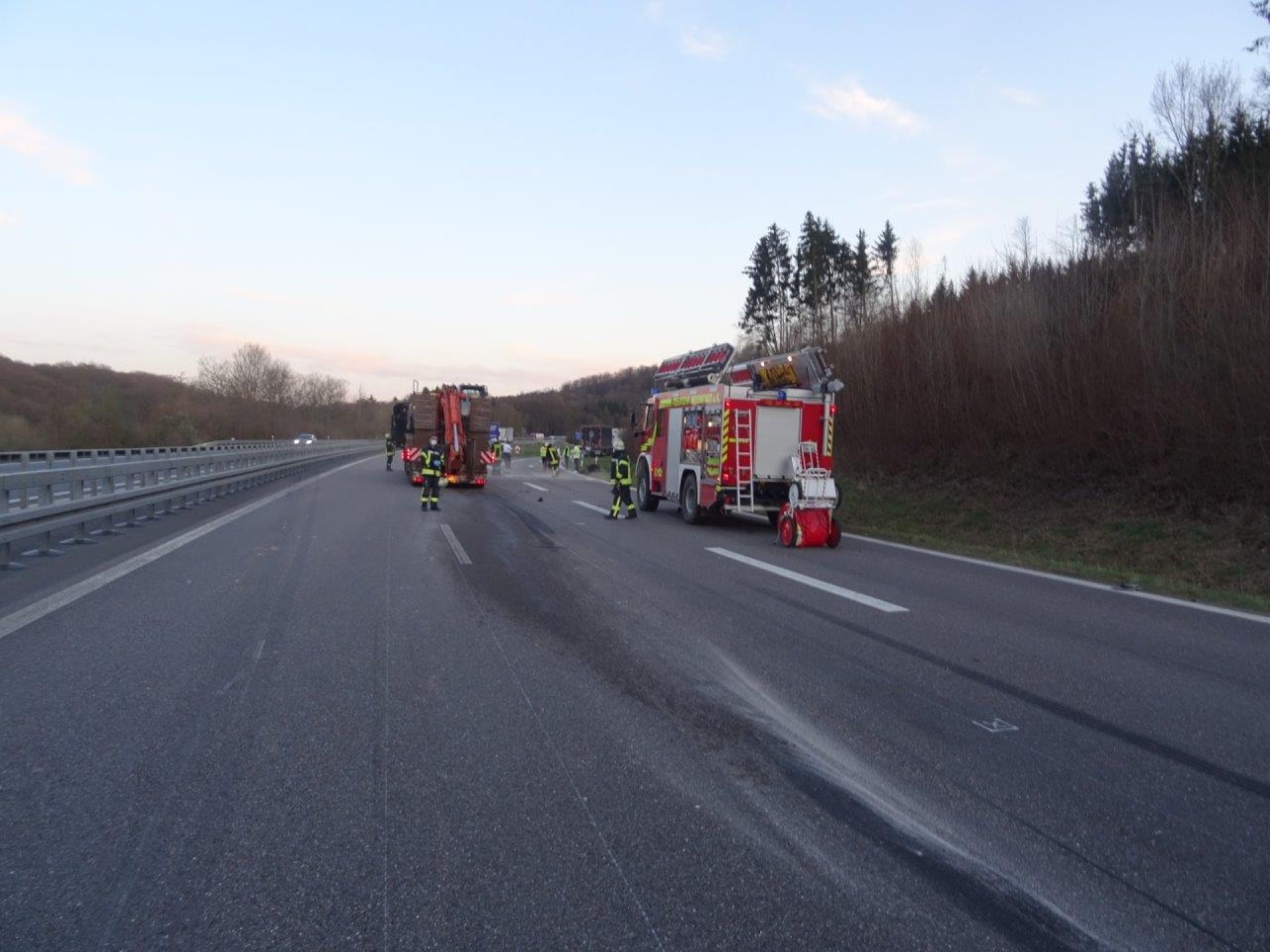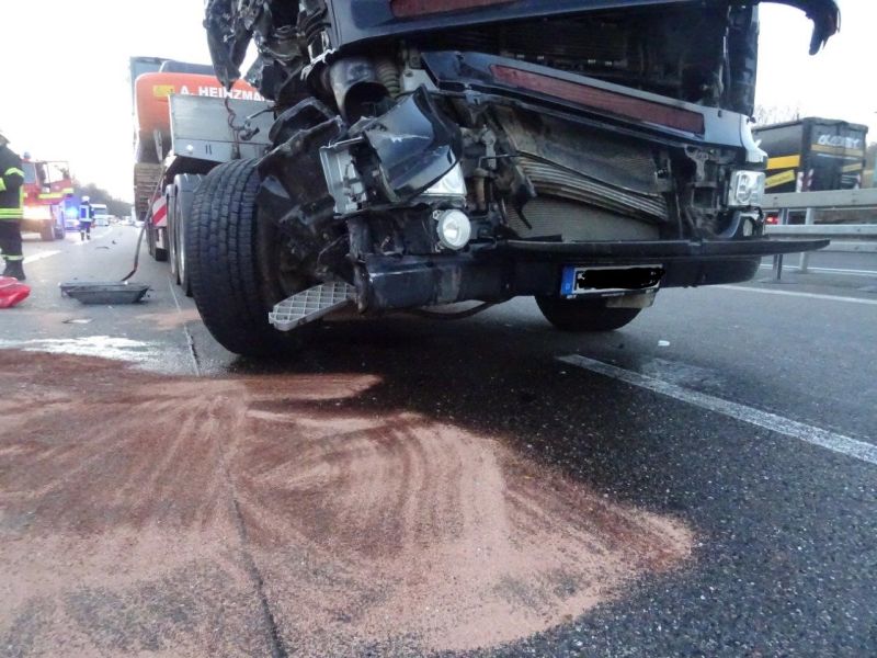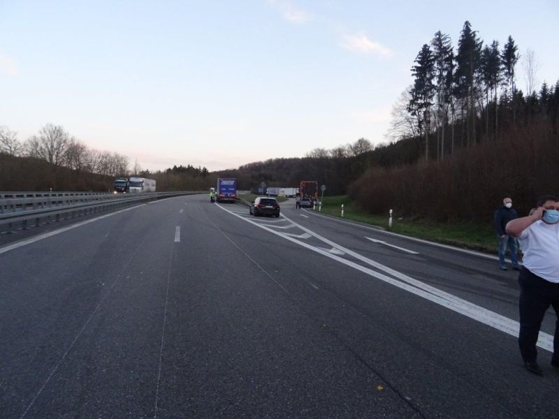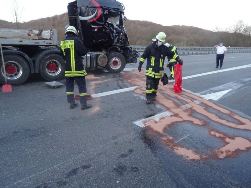 Aus dem Hydrauliktank eines LKWs trat Hydrauliköl aus, nachdem der LKW zuvor auf einen weiteren LKW aufgefahren war. Da dadurch beide Spuren blockiert waren, wurde der LKW mittels Seilwinde des HLF auf den Parkplatz gezogen. Die Fahrbahn wurde von der Feuerwehr abgestreut und abgekehrt, anschließend die Einsatzstelle an die Polizei übergeben.