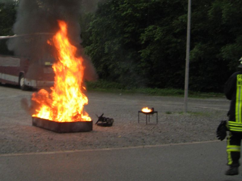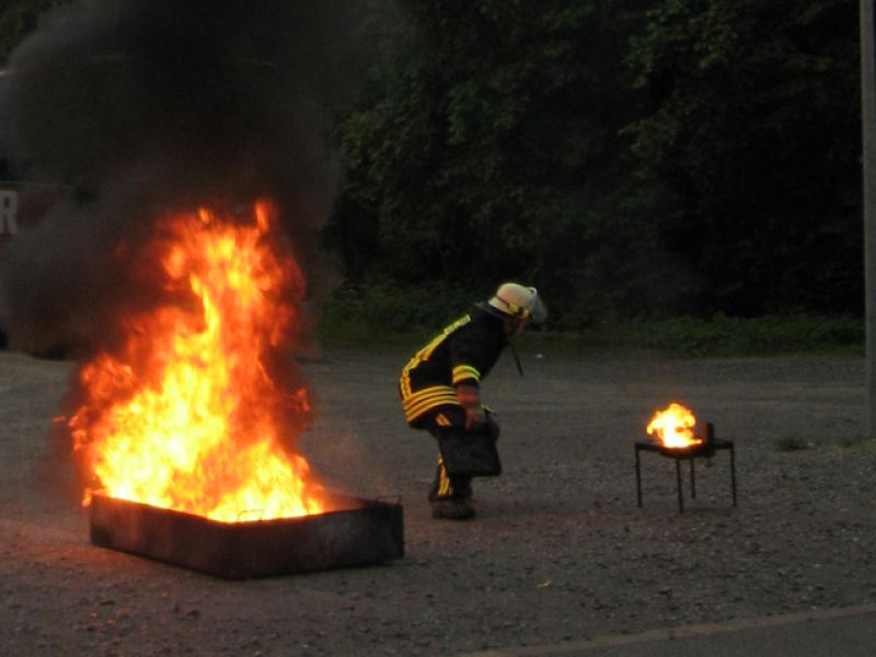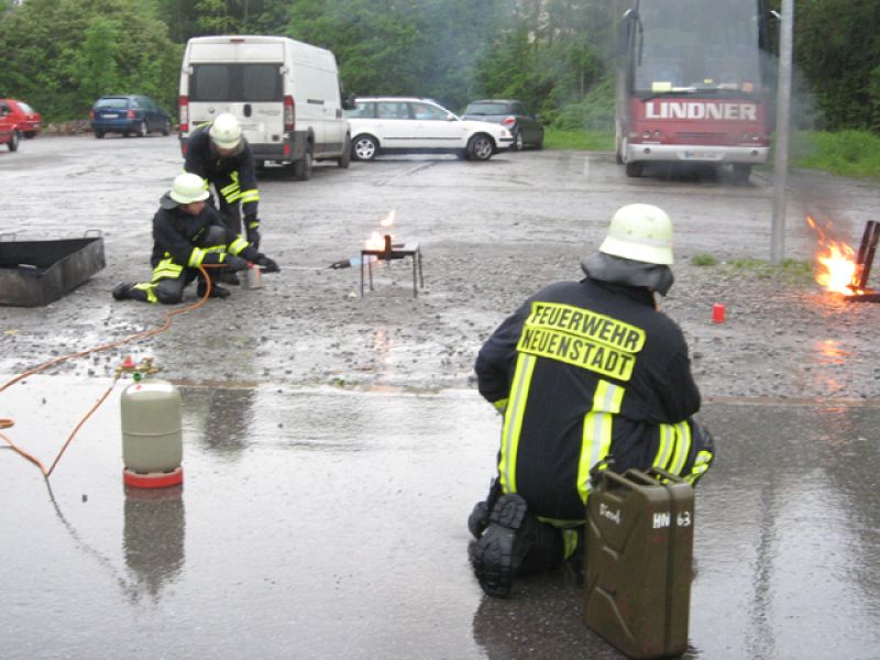 Trotz strömendem Regen veranstaltete die Feuerwehr Neuenstadt am Freitag, dem 15. Mai 2009 eine Brandschutzerziehung für die Mitarbeiter der diakonischen Bezirksstätte. Den Mitarbeitern wurde die Funktionsweise eines Feuerlöschers sowie die korrekte Anwendung eines solchen im Brandfall theoretisch erklärt. Später durften die Besucher die Feuerlöscher im praktischen Teil selbst ausprobieren und hiermit einen Dieselbrand löschen. Unter Beobachtung der Feuerwehr wurden den Probanten hierbei geeignete Tipps und Hilfestellungen gegeben. Weiterhin wurde eine Fettexplosion sowie die Explosion einer Spraydose bei Überhitzung vorgeführt. Die Veranstaltung machte allen Teilnehmern großen Spaß und weckte starkes Interesse, was sich durch einen lauten Applaus auszeichnete.