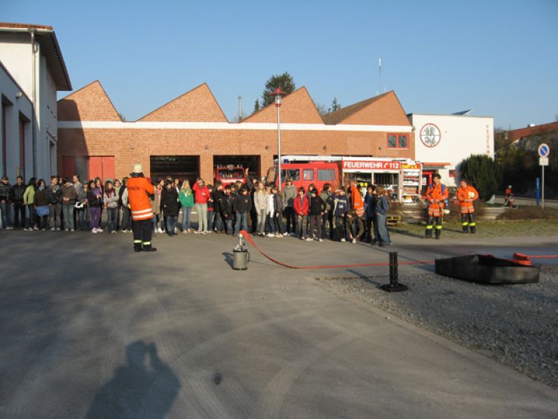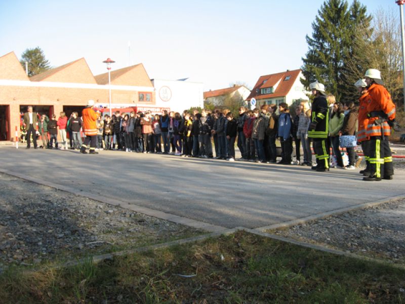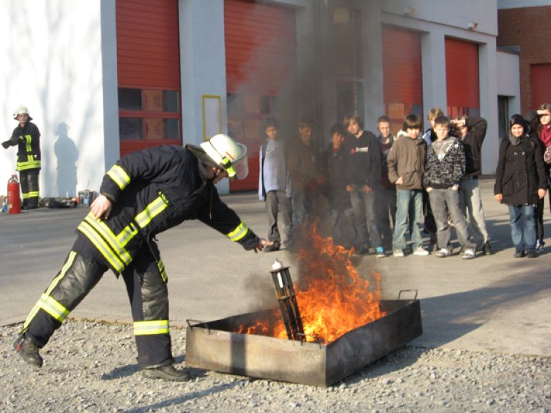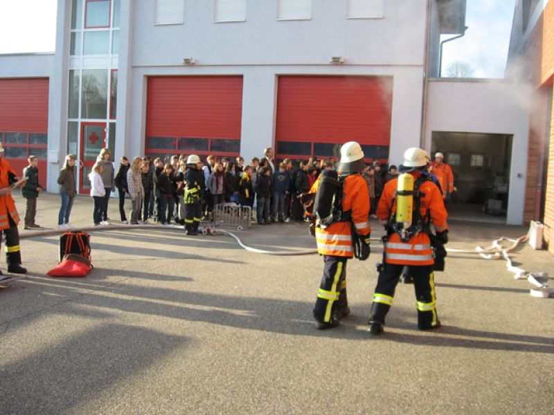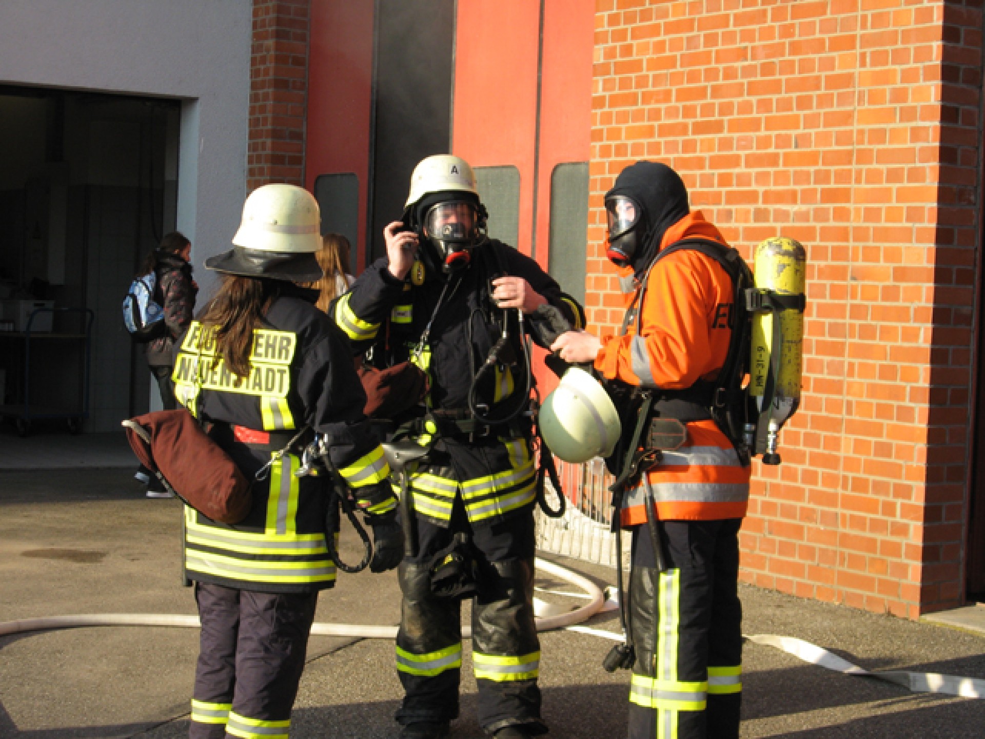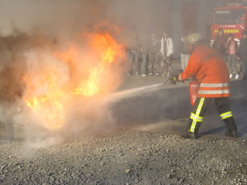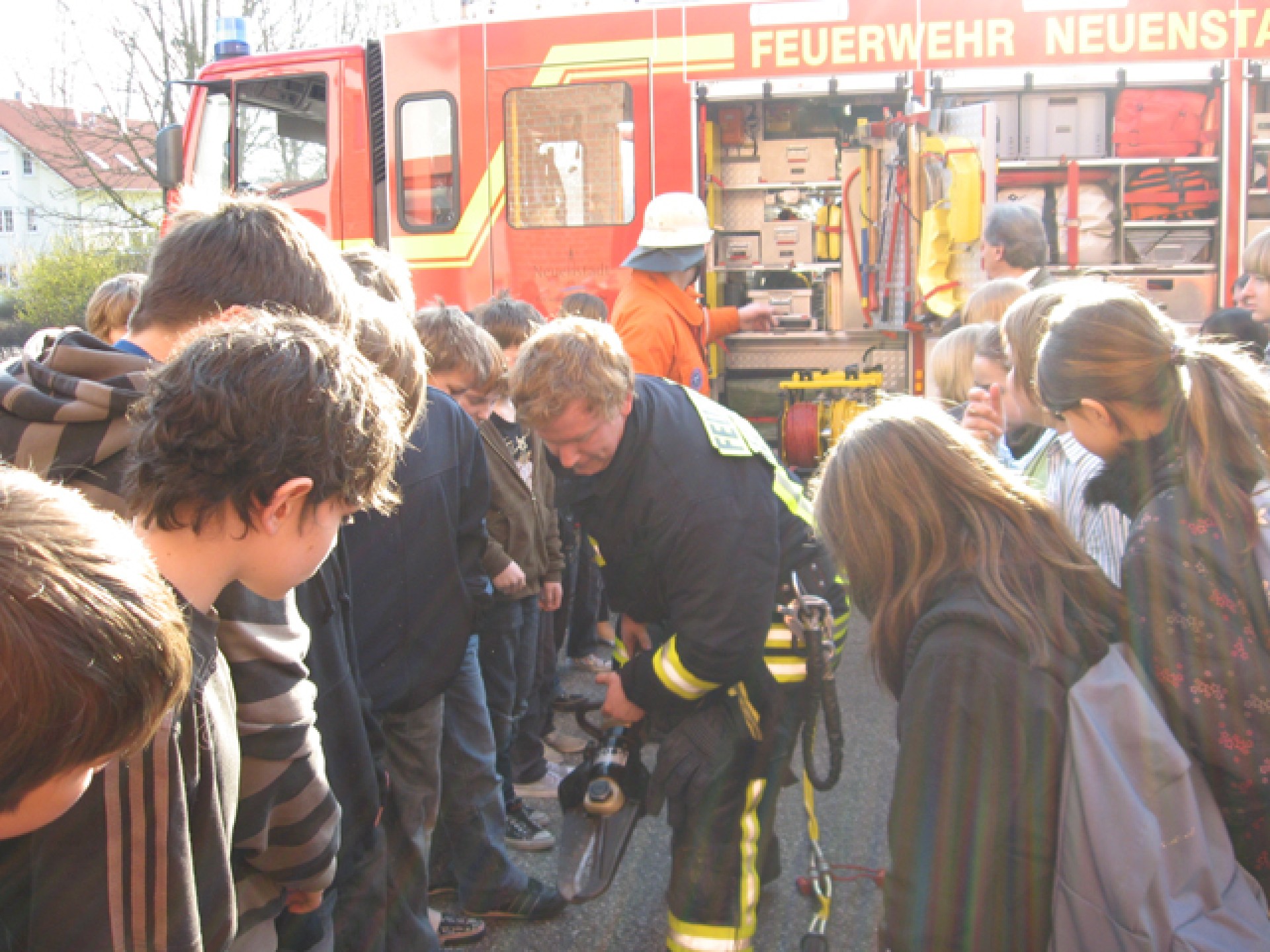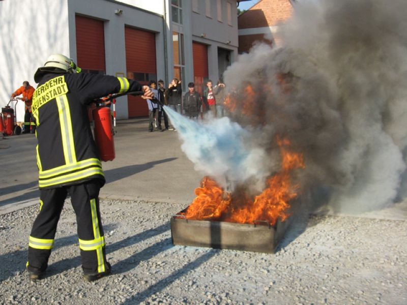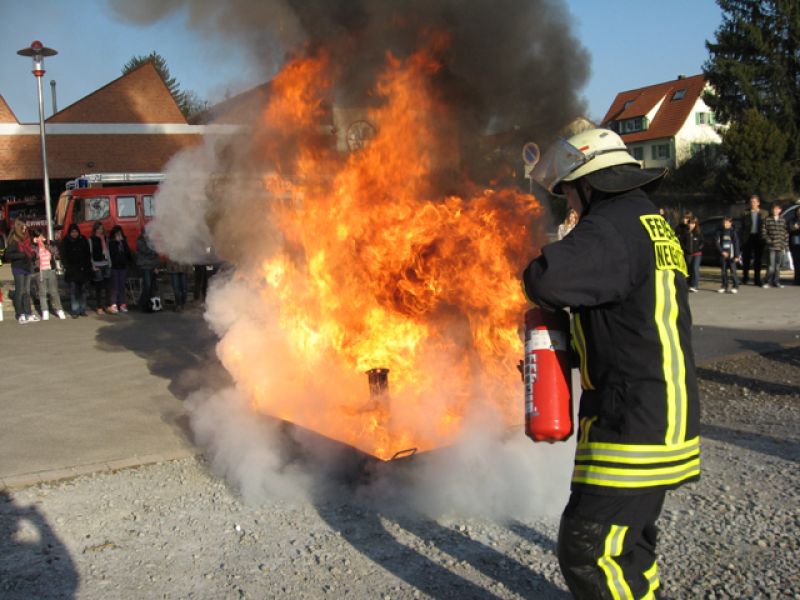Ein lauter Knall erweckt die Umgebung, im Hof der Feuerwehr schnellt eine Spraydose explosionsartig in die Luft. Ein Unfall? Nein. Am dritten April führte die Feuerwehr im Rahmen der jährlichen Brandschutzerziehungen wieder eine Unterweisung für die Realschule Neuenstadt durch. Hierbei wurde unter anderem auch die Verpuffung einer Spraydose unter Wärmeeinwirkung demonstriert. Den Kindern wurden professionelle Löschangriffe durch die Feuerwehr vorgeführt, weiterhin wurde die fachgerechte Anwendung kommerzieller Löschmethoden (Feuerlöscher, Löschdecke, etc.) gezeigt. Höhepunkte des Tages waren sicherlich die Fettexplosionen mit ihren meterhohen Flammen sowie die Darbietungen eines Feuerlöscher-Einsatzes bei einem Benzinbrand, bei welchem die Flammen wahrhaftig wild um sich schlugen. Mit dem Löschgruppenfahrzeug der Abteilung Stein/Kochertürn wurde weiterhin ein Schaumteppich produziert sowie ein brennender Holzstapel durch den Einsatz der Feuerwehr gelöscht. Eine Menschenrettung unter schwerem Atemschutz in der vernebelten Waschhalle hat den Kindern deutlich eingeprägt, wie gefährlich und sichtbehindernd Brandrauch sein kann. Aufgrund des großen Interesses der Kinder wurde ihnen auch die gewaltige Kraft des hydraulischen Rettungssatz des neuen Hilfeleistungslöschfahrzeuges, sowie der Sprungretter, welcher zur Personenrettung bis zu einer Höhe von 16 Metern dient, gezeigt. Begeistert verließen die Kinder gegen Mittag wieder das Gelände der Feuerwehr.