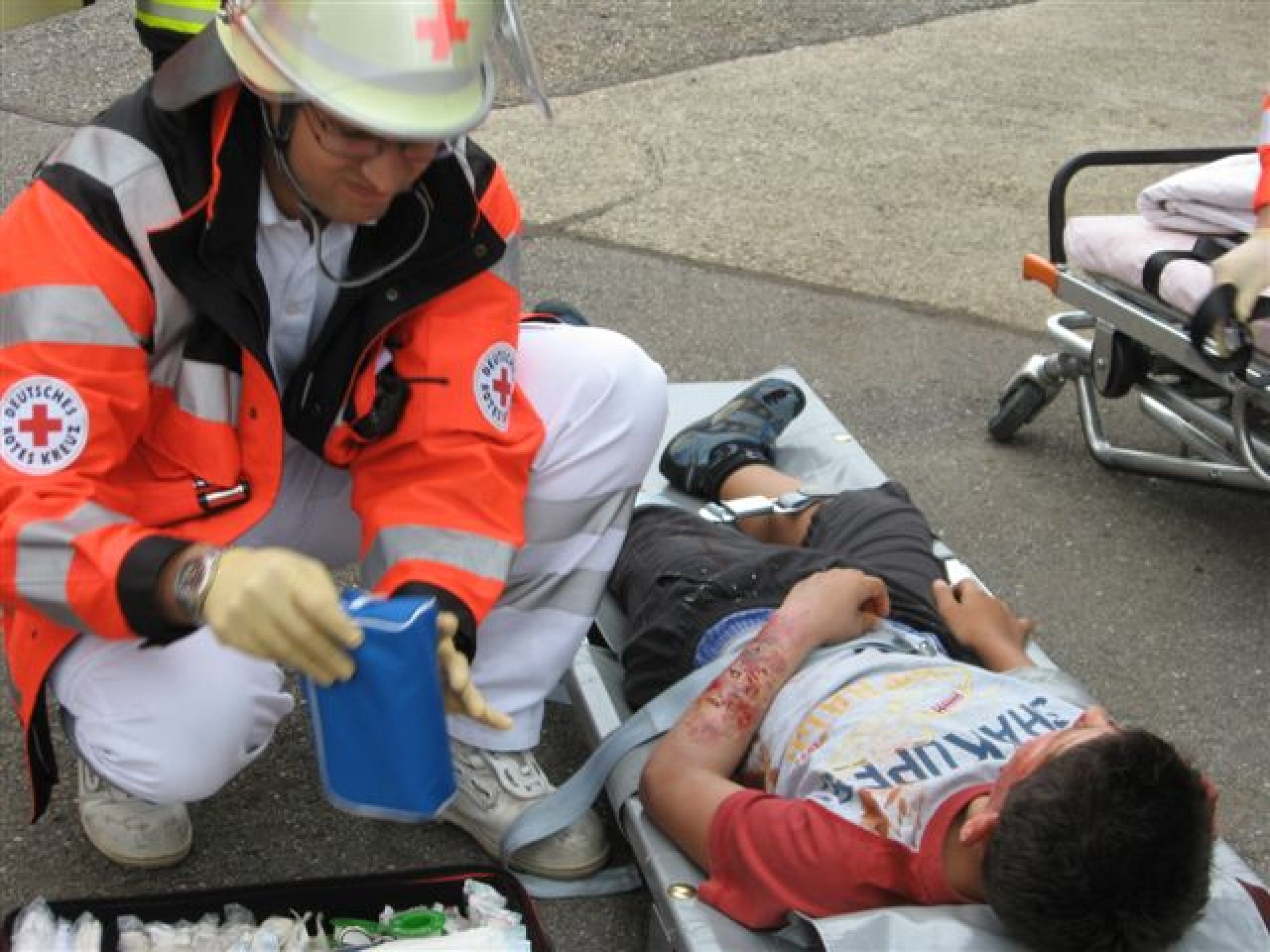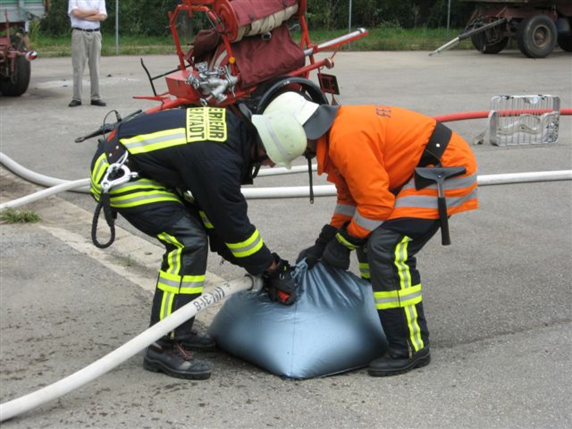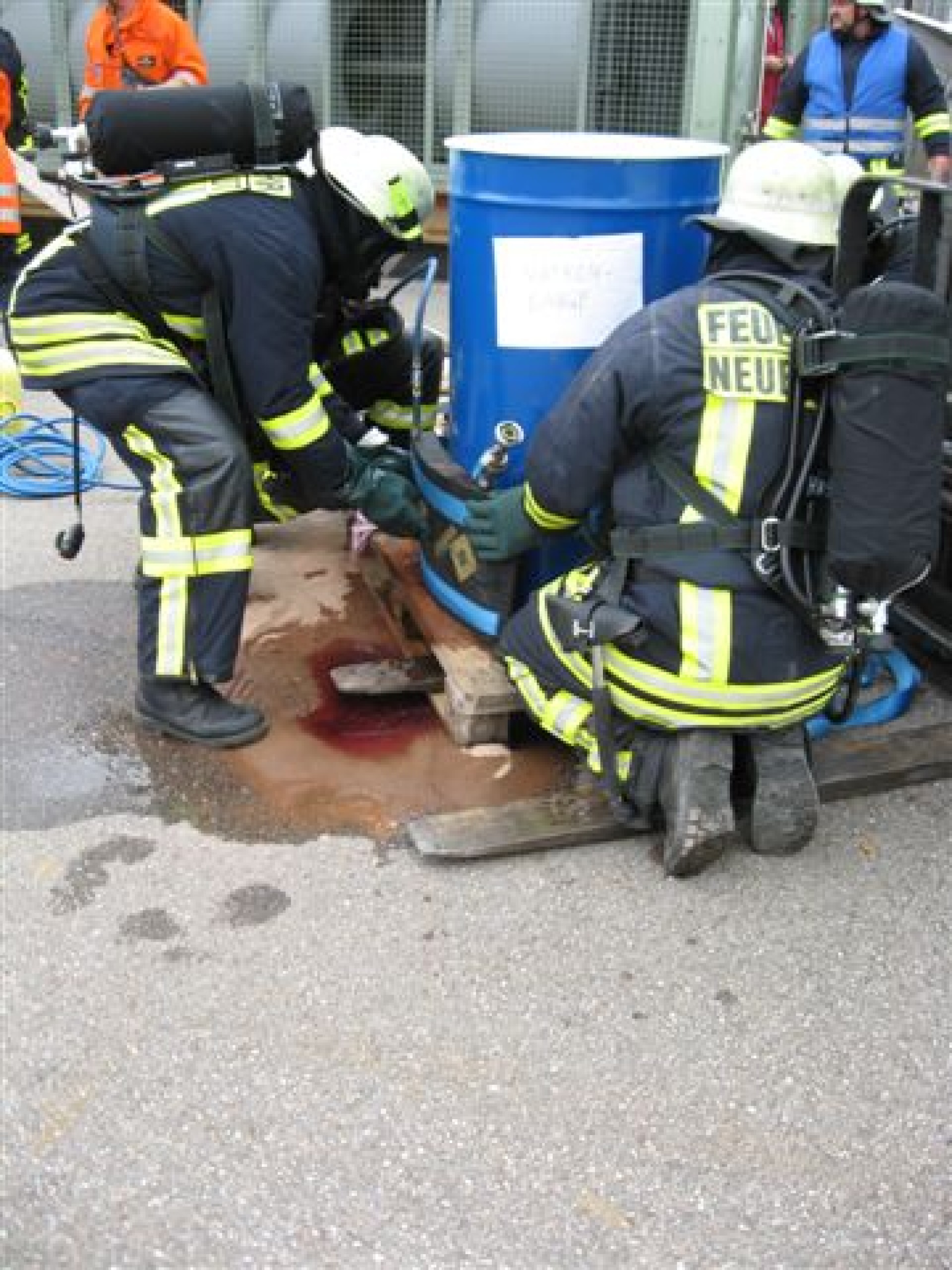 Die Abteilung Neuenstadt widmete sich nach dem Eintreffen dem verunglückten Staplerfahrer und dem auslaufenden Reinigungsmittel. Hier konnte mit dem Leckdichtsatz des Hilfeleistungslöschfahrzeuges rasch das Fass abgedichtet werden und der Fahrer außerhalb des Gefahrenbereichs gebracht werden. Zum Schutz des in der nähe verlaufenden Kochers wurde die Kanalisation soweit abgedeckt, dass kein Reinigungsmittel hineingelangen konnte. Nachdem auch hier der Staplerfahrer an das DRK übergeben werden konnte „Feuer schwarz“ gegeben werden, damit war die Übung beendet.