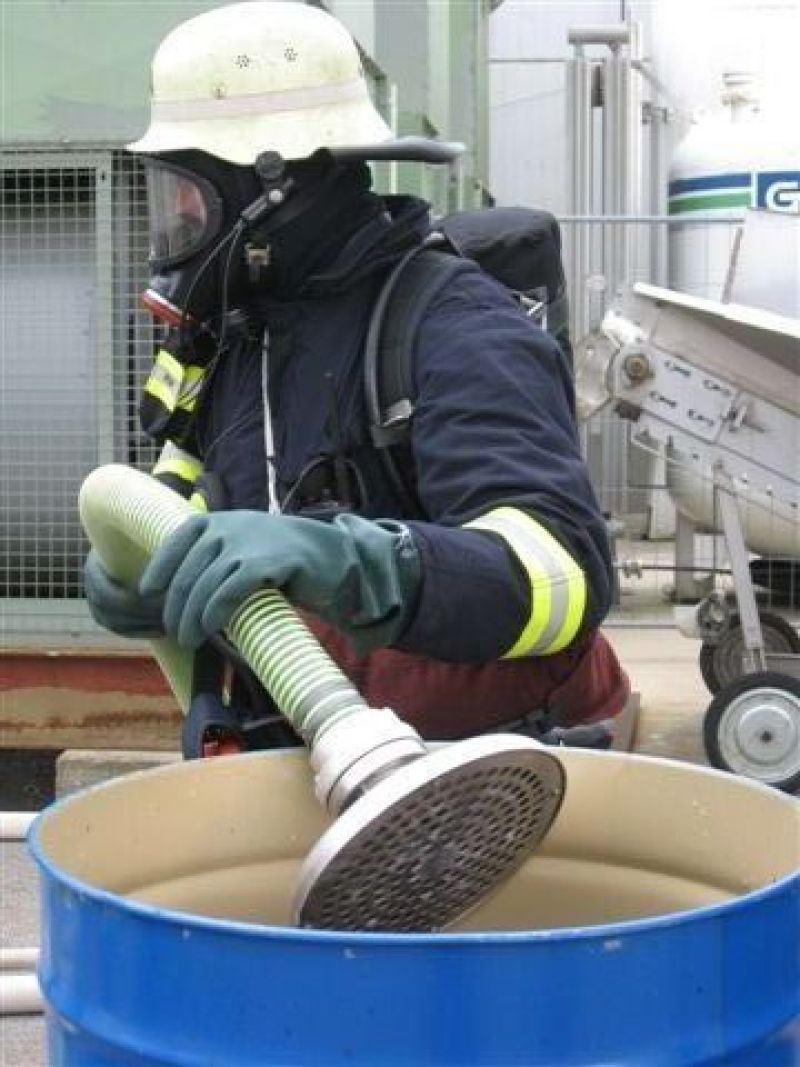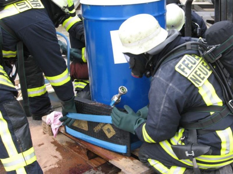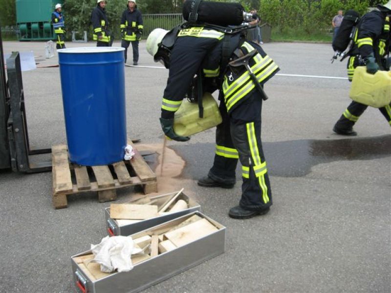 Der Brand war durch Schweißarbeiten in der Montagehalle direkt neben der Abfüllung ausgesprochen. In der Halle selbst waren zahlreiche Reinigungsmittel und Gasflaschen gelagert. Ein Mitarbeiter wollte geistesgegenwärtig noch ein Fass Reinigungsmittel mit einem Stapler in das Freie bringen. Hierbei begann das Fass zu kippen, der Arbeiter versuchte noch dies zu stoppen. Hierbei wurde er jedoch vom Fass überrollt und die Reinigungsmittel ergossen sich über seine Arme und Beine. Hier bestand nun auch die Gefahr, dass Reinigungsmittel in die Kanalisation gelangen konnte.