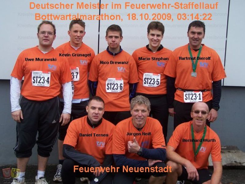 Die Mannschaft der Feuerwehr Neuenstadt am Kocher hat beim Bottwartal-Marathon am 18.10.2009 in der Marathonstaffel einen hervorragenden fünften Platz in der Gesamtwertung belegt und wurde somit deutscher Feuerwehrmeister im Marathon-Staffellauf! Besonders erfreulich ist, dass die Mannschaft aus Teilnehmern aller Abteilungen bestand. Dies zeigt wieder einmal deutlich den Zusammenhalt und die körperliche Fitness der Neuenstädter Feuerwehr.