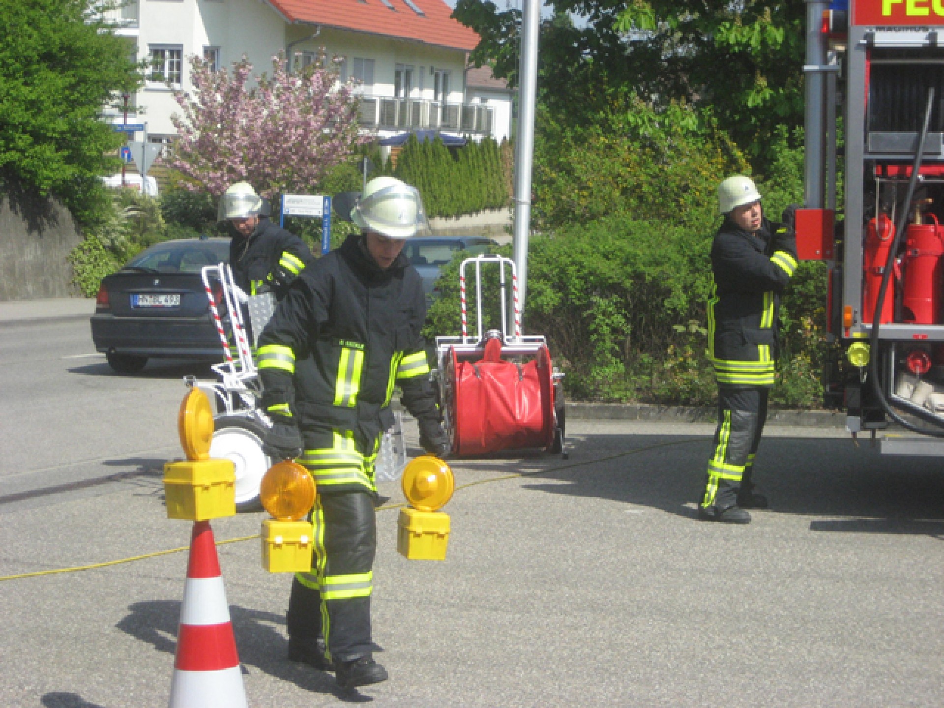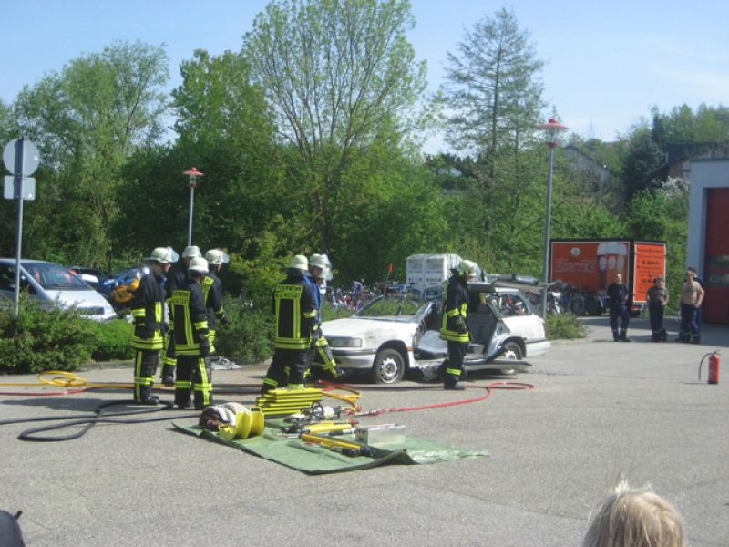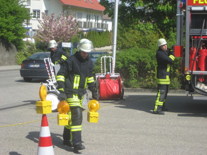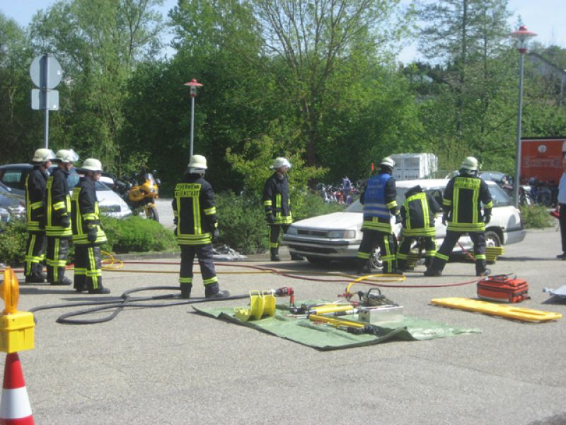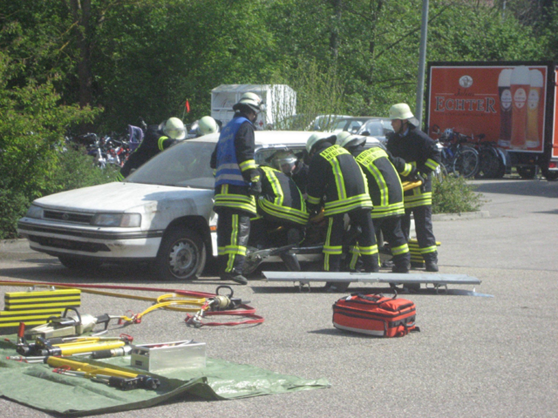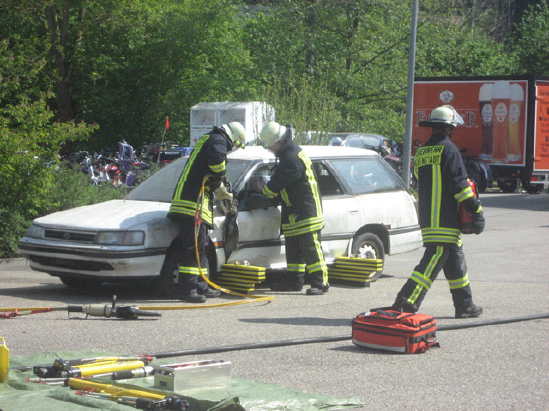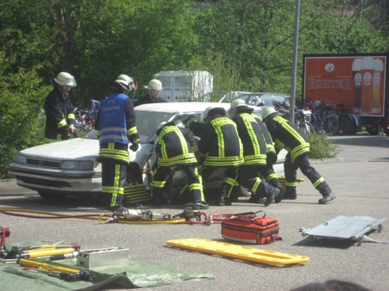 Am Sonntag Mittag des Feuerwehrfestes führte die Feuerwehr Neuenstadt wieder eine Schauübung zum Thema Menschenrettung nach Verkehrsunfällen durch. Gezeigt wurde ein kompletter Ablauf einer Rettung, von der Absicherung der Einsatzstelle bis zur medizinischen Erstversorgung des Verletzten. Die Übung wurde mit großem Interesse der Bevölkerung und lautstarkem Applaus beendet.