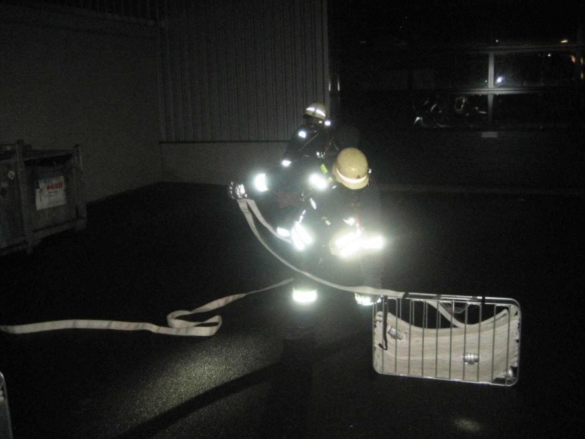 Zwei Mitarbeiter unternehmen auf Löschversuche mit Pulverlöschern, was aber keinen Erfolg bringt. Die Mitarbeiter erleiden eine Rauchvergiftung und starke Brandverletzungen. Sie können sich nicht mehr selbst aus dem Gebäude retten.