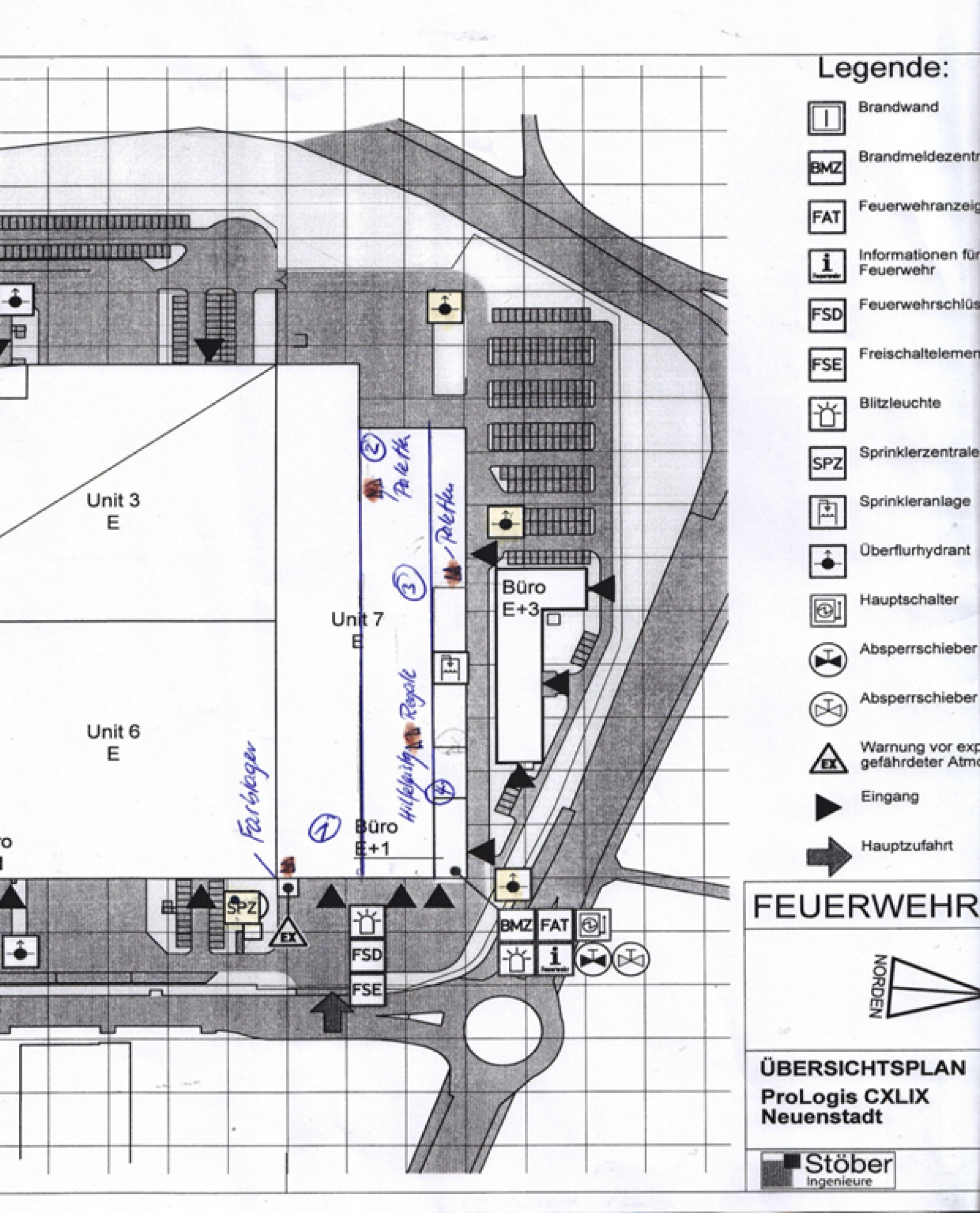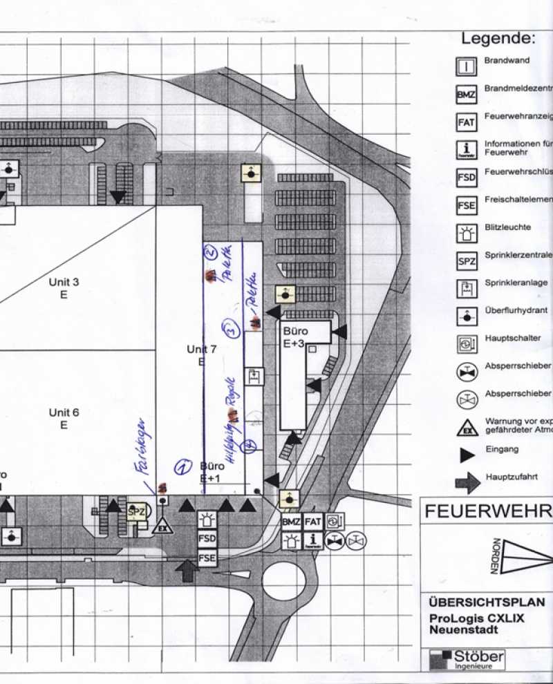 Unit 7 ist mit einer Brandwand F90 gegen die anderen Units abgetrennt. Alle Hallen sind mit Deckensprinkler und RWA ausgestattet.