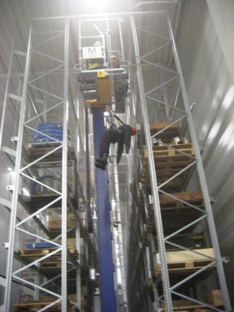 Im automatischen Hochregallager ist eine bewusstlose Person, die bei Brandausbruch Wartungsarbeiten auf dem Hubwagen in 10 m Höhe durchgeführt hatte.